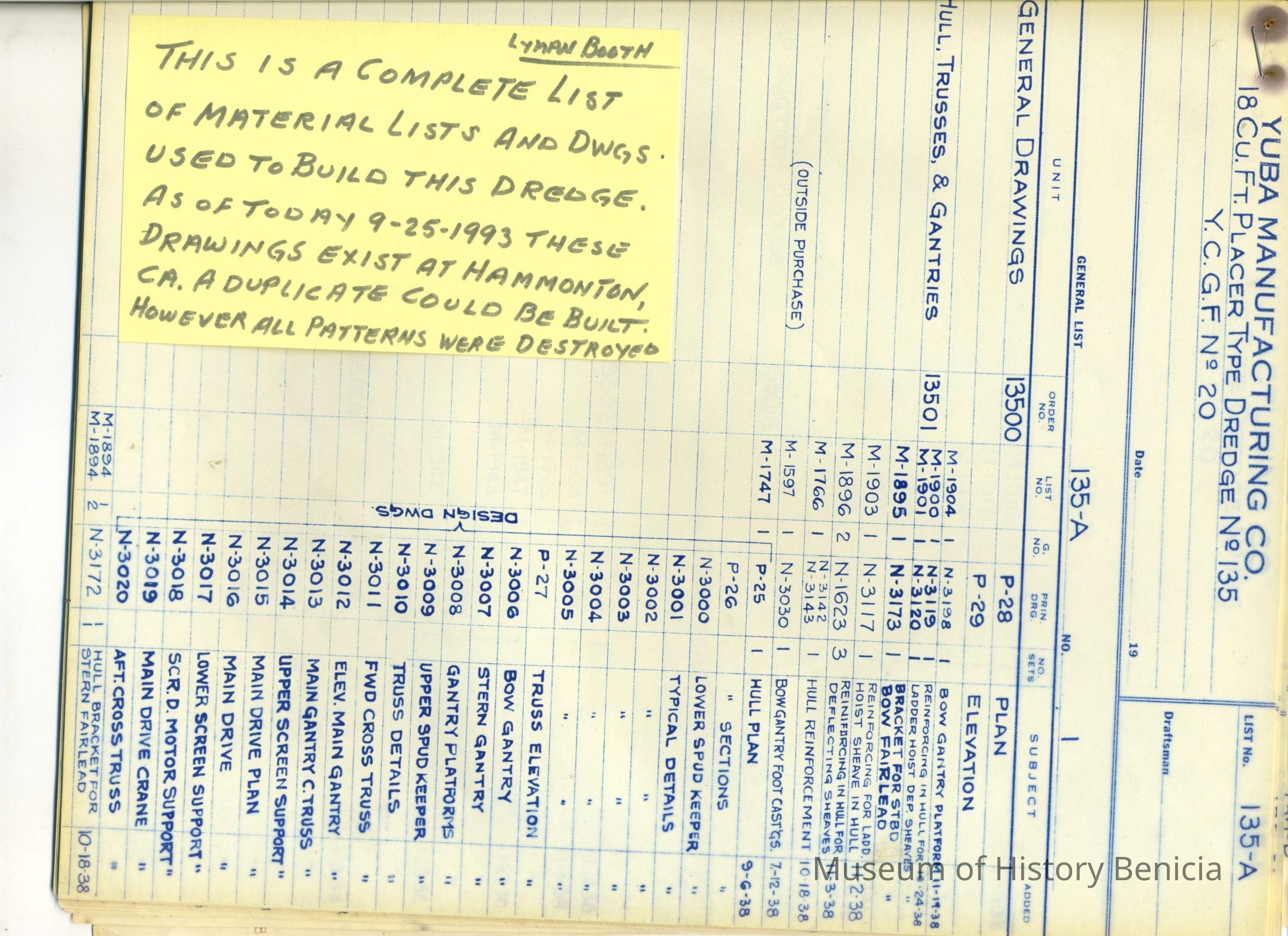 A complete list of the parts required for Yuba Manufacturing Co. Placer type dredg #135. (Yuba consolidated Gold Fields Dredge No. 202. Plans still exist at Hammonton- However, all patterns were distroyed.) 16 pagesCollection