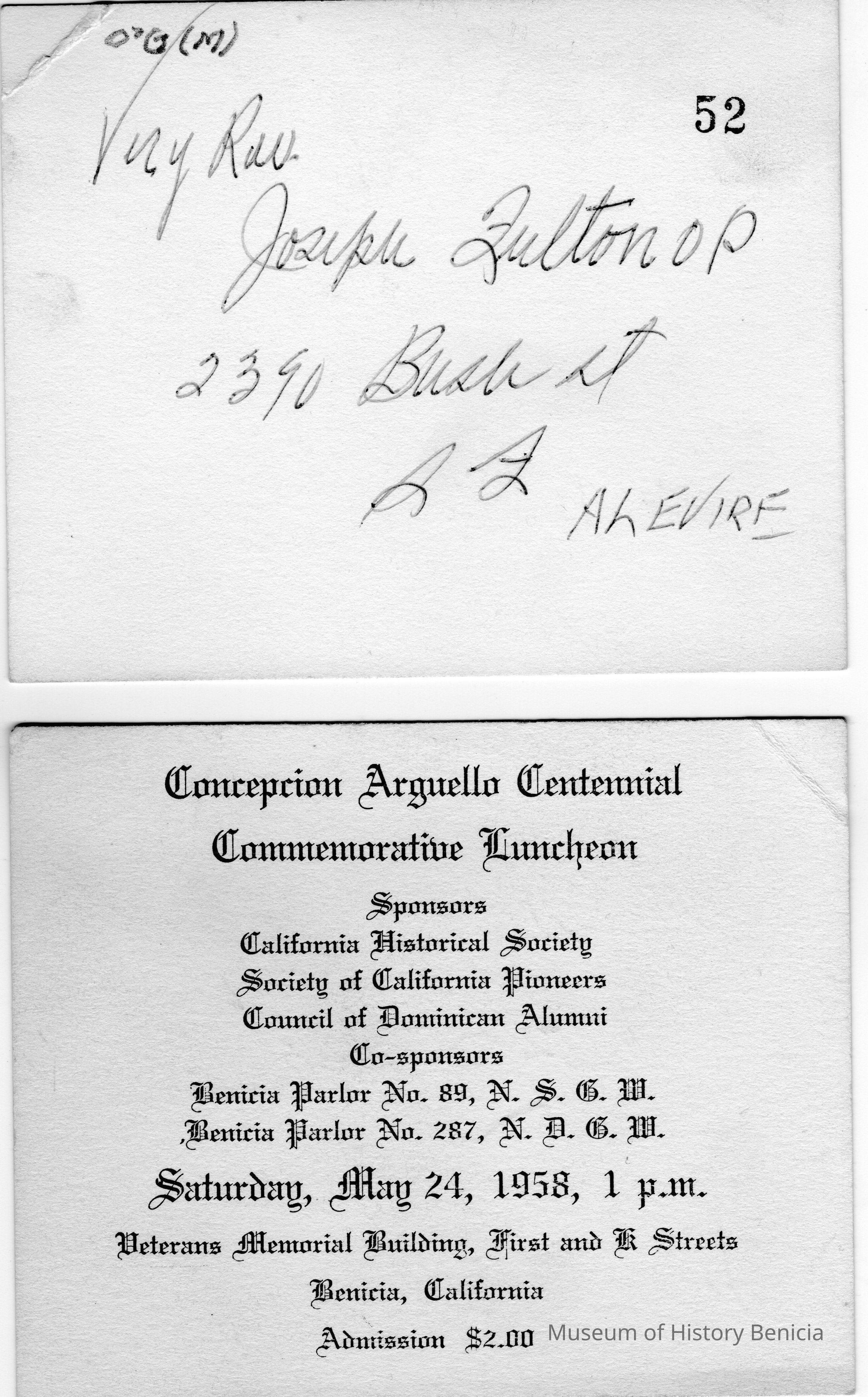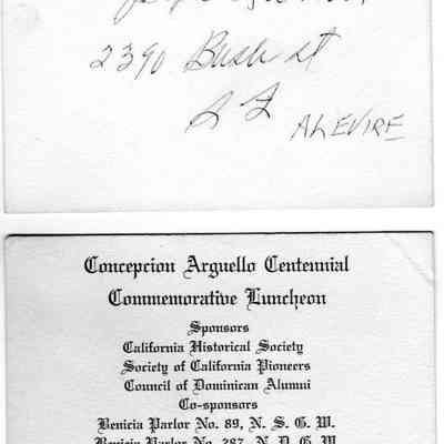 Invitation to Concepcion Arguello Centenial Commermative Luncheon 05/24/1958.