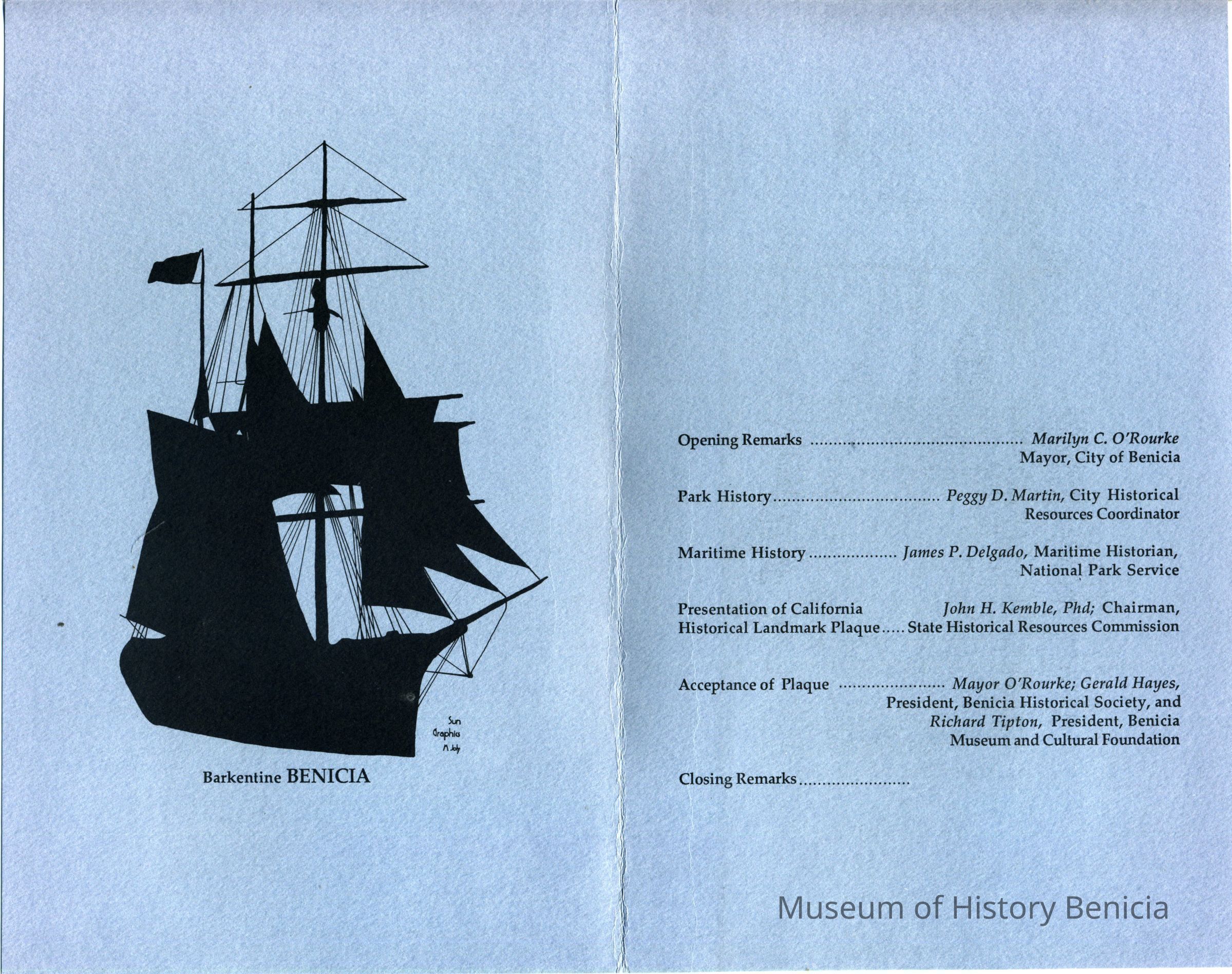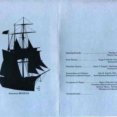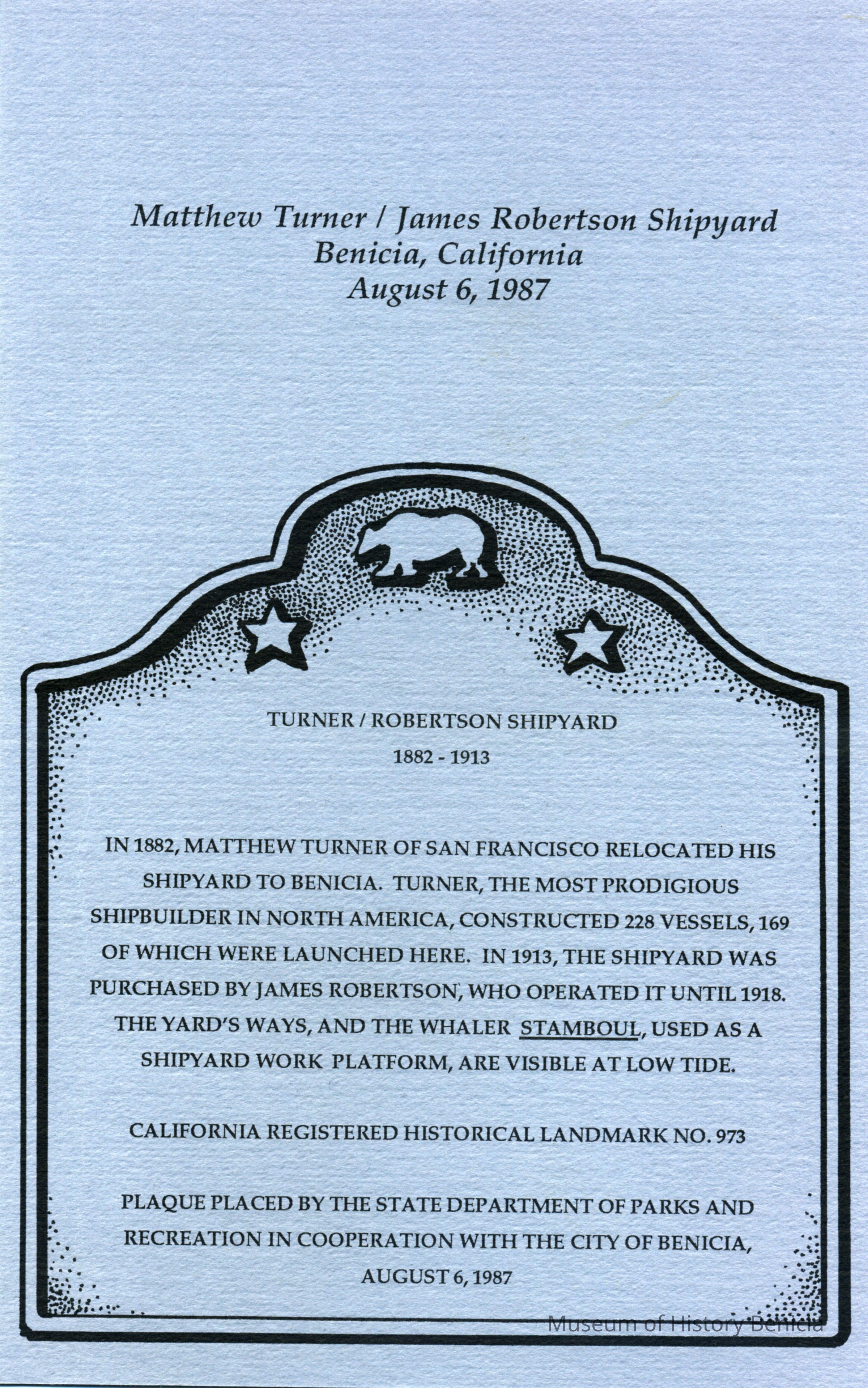 This is a commemorative card for the Turner and Robertson Shipyards in Benicia. It was made in 08/06/1987 to celebrate the installation of a historical plaque at the place where the shipyard was located. It talks of the period that this spot was the Turner shipyards (1882-1913) and when it was owned by Robertson (1913-1915).Collection