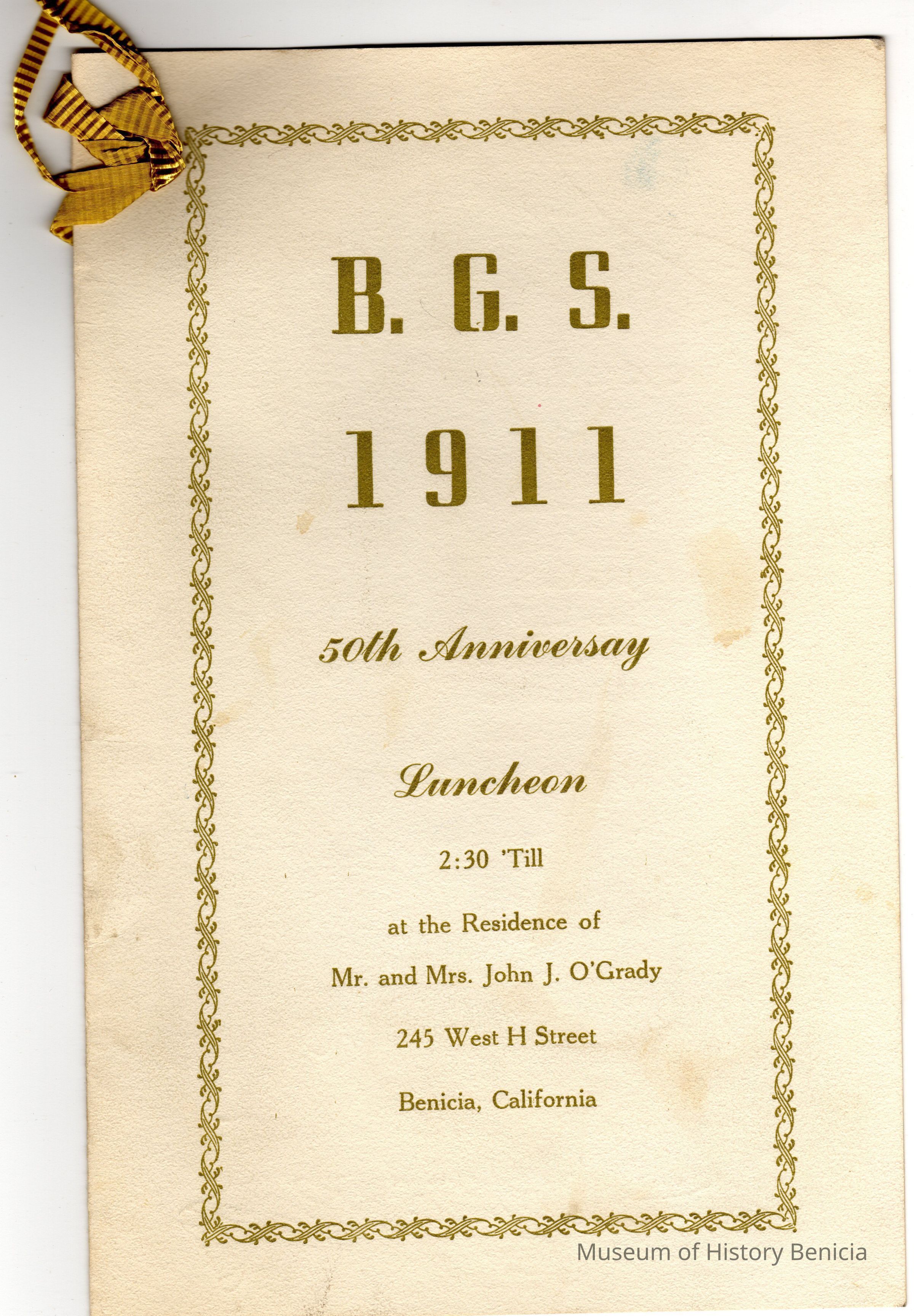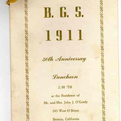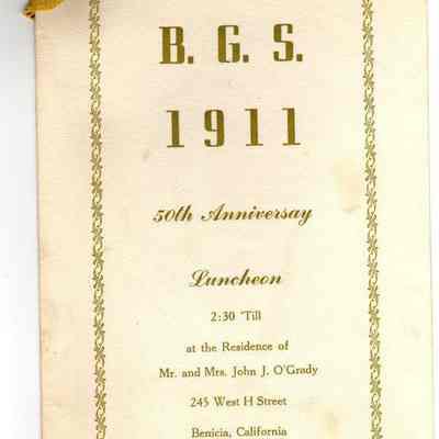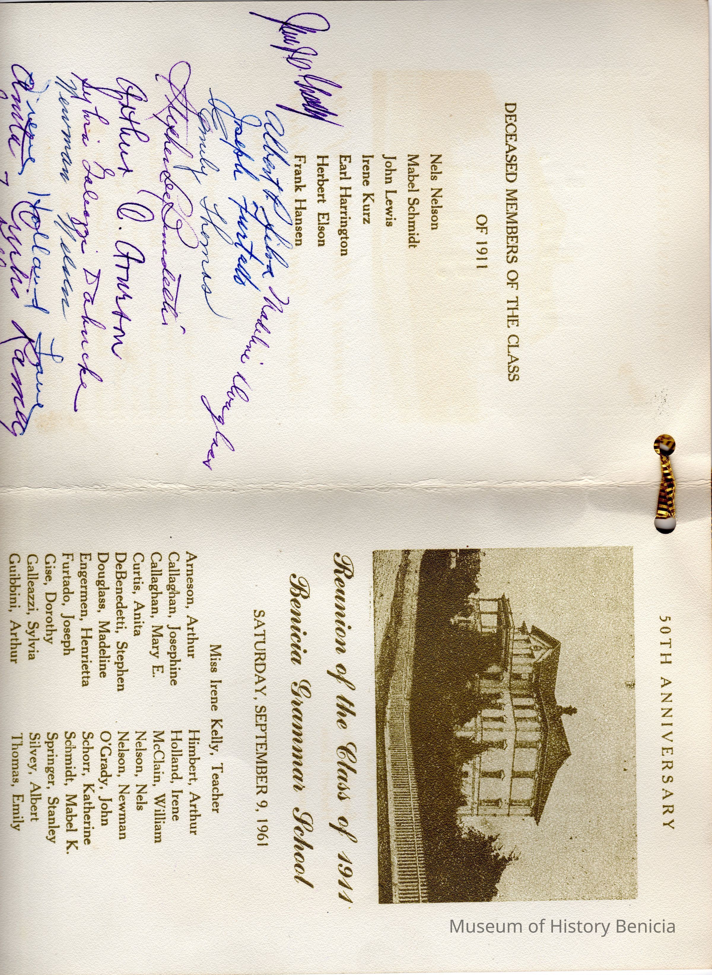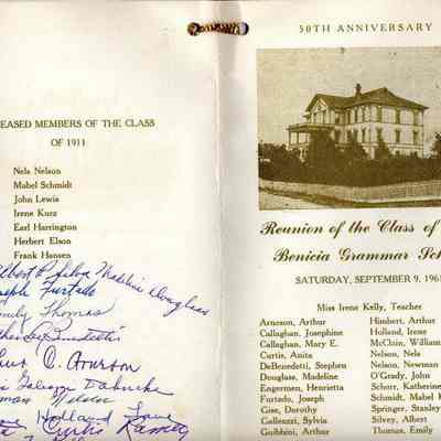 Program for the 50th anniversary luncheon of the Benicia Grade School class reunion of the 1911 class held in 1961. This program is signed by members of the class who attended the reunionCollection