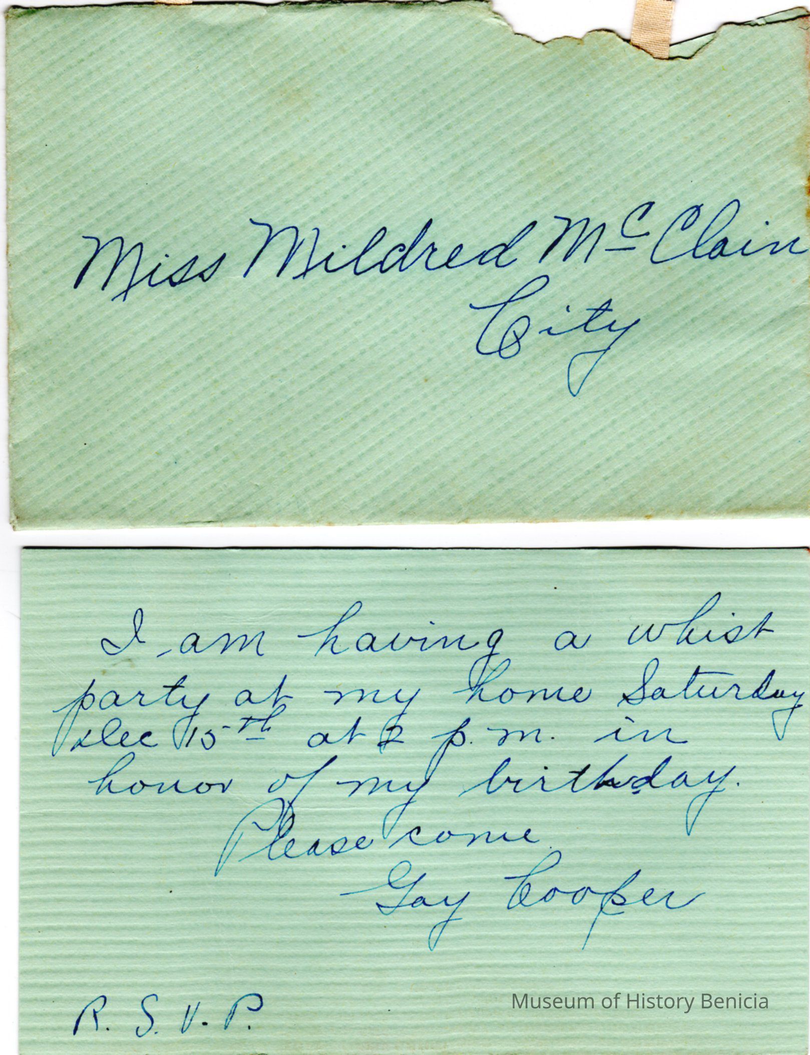 Invitation to a Whist party by Gay Cooper to Mildred McClain in 1928. This is part of the Class Record Book owned by Mildred McClain from Benicia, CA. The dates in the book point to a 1927/1928 time period.