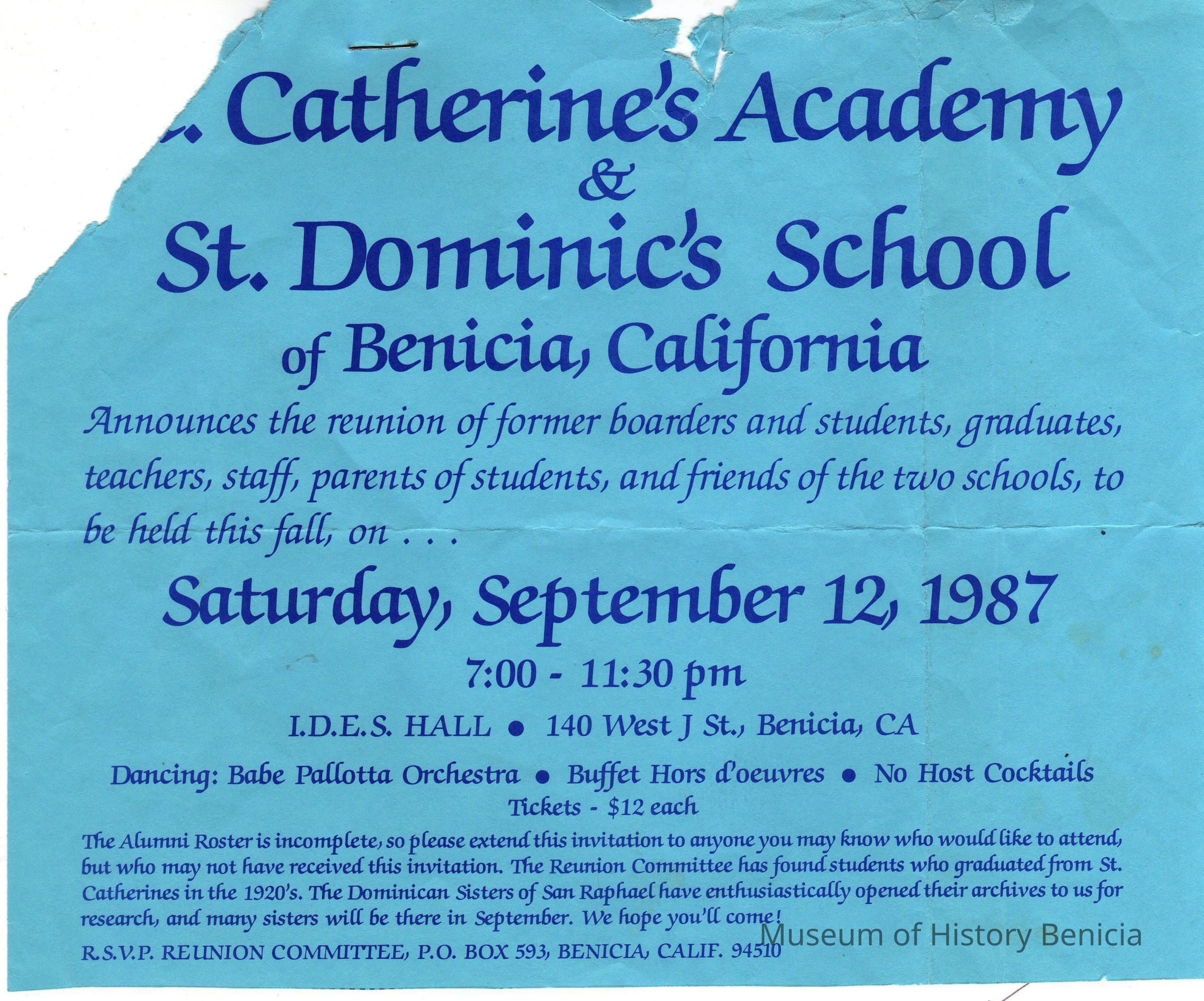 An invitation to a Reunion of students, graduates, teachers, staff, etc from St. Catherine's Academy and St. Dominic's School to be held on Saturday, September 12, 1987, from 7:00-11:30pm at the IDES Hall 140 West J St. Benicia
