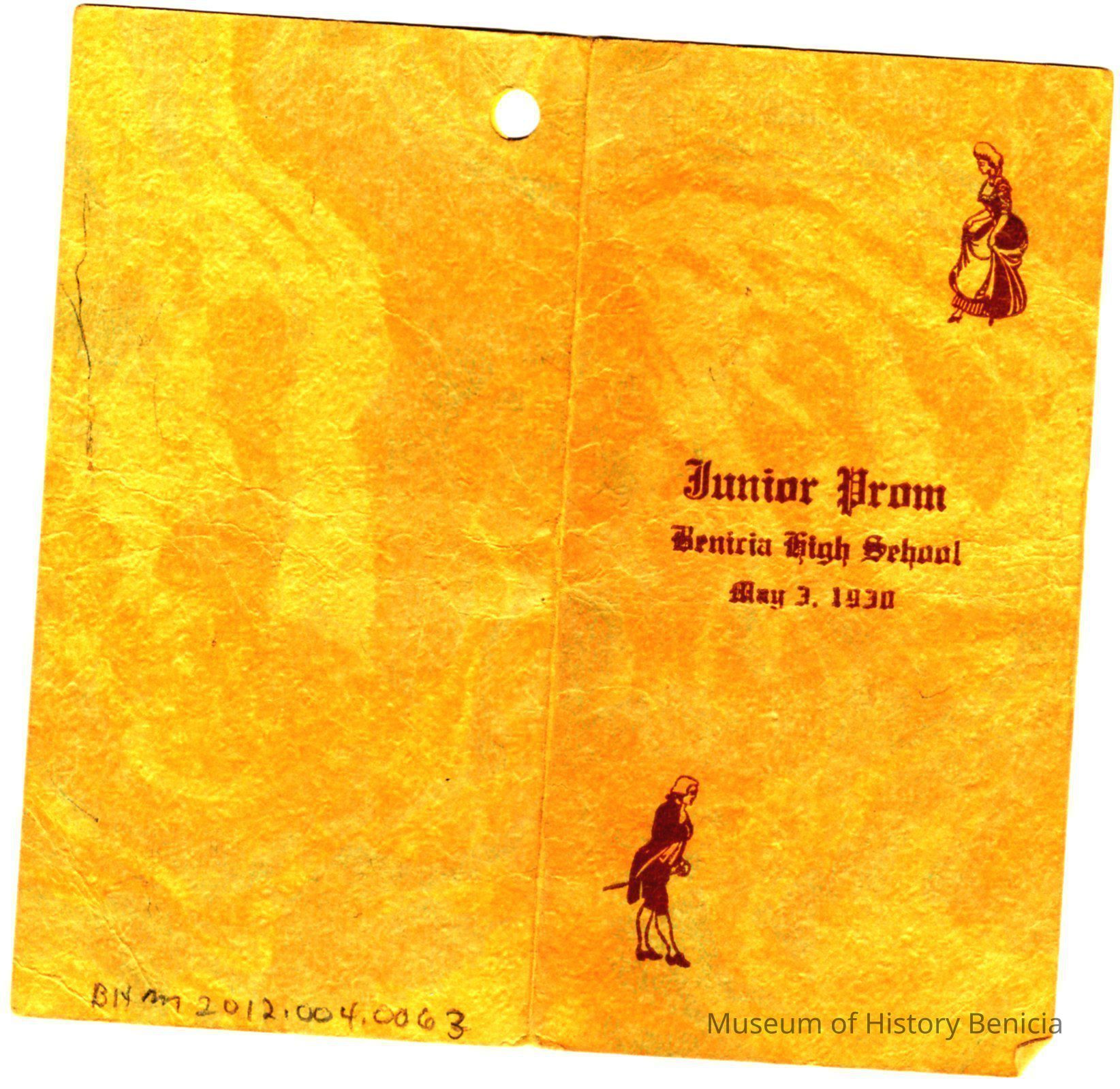 Junior Prom dance card for Benicia High School 05/03/1930. This is part of the Class Record Book owned by Mildred McClain from Benicia, CA. The dates in the book point to a 1927/1928 time period.
