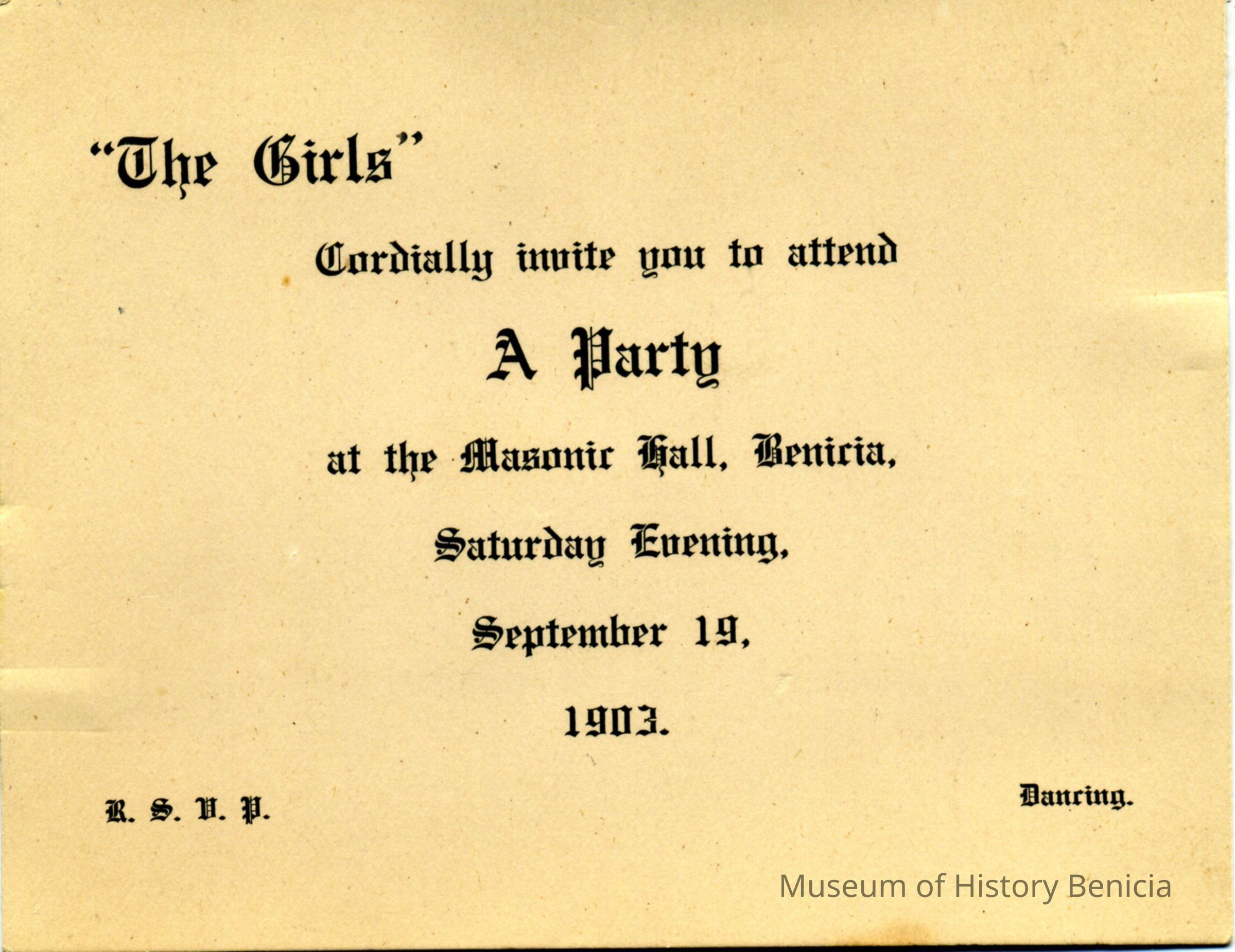 This is an invitation from "the Girls" to attend a party at the Masonic Hall on 09/19/1903, Not sure who the "Girls" are but there was to be dancing at the event.Collection