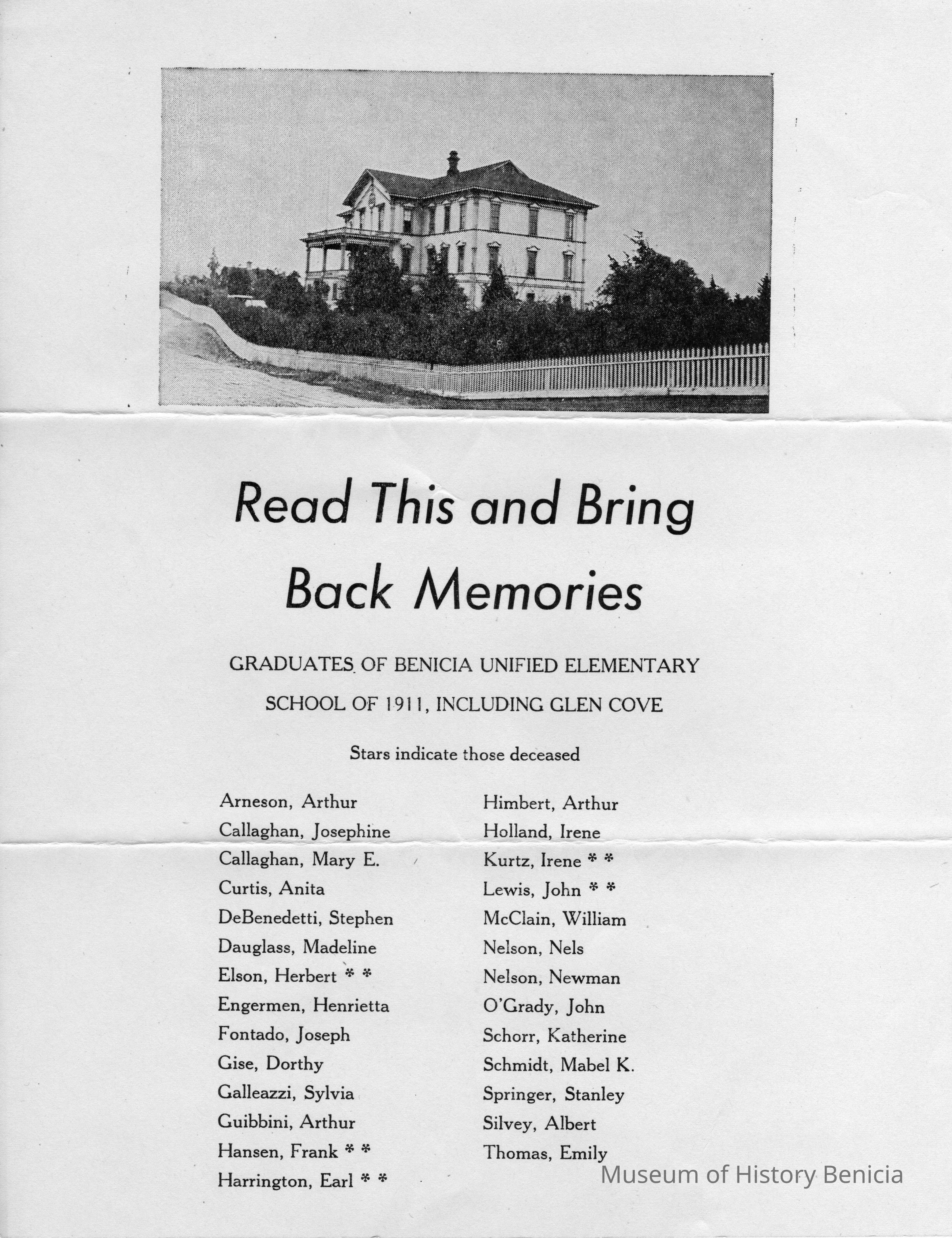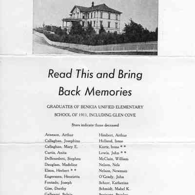 Announcement for the reunion of the Benicia Grade School class of 1911 held in 1955 (?). Two copies