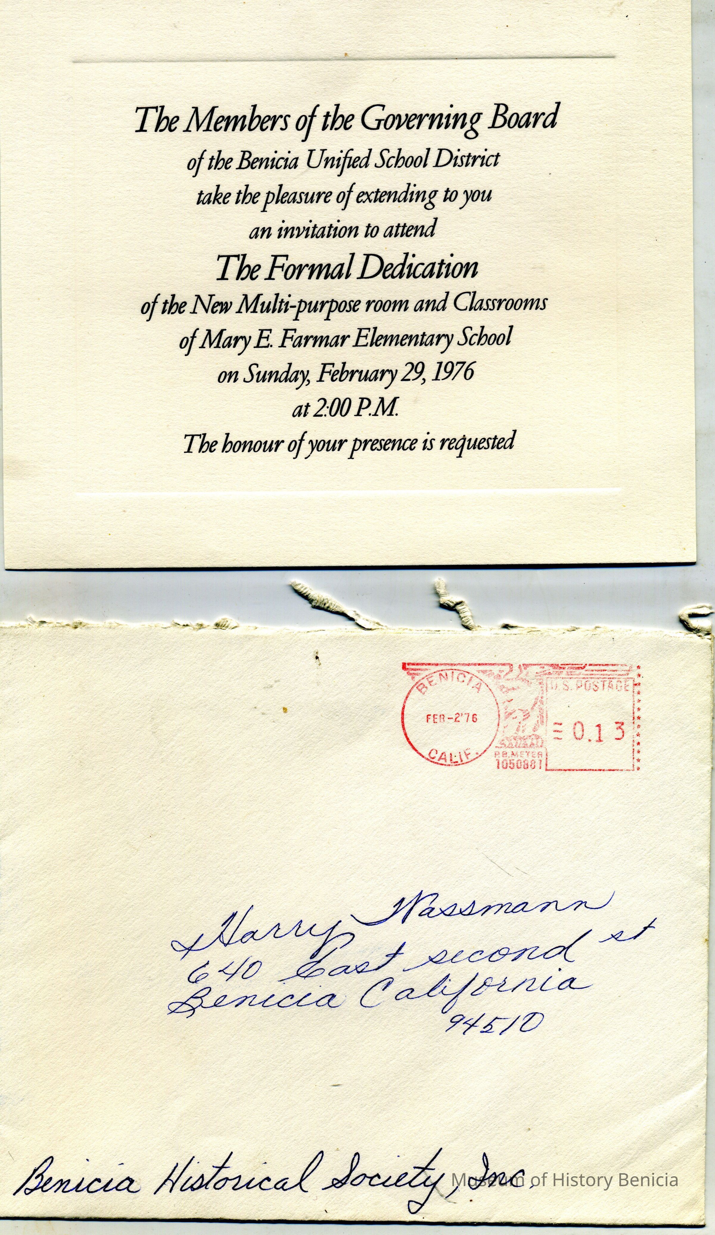 This is an invitation from the Benicia Unified School District to a "formal dedication" of the new classrooms at the Mary E. Farmar Elementary school on 02/29/1976.Collection