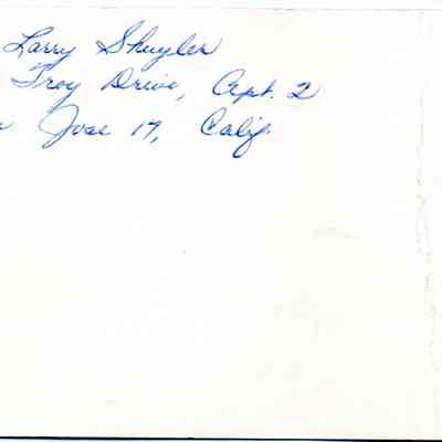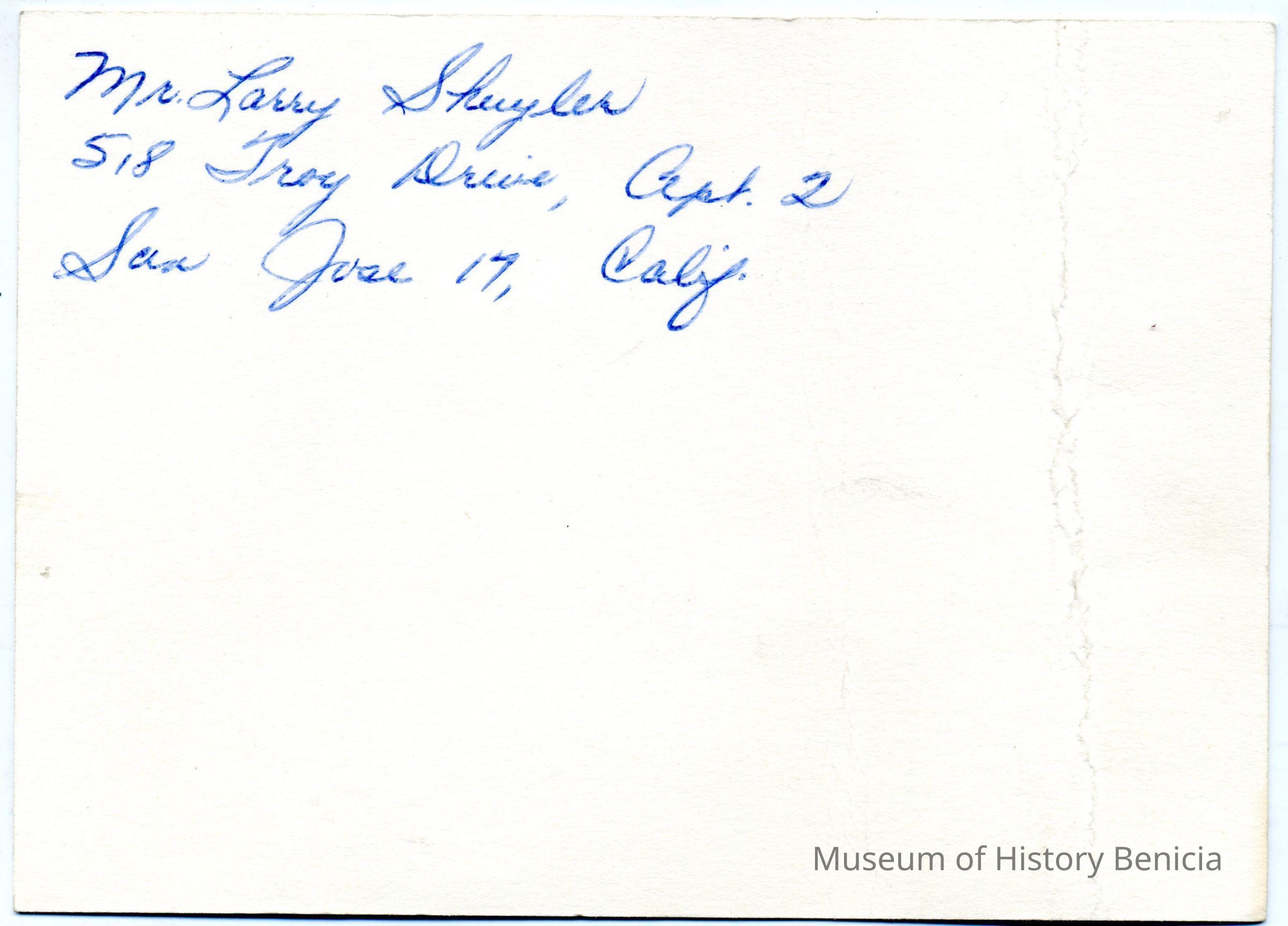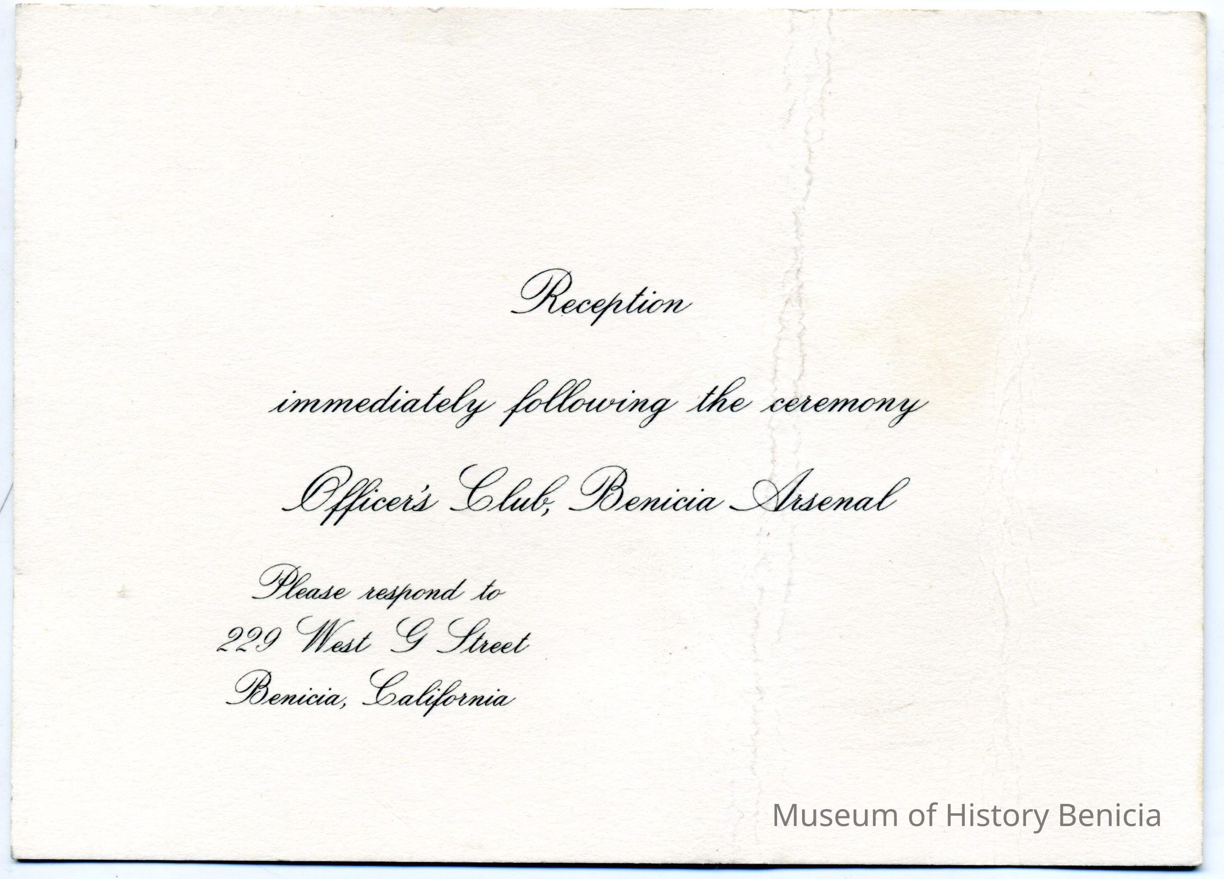 Invitation given to apprentice Larry Shuyler for reception after the apprentice graduation ceremony held at the Officer's Club, 223 West G Street, Benicia. 1962.Collection