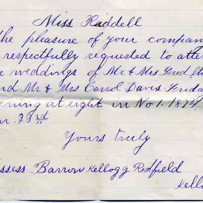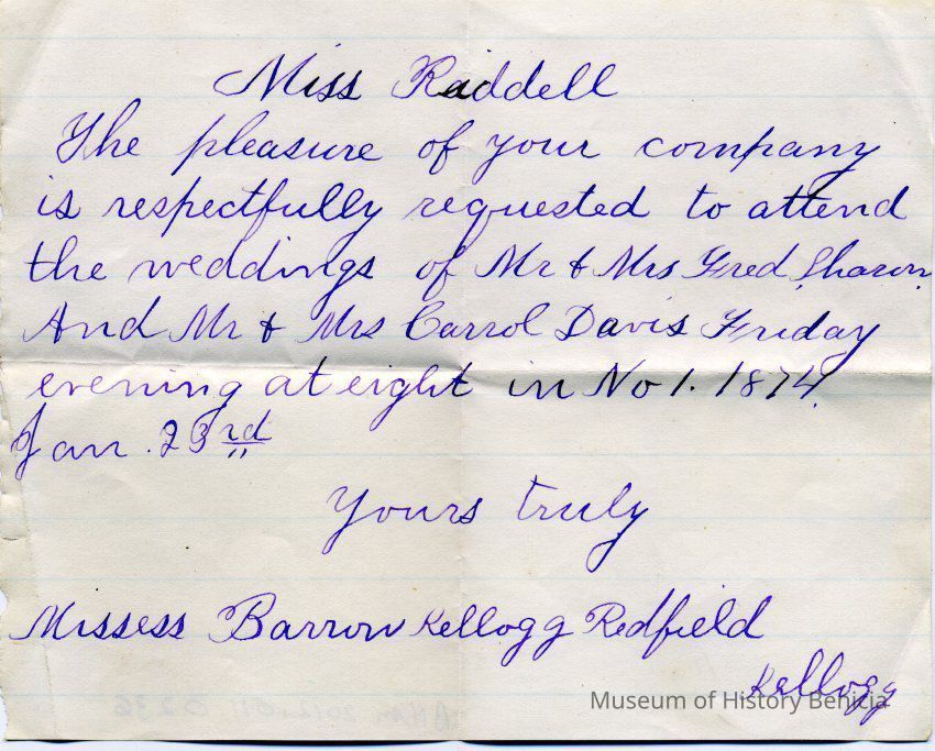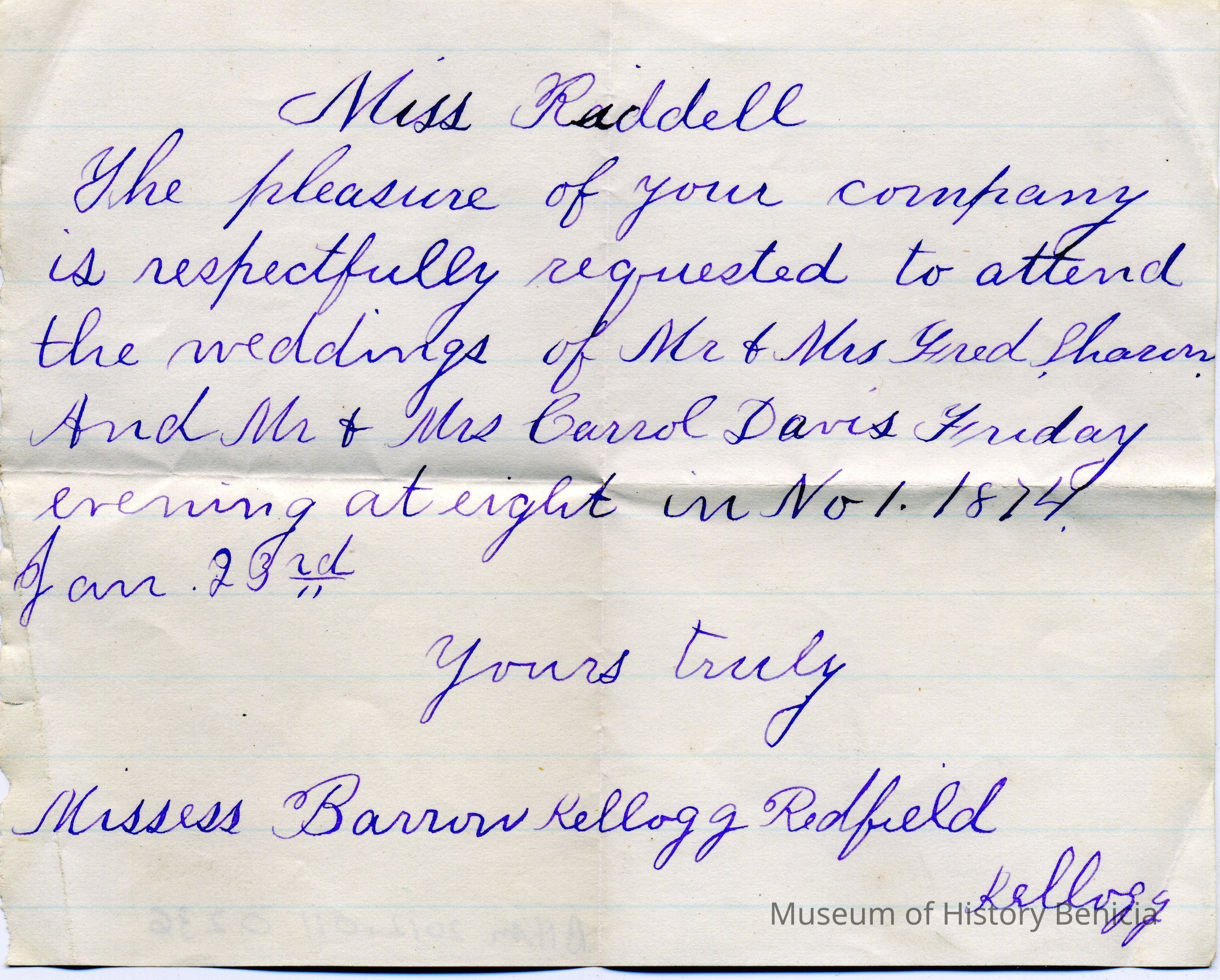 An invitation to Miss Riddell to attend a wedding of Mr & Mrs Fred Sharon and Mr & Mrs Carol Davis on Friday evening at eight in No. 1 1874 on Jan 23rd. It was sent by Missess Barron Kellogg Redfield and signed by Kellogg.Collection