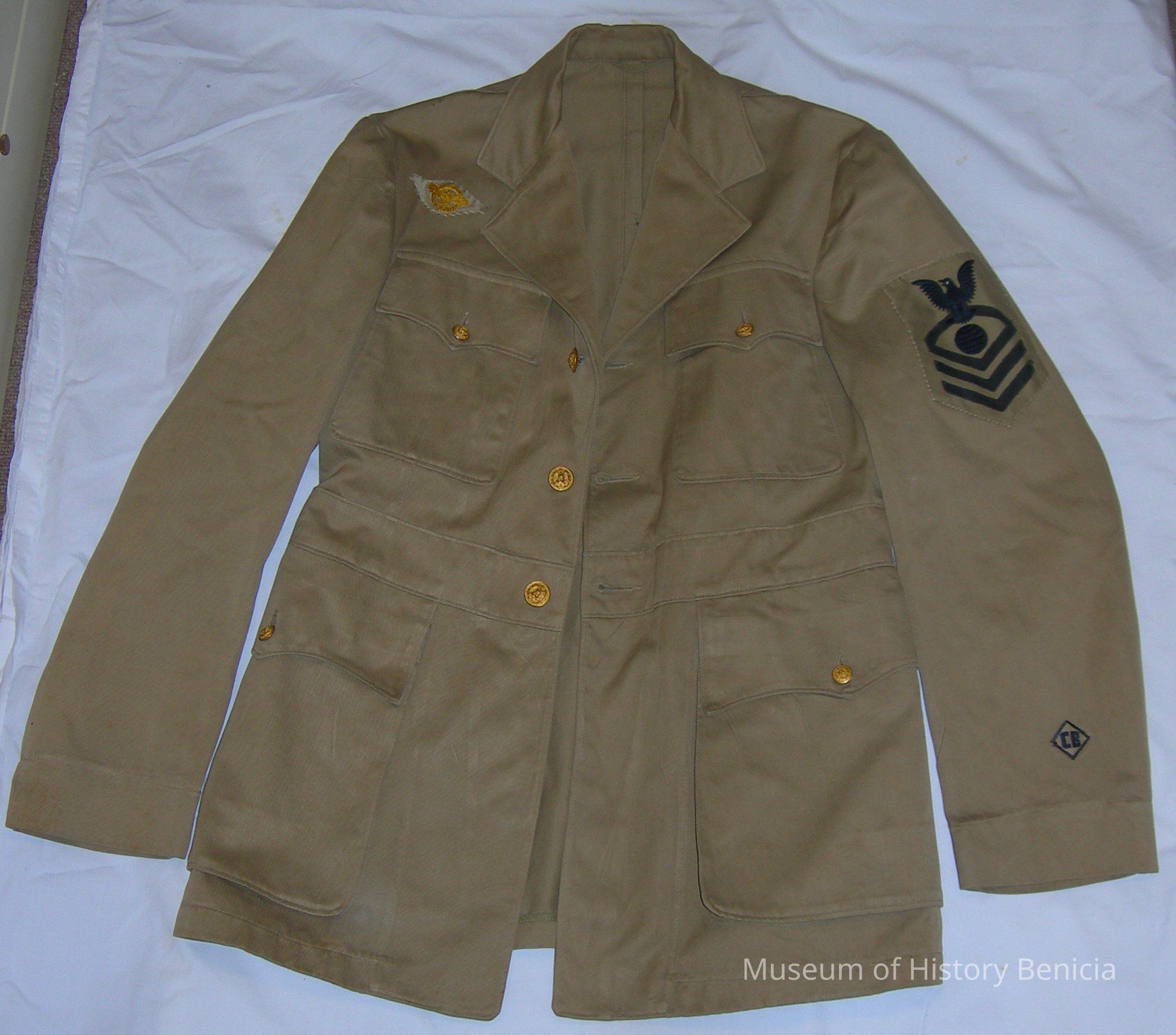WWII US Navy Jacket - outer part of a uniform of an Electrician's Mate, Chief Petty Officer (E-7) Construction Battalion (Seabees); On left shoulder is rating insignia in black on khaki with an eagle above a globe (the globe is the symbol for a Navy electrician), the chevrons and arc above them indicate Chief Petty Officer; the "CB" in a diamond shape on the lower sleeve stands for Construction Battalion or Seabees. On the upper right breast is the Honorable Discharge Emblem Lozenge sometimes referred to as the "ruptured duck" signifies that the sailor served honorably. It was worn by all servicemen, of all branches, when they were being discharged. They could wear their uniforms with the patch for up to thirty days after dischrge. It was authorized from September 1939 through December 1946. During World War II members of the armed forces were forbidden to possess civilian clothing unless so ordered. It made desertion harder and by rules they were to be treated as prisoners of war if captured and not spies.
