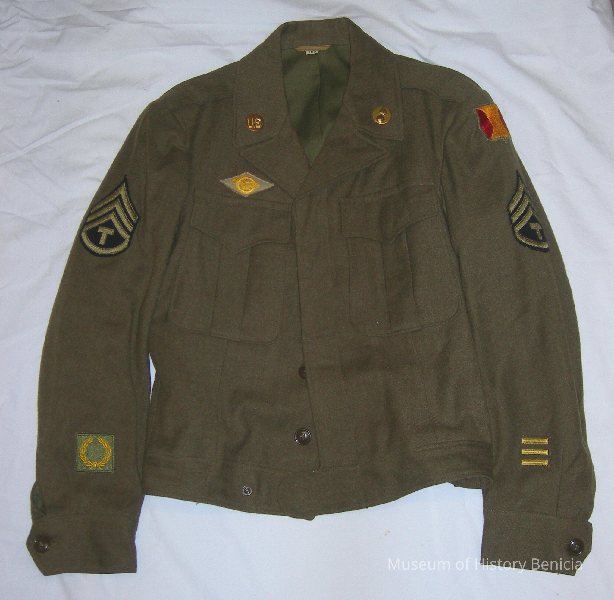 WWII US Army Field Jacket worn by a Techical Staff Sergeant in the Ordnance Department. The red and gold patch on the upper left sleeve indicates service in the Panama Canal Zone in WWII. The rating badge on both sleeves indicates the person is a Technical Sergeant. The three bars on the lower left sleeve represent nine years of service as the Army issues a bar or "hash mark" for each three years of service. The gold wreath on green patch on the lower right sleeve is an Army Meritorious Unit Citation.