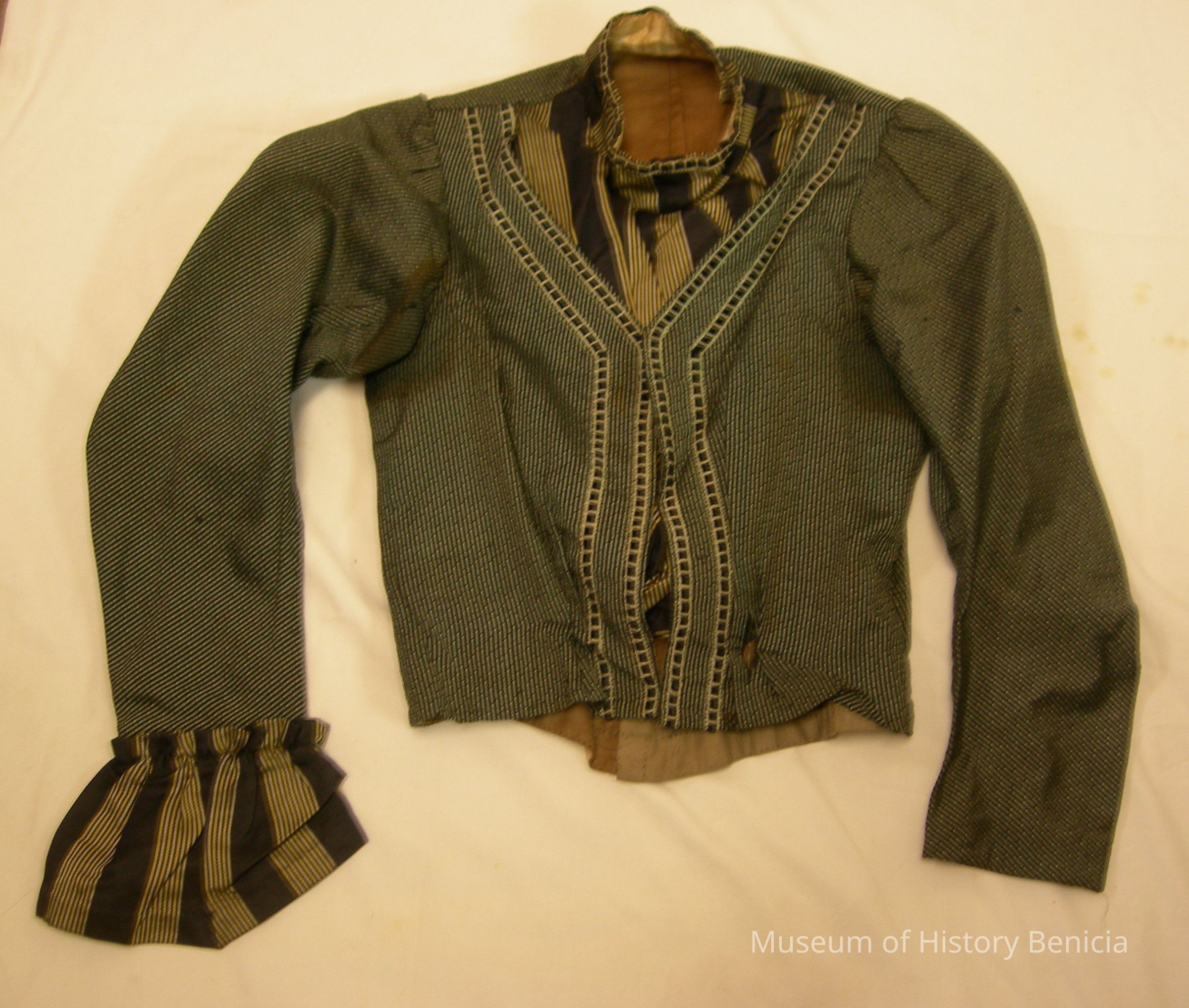 Jacket for a suit; goes with skirt (2018.005.0013); outer fabric is narrow black and silver stripes; has a two-piece look but is one piece; the contrasting striped "blouse" inset is only in the front and is attached with hook and eye closures; it gives the appearance of a blouse with a mock-turtle-neck collar; the fabric is wide black stripes with bands of narrow black/gray stripes between; the long sleeves have cuffs of the same material (the one on the left sleeve is missing); around the front closure and "V" neck is a band of black squares with gray between;