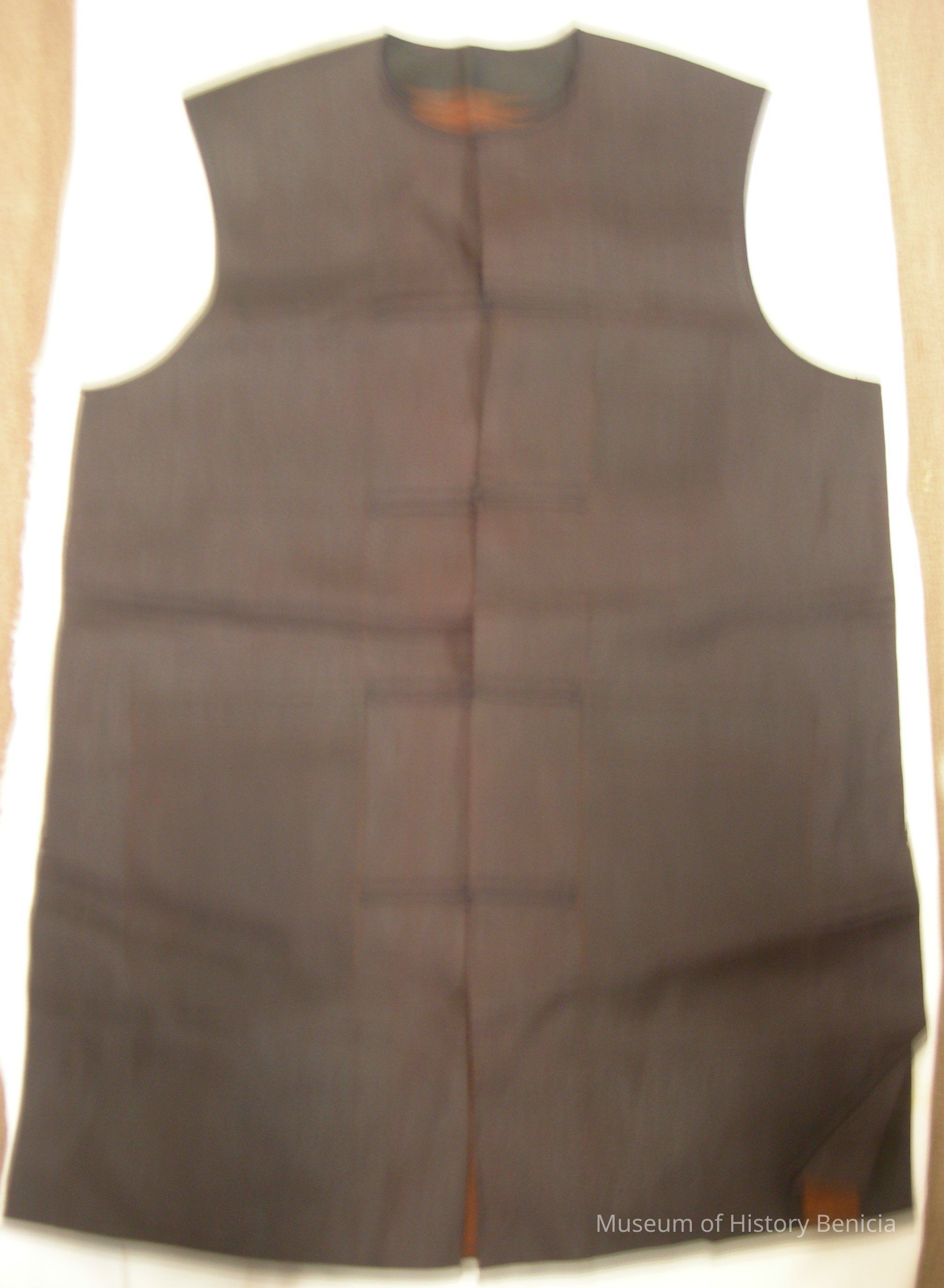 Jacket - sleeveless, Asian-style, dark brown with five loop and ball closures; rust colored inside; rough silk; one small pocket on left breast, two large ones each side at waist;