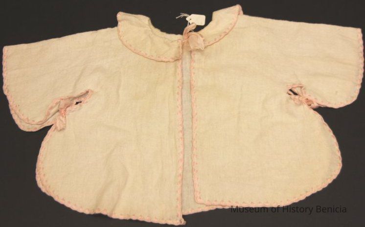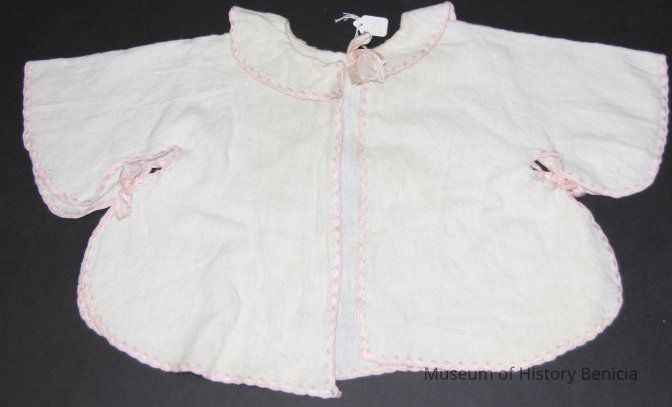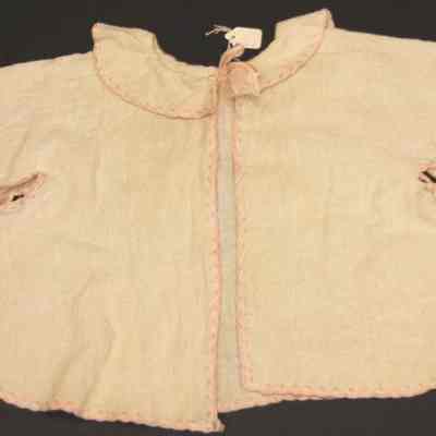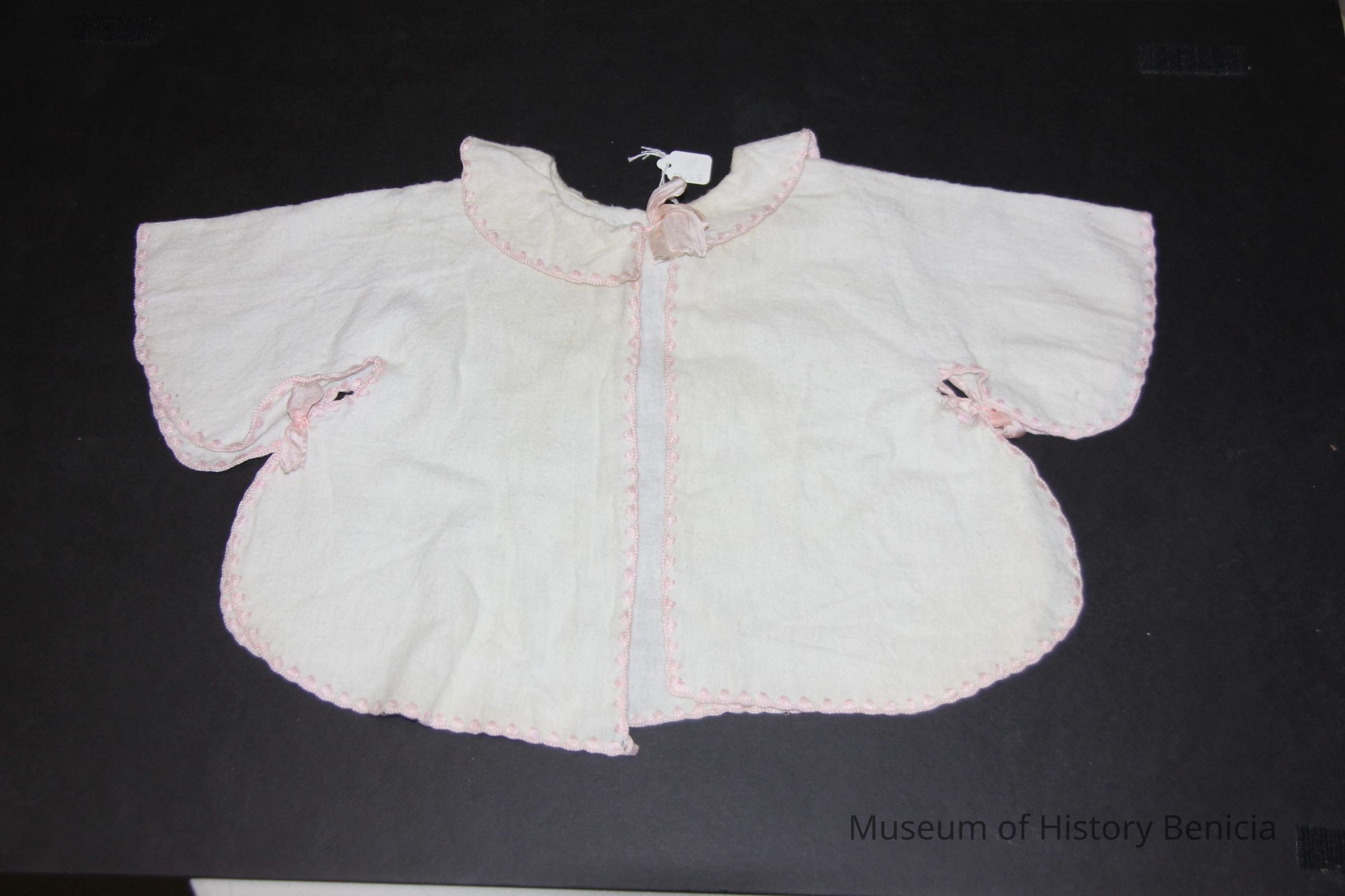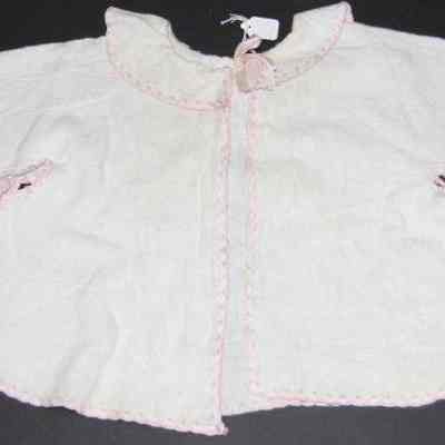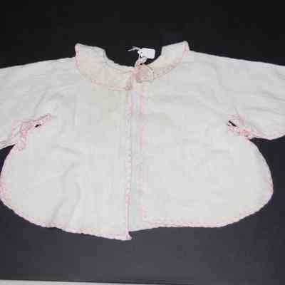 Open fronted cotton layette jacket. Cotton flannel (white) with pink embrodered border. Pink bows at neck and underarm.