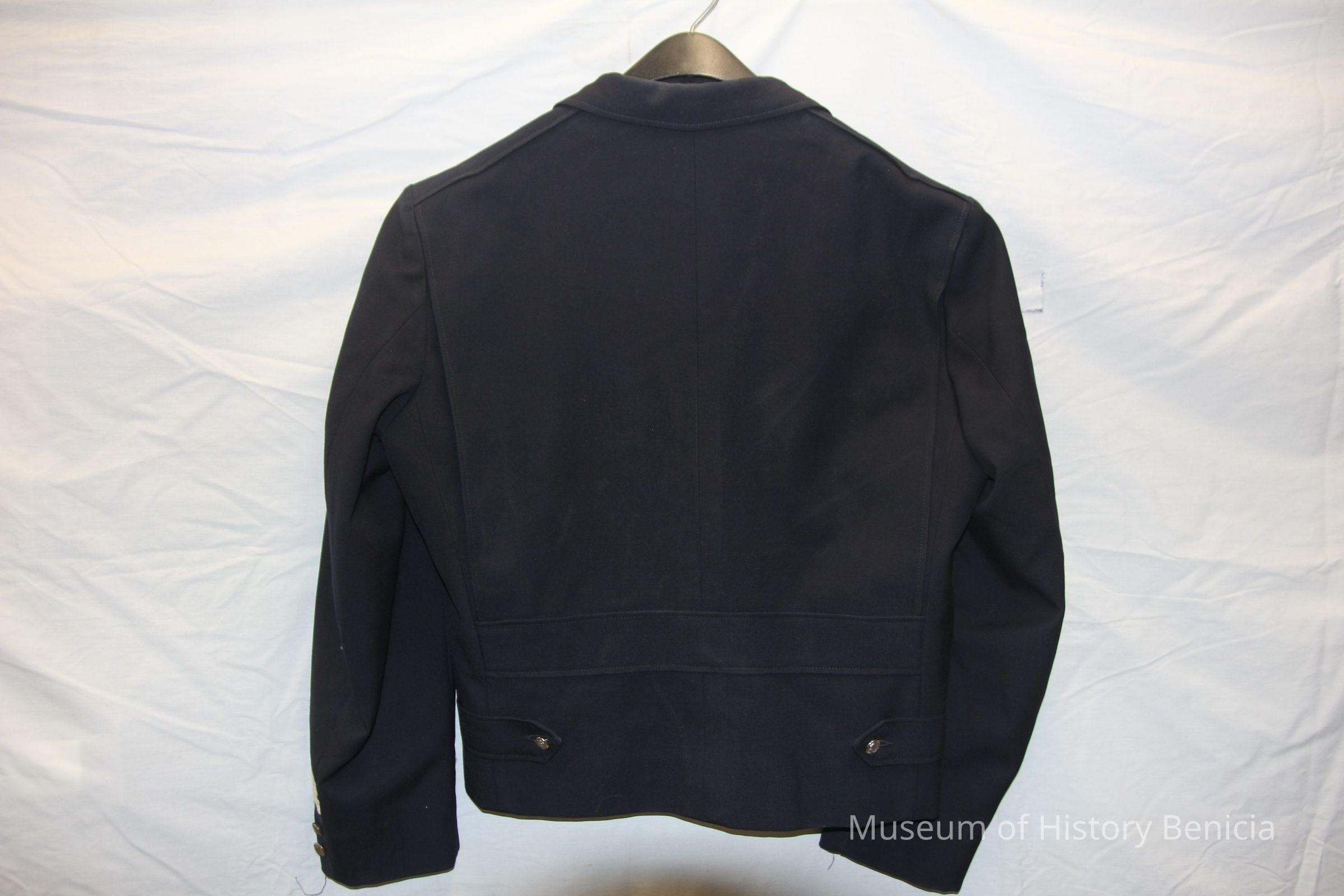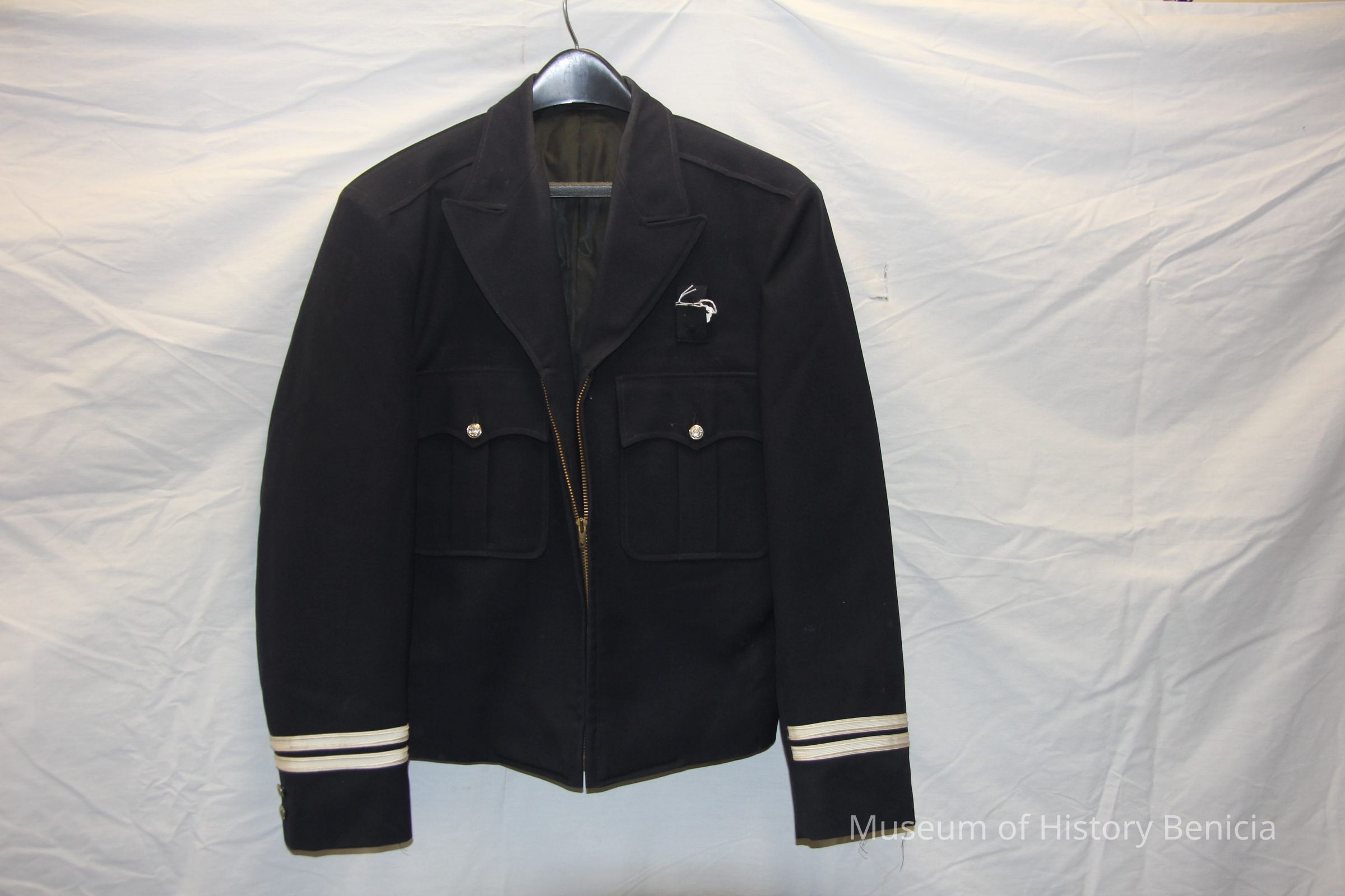 Fire uniform jacket, short, dark blue, with front zipper and white stripes on sleeve cuffs