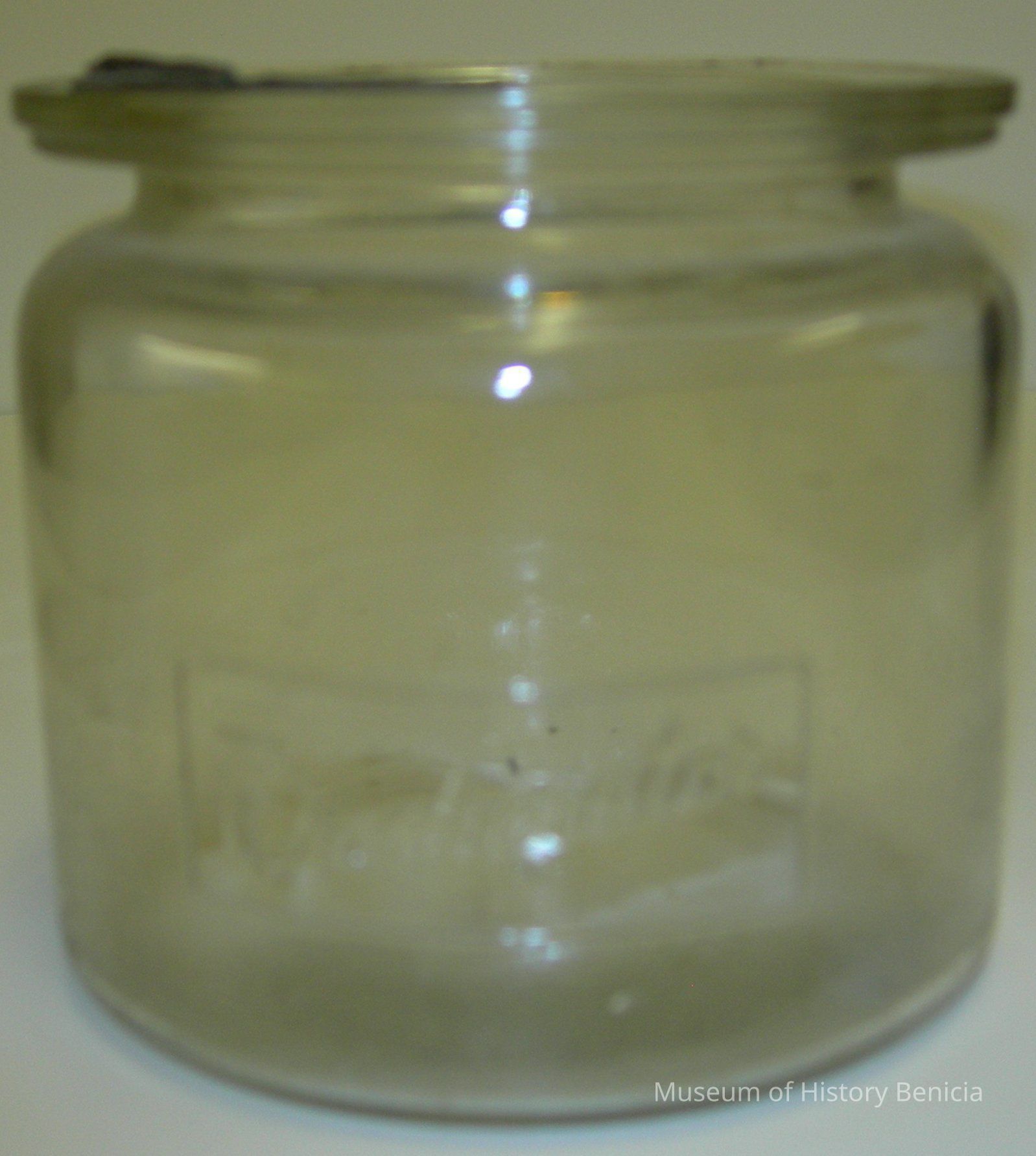 glass jar with "Fresherator" in raised letters on one size; there is some stippling around the bottom edge going up about 1" all around; there is a small piece of rubber on the upper rim indicating that there was probably a rubber ring and a lid of some kind to help keep the contents fresh.Collection