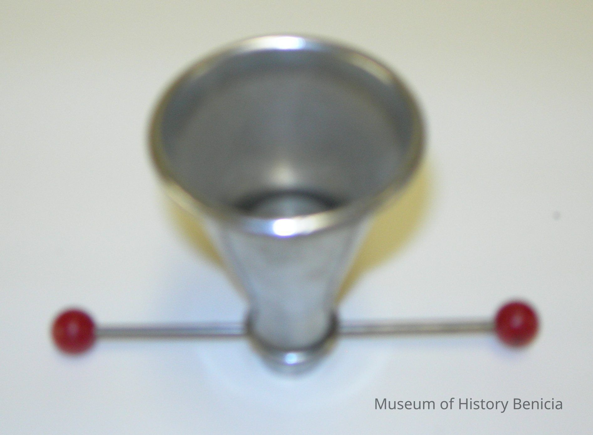metal jigger with lifter in bottom to release the liquid into the glass; red beads are on the ends of the thin release bar
