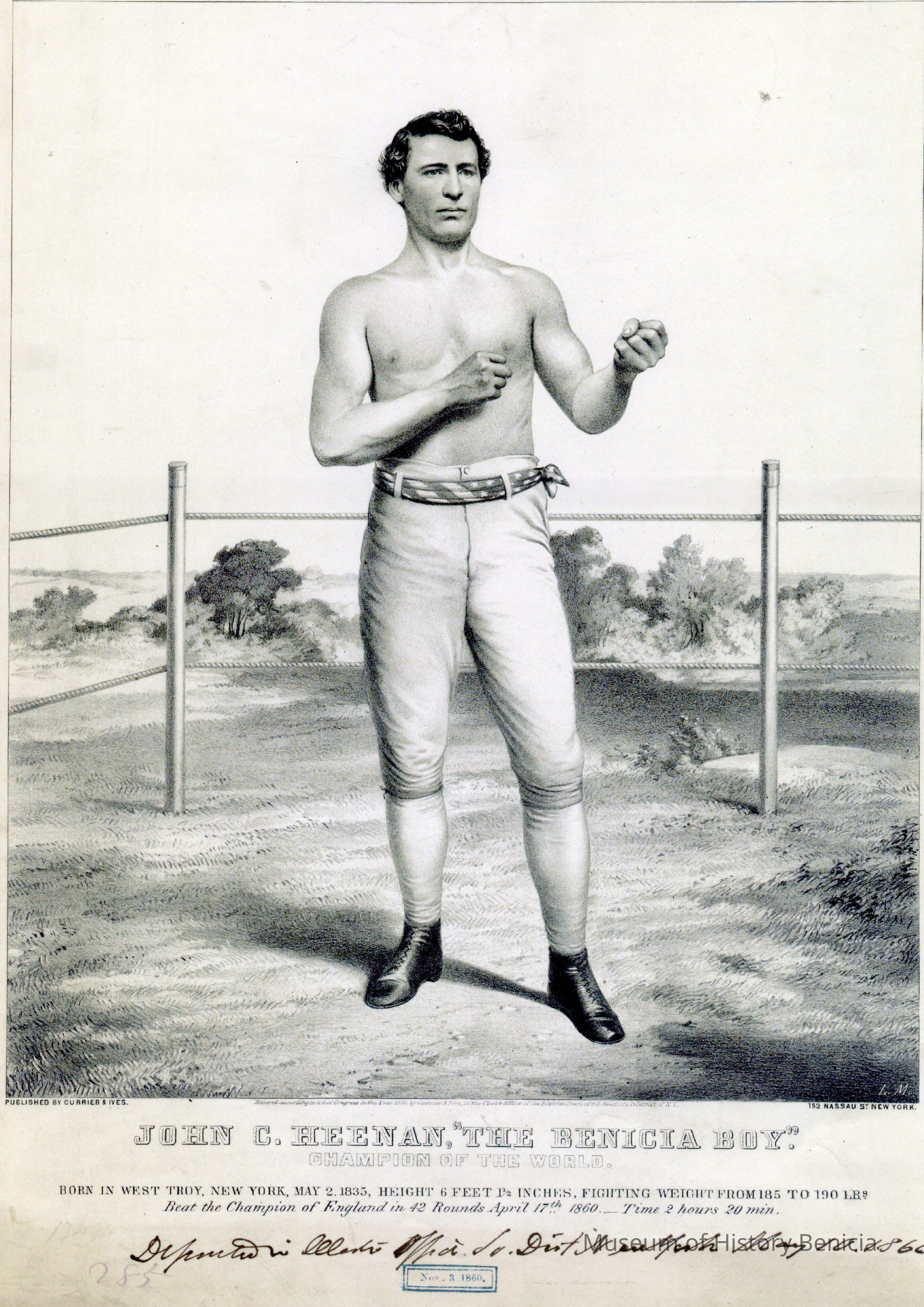 This is a modern copy of an original lithograph of John C Heenan "Benicia Boy". It shows Heenan in the ring with his fists held up. The print was made by "L.M." from New York probably 11/3/1860. The print was made by Currier & Ives.Photograph Details