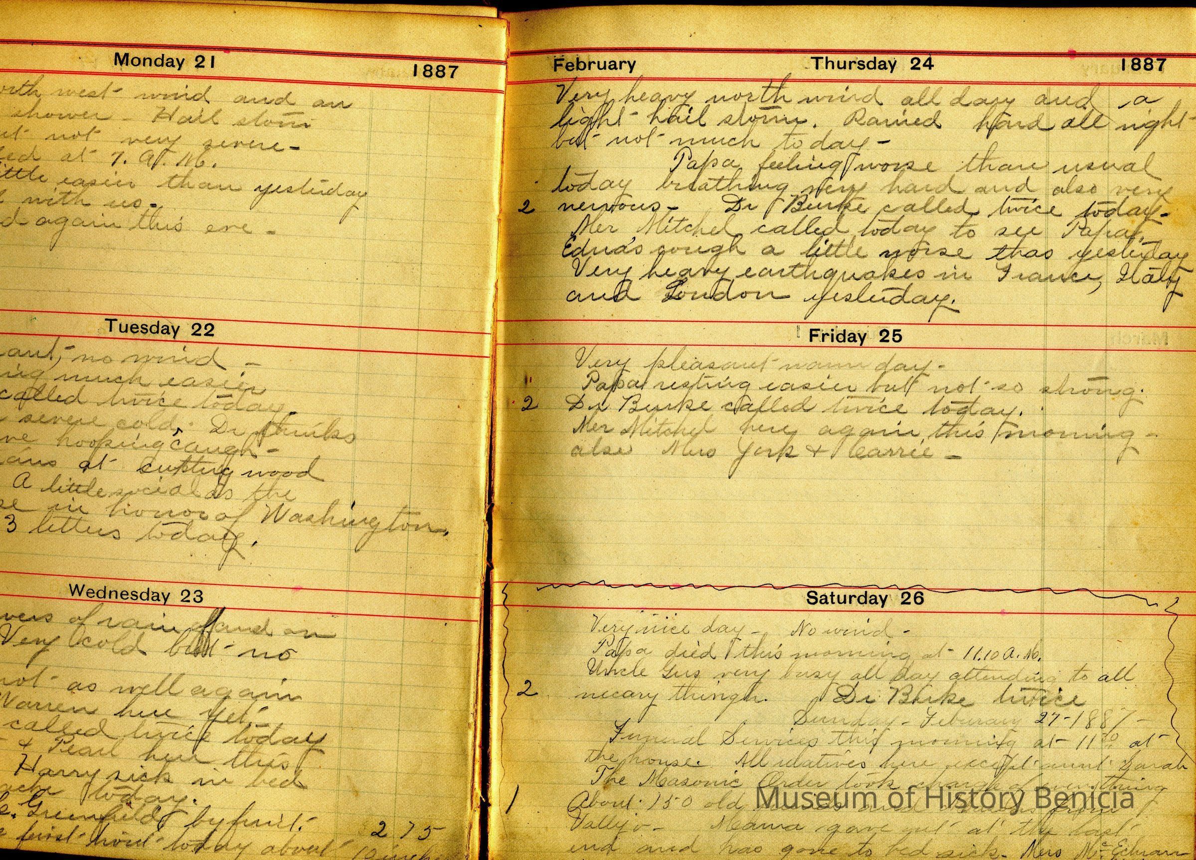 Small personal journal kept by E.T. Starr (Edward Thompson Starr born 1843) of Vallejo in 1887. Mr. Starr records the weather every day and his activities. In the back he records his expenditures.Collection