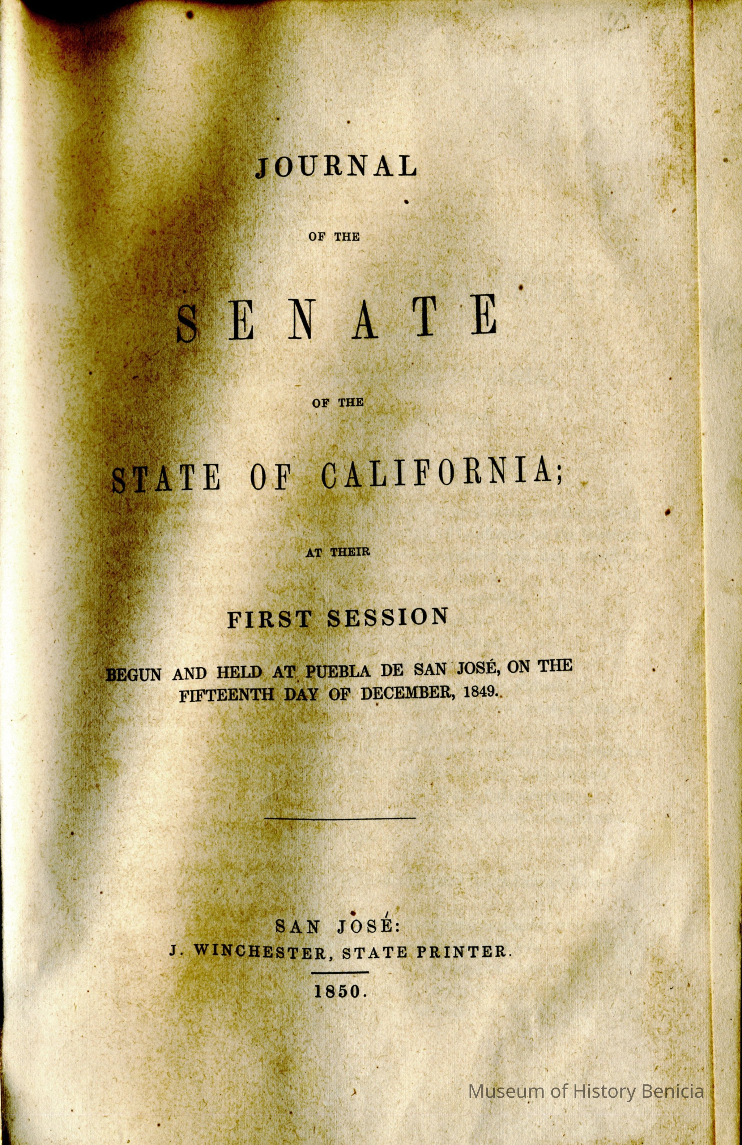 A book covering the actions of the California Senate and Assembly during the first days of the State. It is broken down into the Senate sessions and the an appendix showing various reports submitted to the Senate. It then does the same for the Assembly.