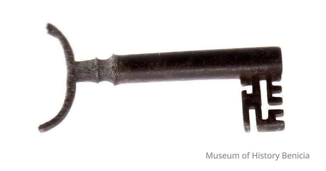Iron key that goes with the wooden tool chest that belonged to Horatio B. Hawkins, capenter at the Pacific Mail Steamship Company in Benicia.