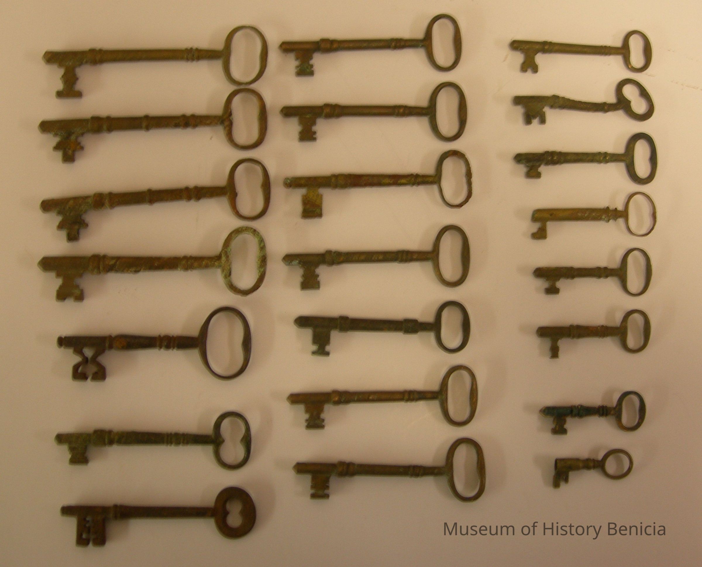 Bag of old keys - twenty-two, all made of metal; origins unknown; five large, nine medium, six medium-small, two small; length size range from 5-1/4" to 2"