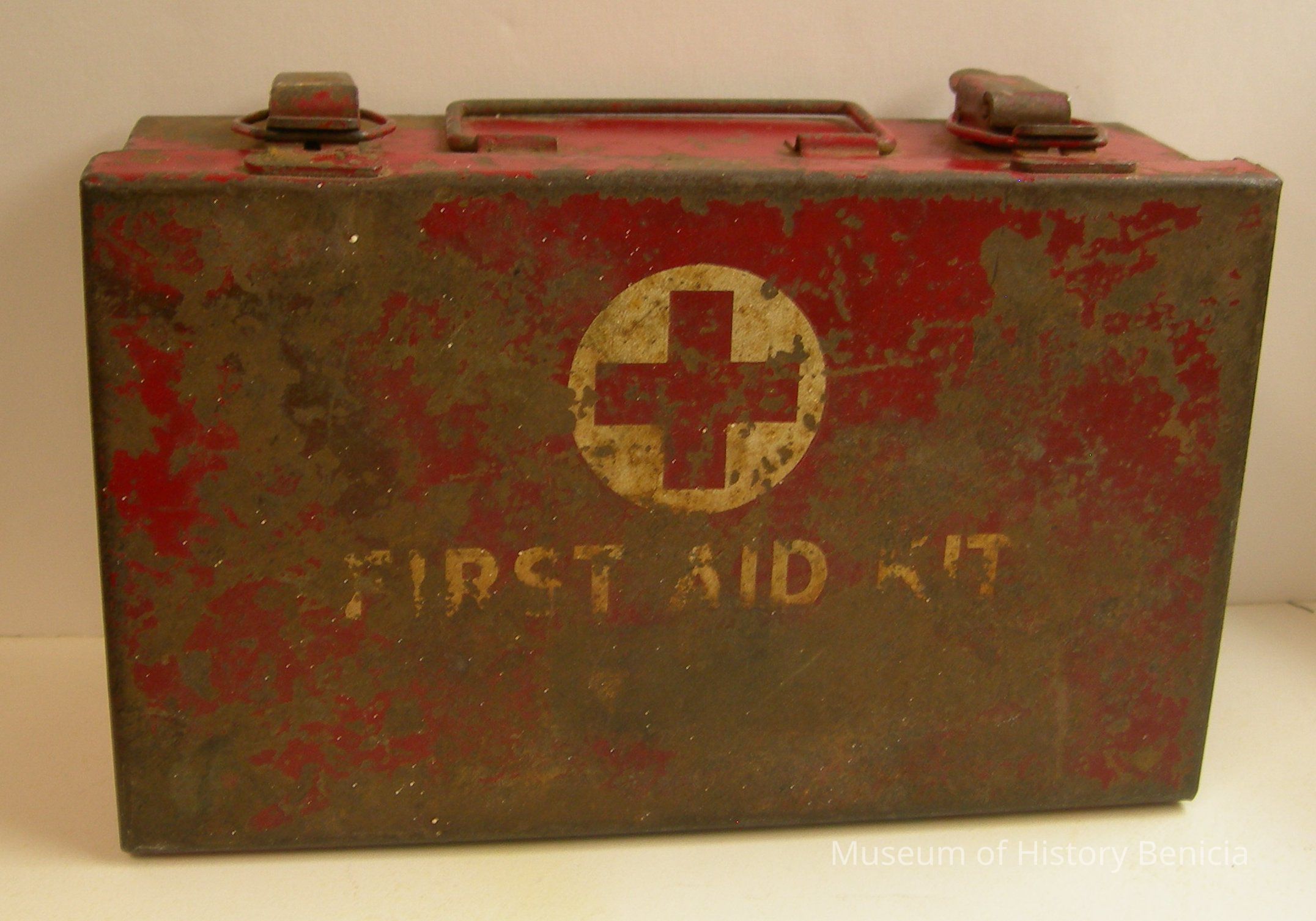 Rectangular red-painted metal box w/hinged lid and bail handle. Two latches. "First Aid Kit" on lid in white w/red cross. Paper label inside lid: "First Aid Hints", 2 pkgs "Bandage Compress", 2 pkgs "Bandage, triangular" 2 pkgs "Plain Gauze", 2 bottles "water purification tablets";