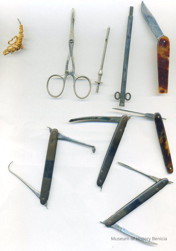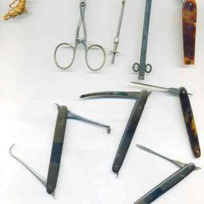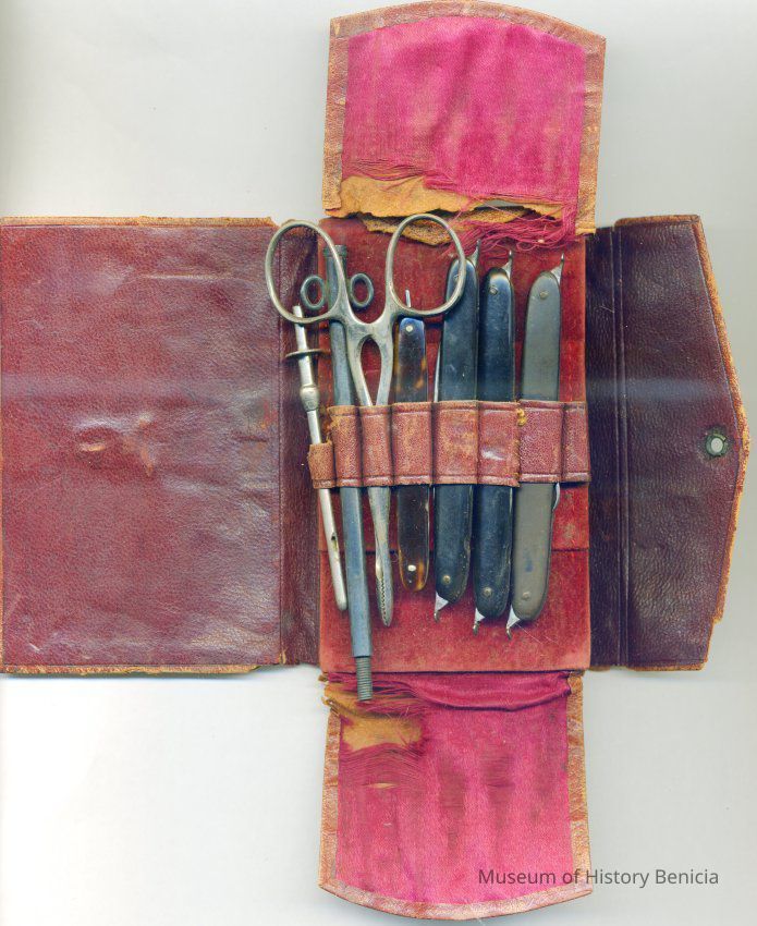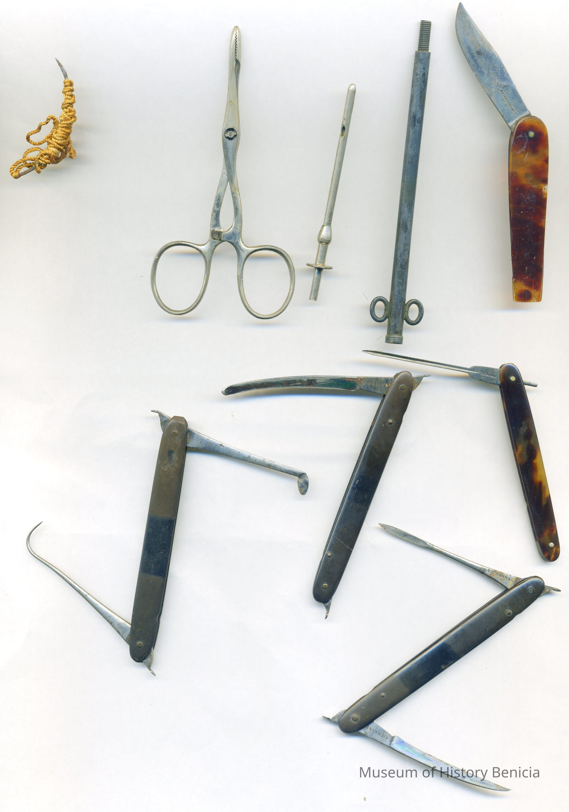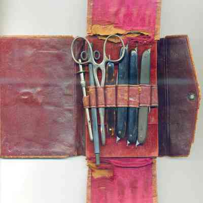 19th Century traveling doctor's instrument/surgery kit. It contains scalpels, forceps, a tortise shell handled knife, needle and thread for stitching wonds, and other small medical instruments. The scalpels were made by Tiemann Co. One early publication says that George Tiemann's instruments became the instruments of choice in the 1850s for physicians and surgeons in New York. The tortise shell knife was made by Brinckerhoff of New York. There is no makers name on the kit.Collection