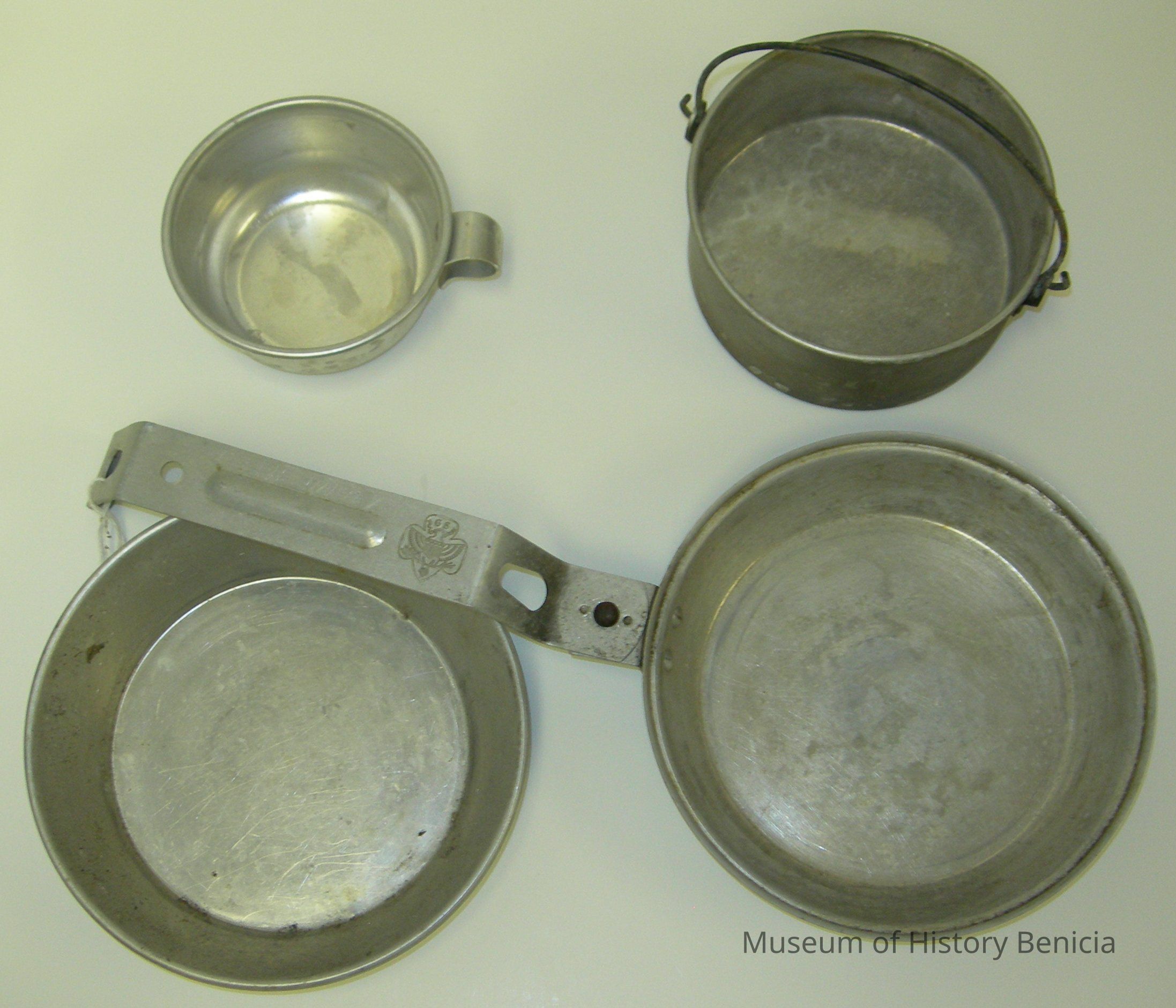 Aluminum Girl Scout nested 5 piece mess kit; scratched in the bottom of the bowl and cup is "Helen Harvey"; Girl Scout logo is on piece which acts as a handle and closure for the kit