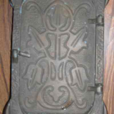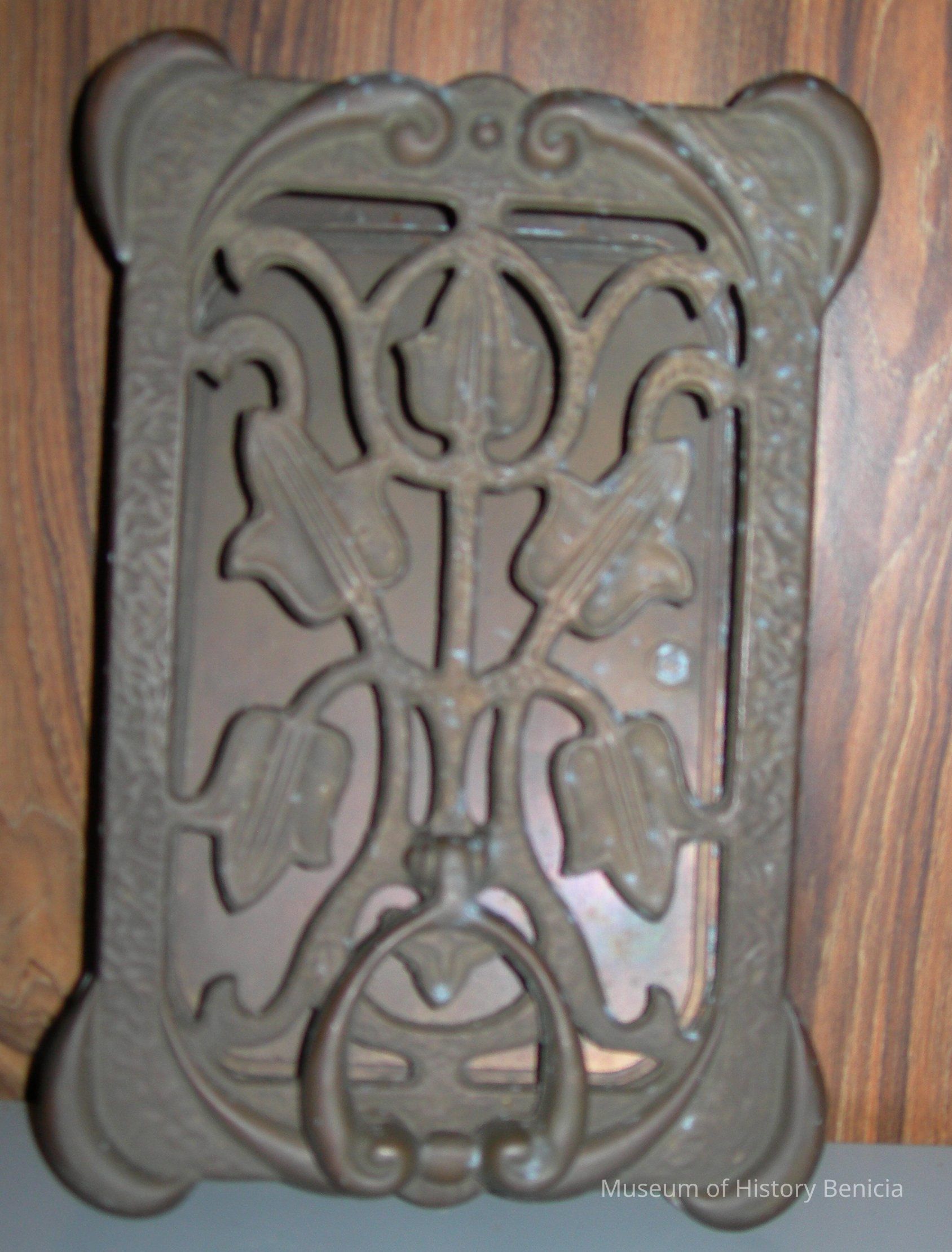 Rectangular with horseshoe-shaped knocker. Hinged back "door" covers floral cut panel with scrolled edges. 2 long screws.