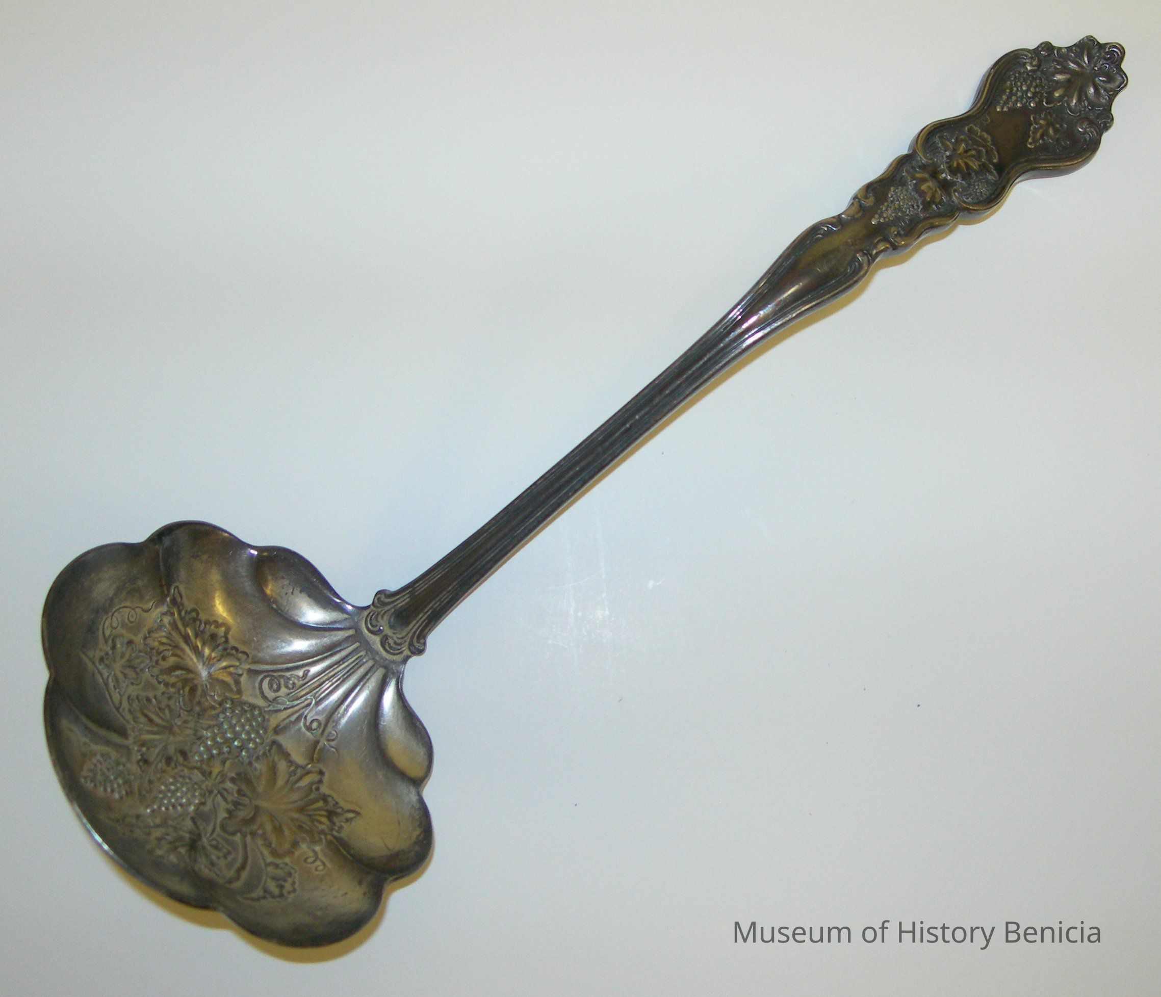 Silver ladel with grape vine design in the bowl of the spoon and on the handle (slightly bent to allow lifting straight up) on back A.S. CO 1857 with a globe logoCollection