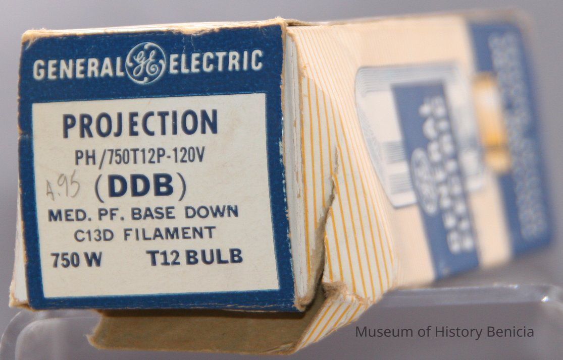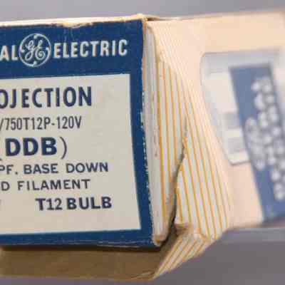 Projection lamp by General Electric. 750w T12 bulb number PH/750T12P-120V DDB with C13 D filament. Written on box is "Burned out". In original box.