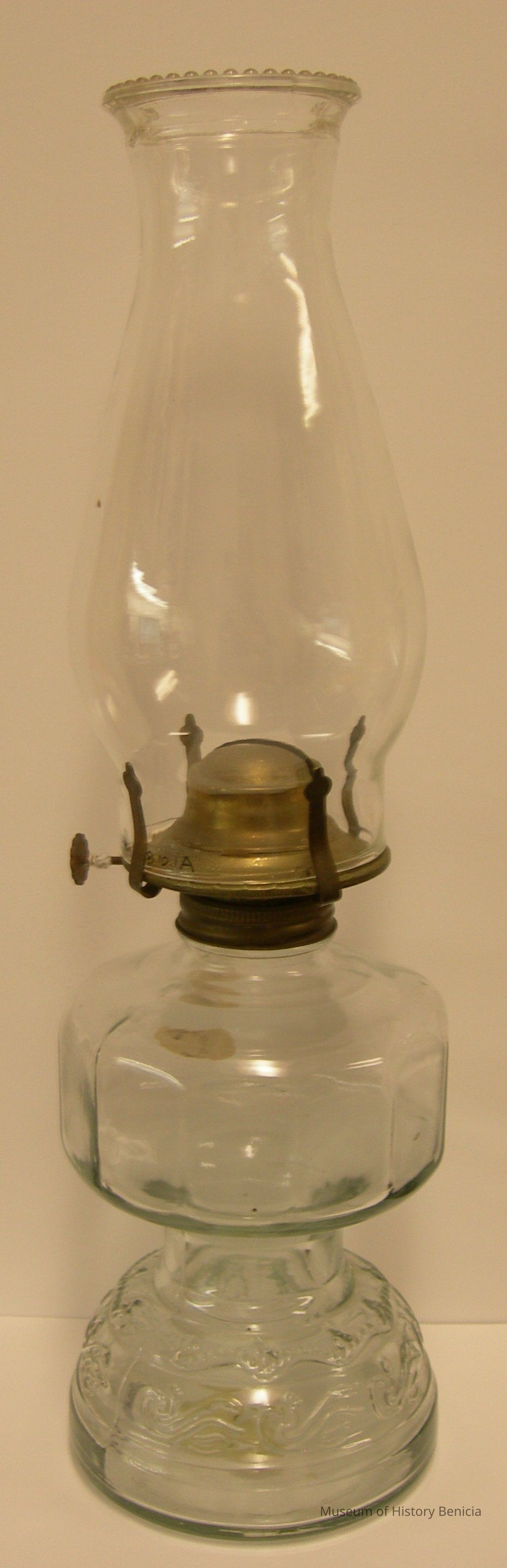 Clear glass oil lamp with hurricane hood (chimney)