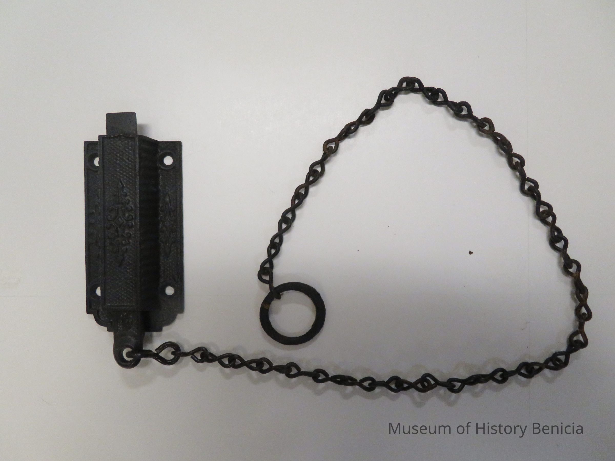 Vintage black metal door latch with chain