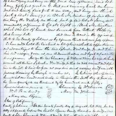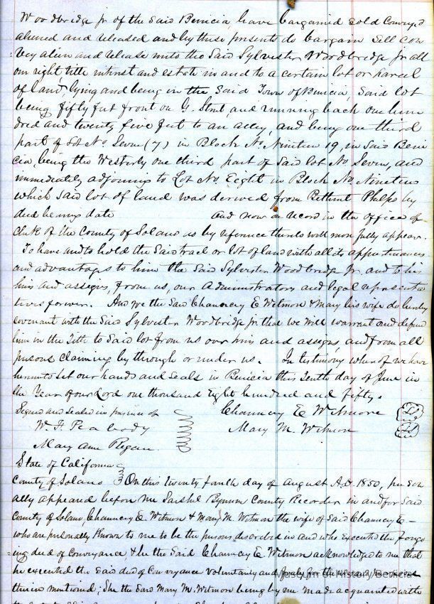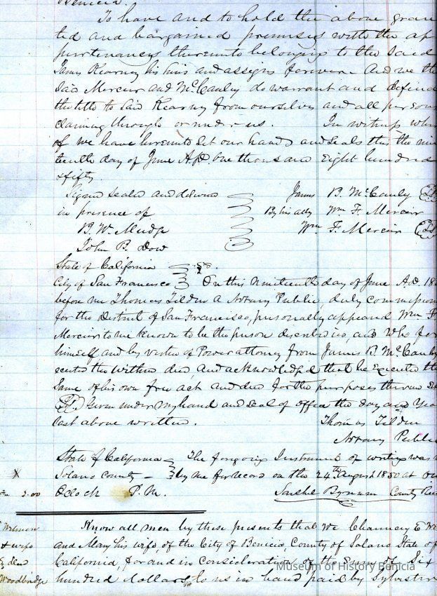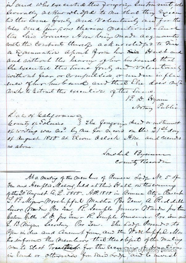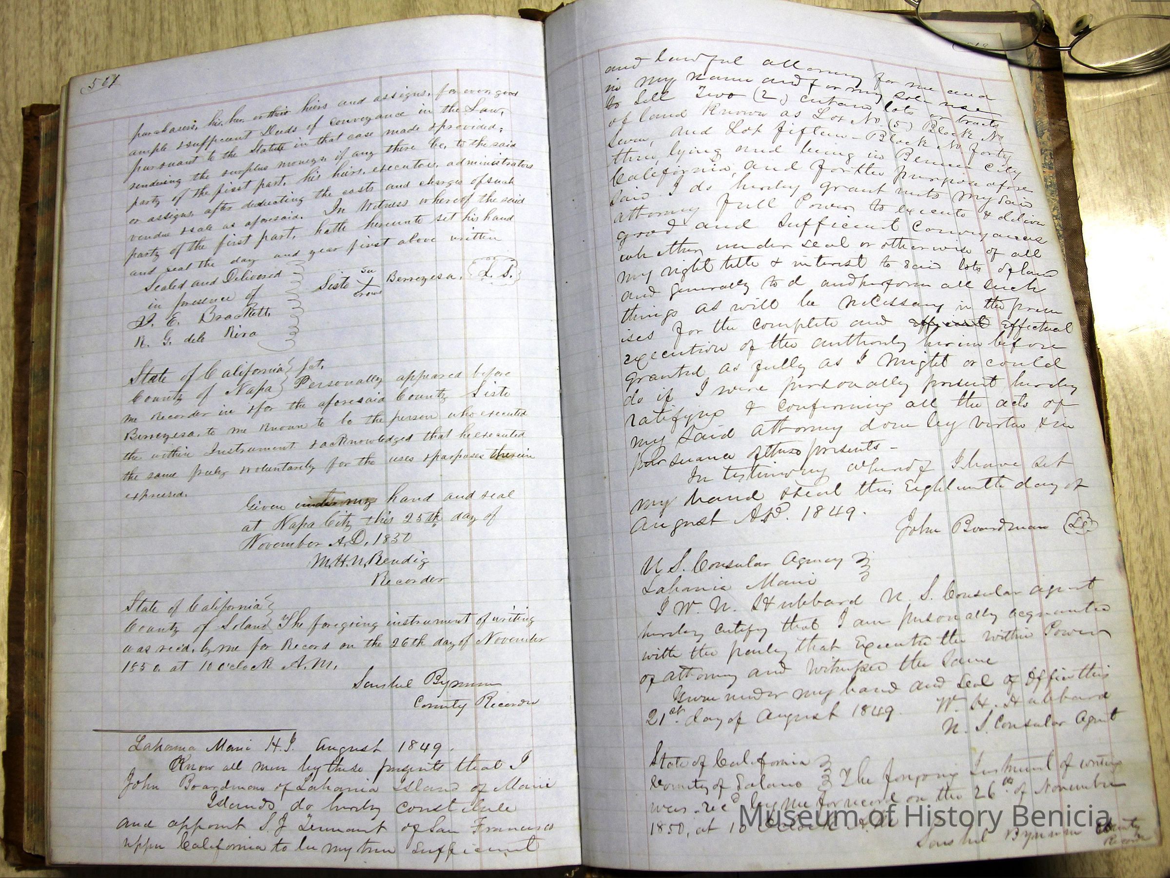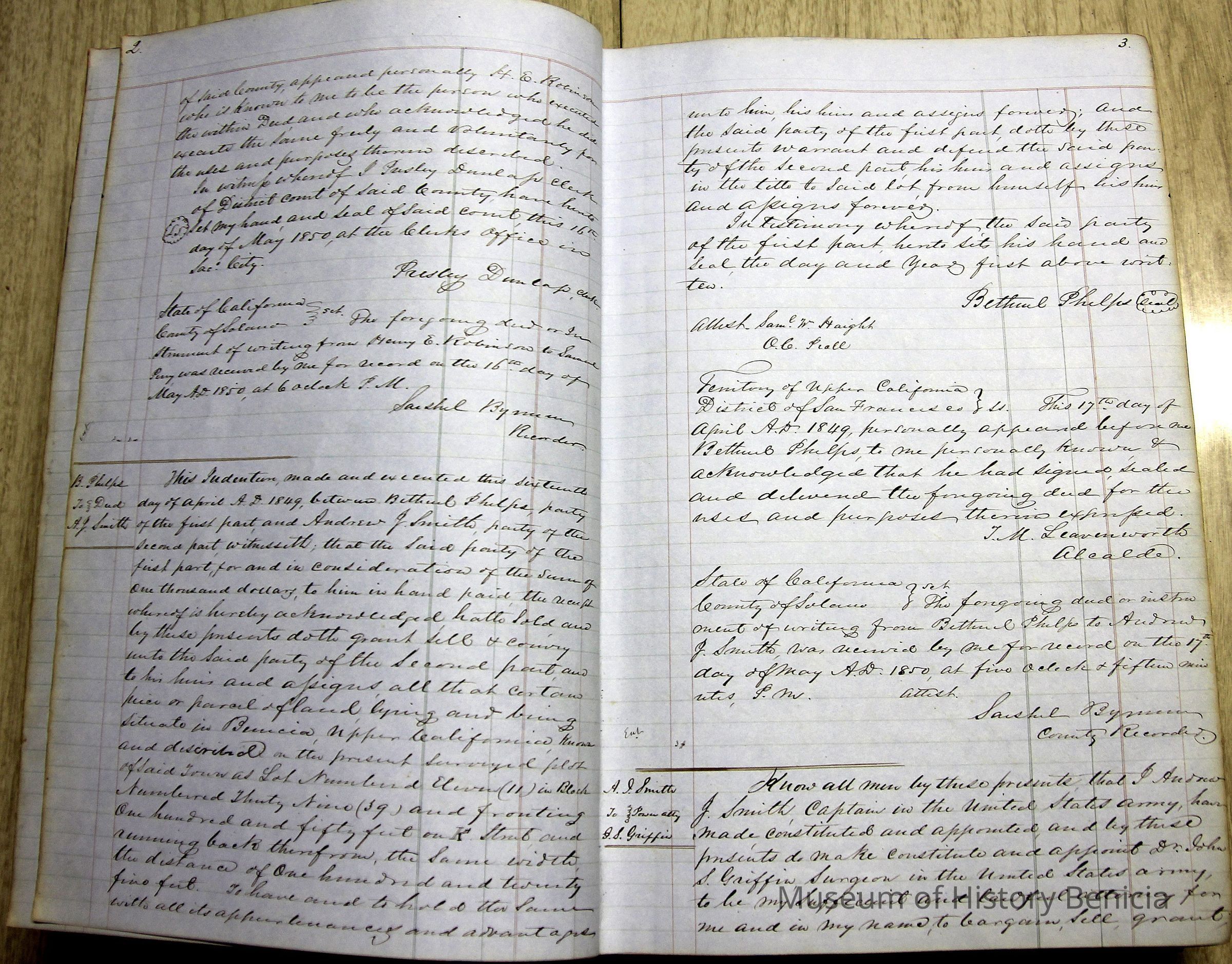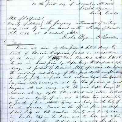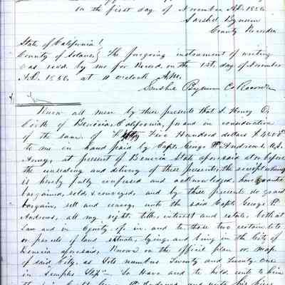 This ledger and loose index contain deeds and mortgages recorded in handwriting from May 1850 through November 1850 regarding land ownership filed in Benicia for the year 1850. The last entry concerns property being sold by John Broadman of Lahania Island of Maui (Hawaii) and giving power to his attorney to sell property [in Benicia Lot No.5 - Block No.7 and Lot No.15 - Block No.40]. The original cataloger wondered how he acquired the property?