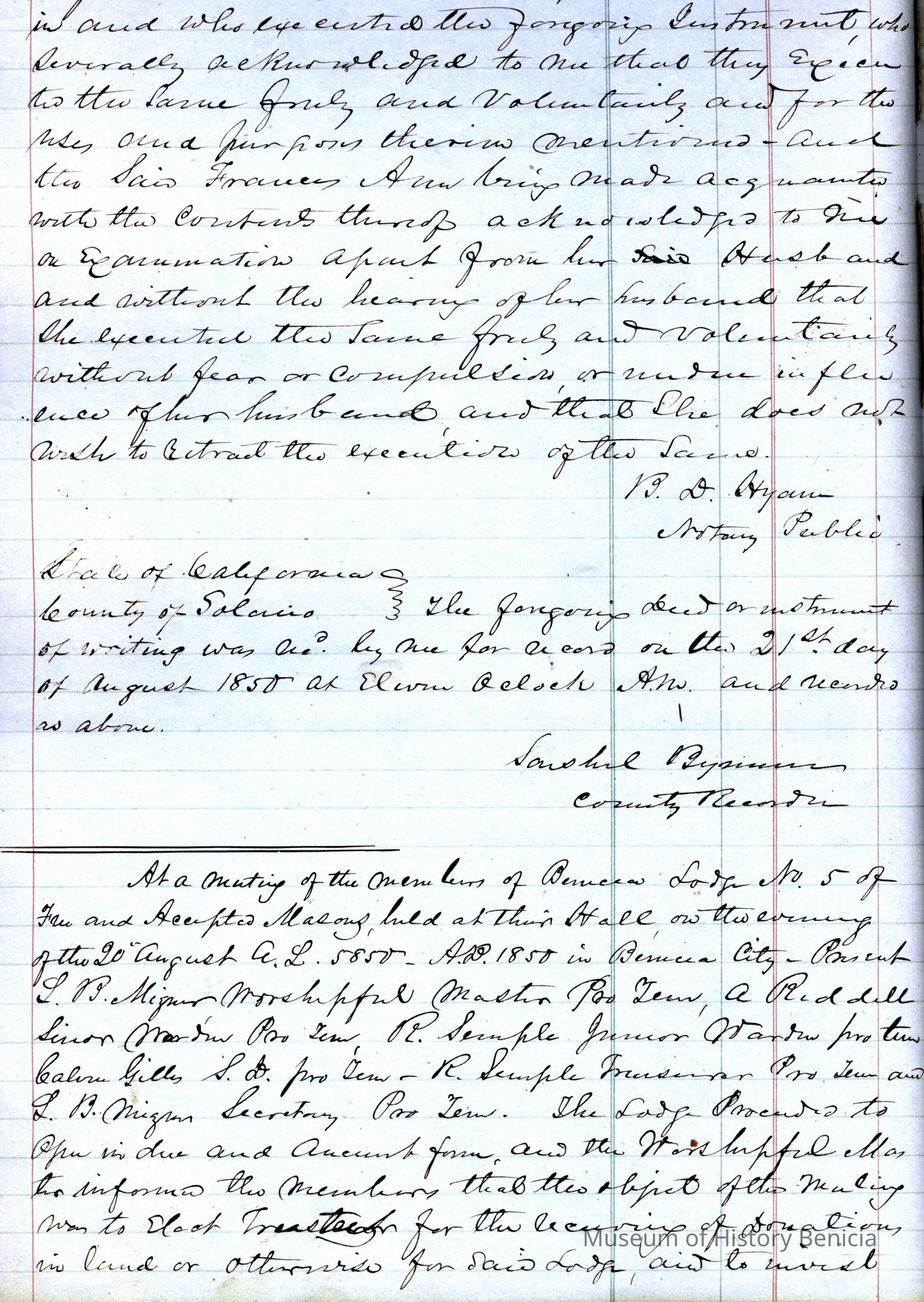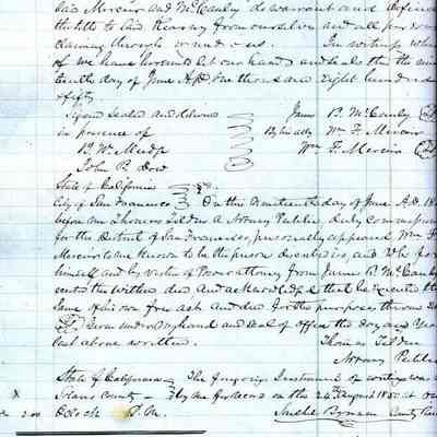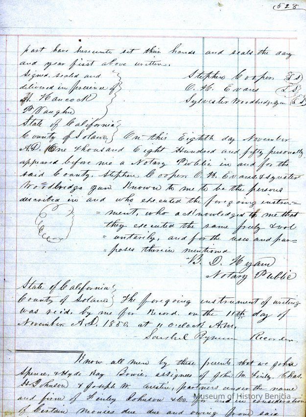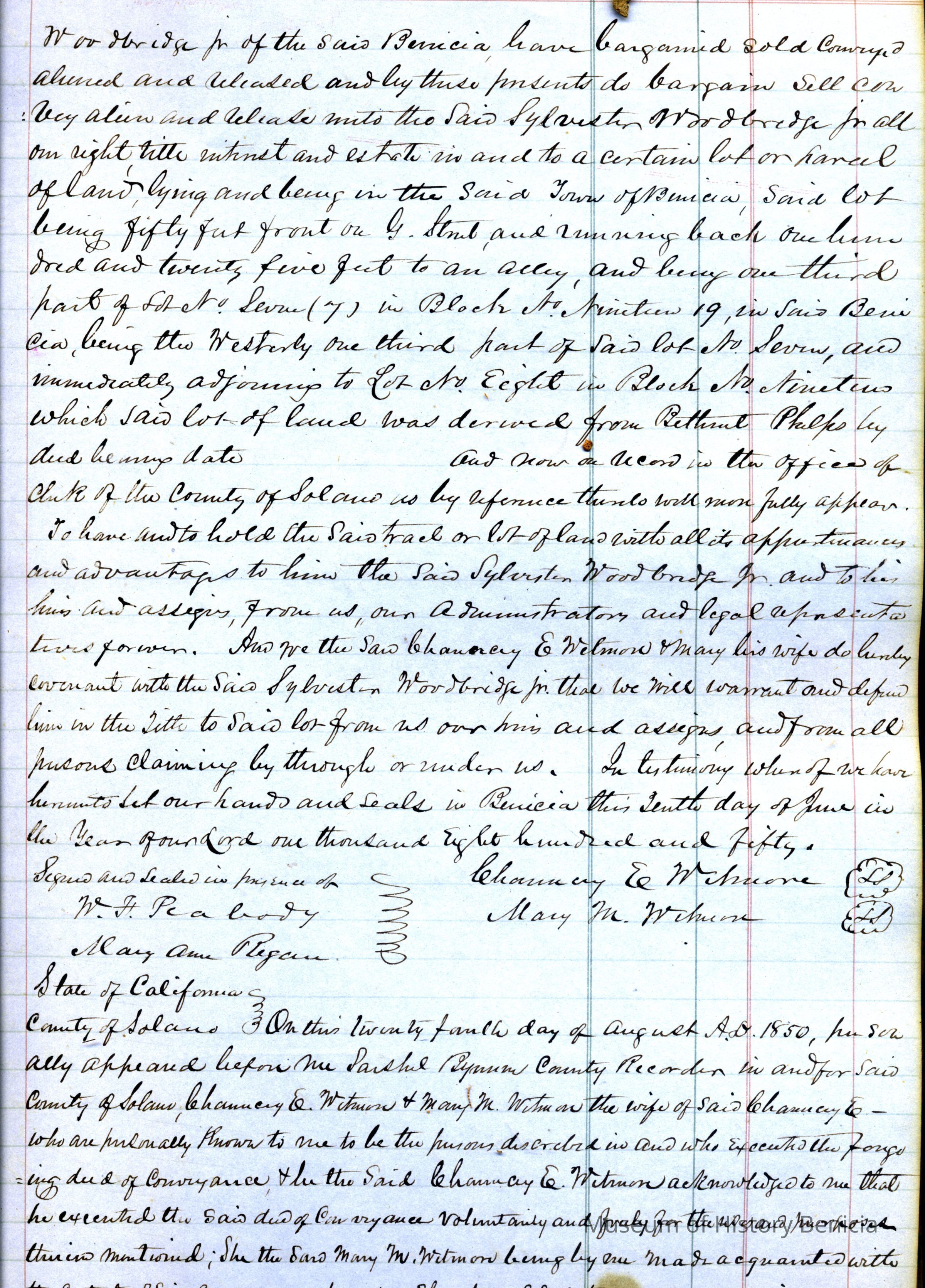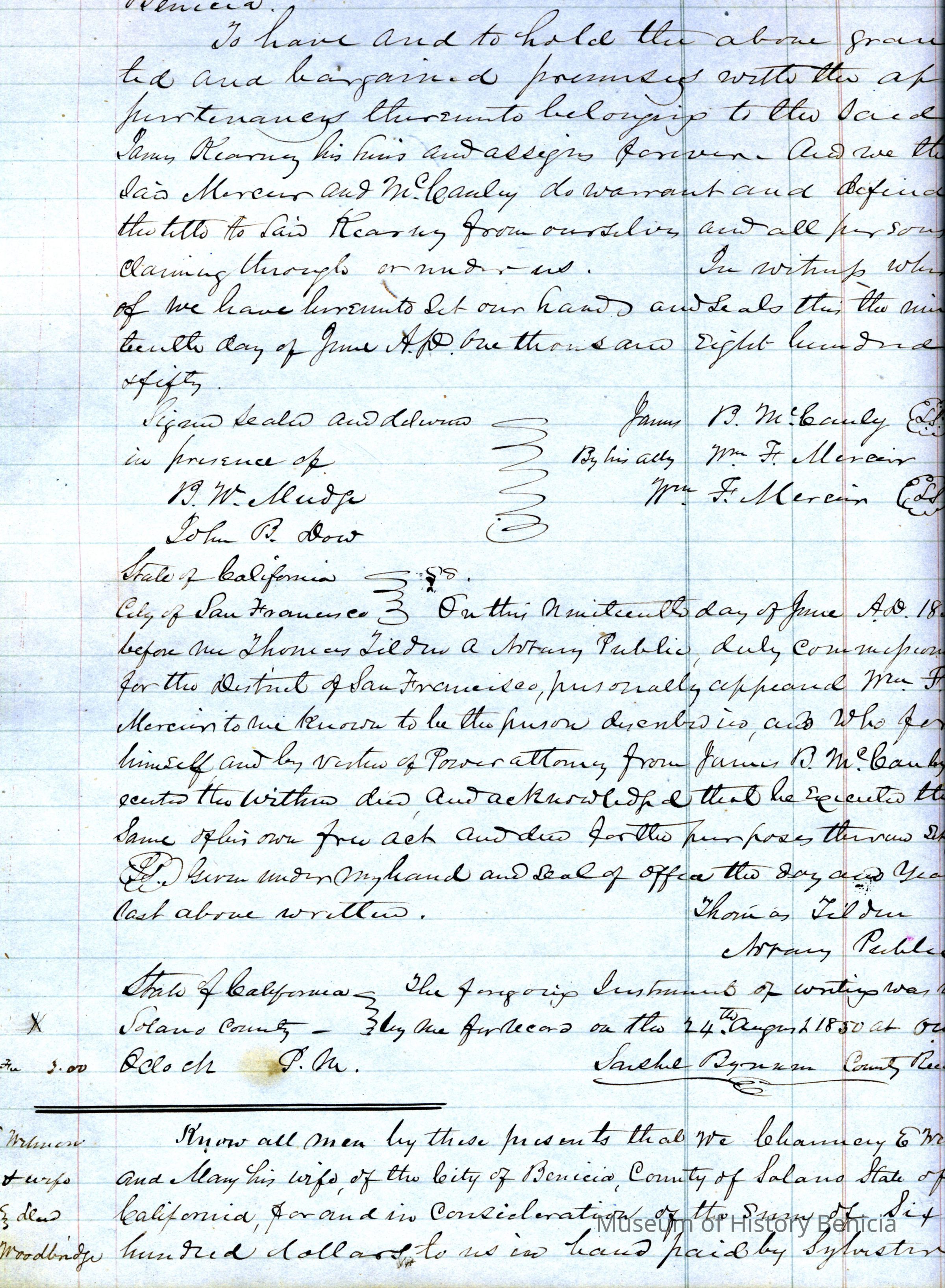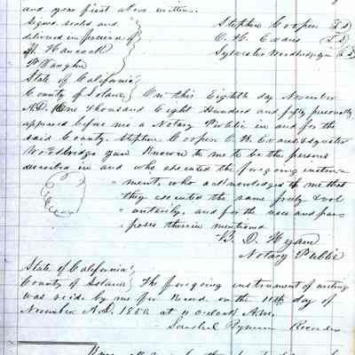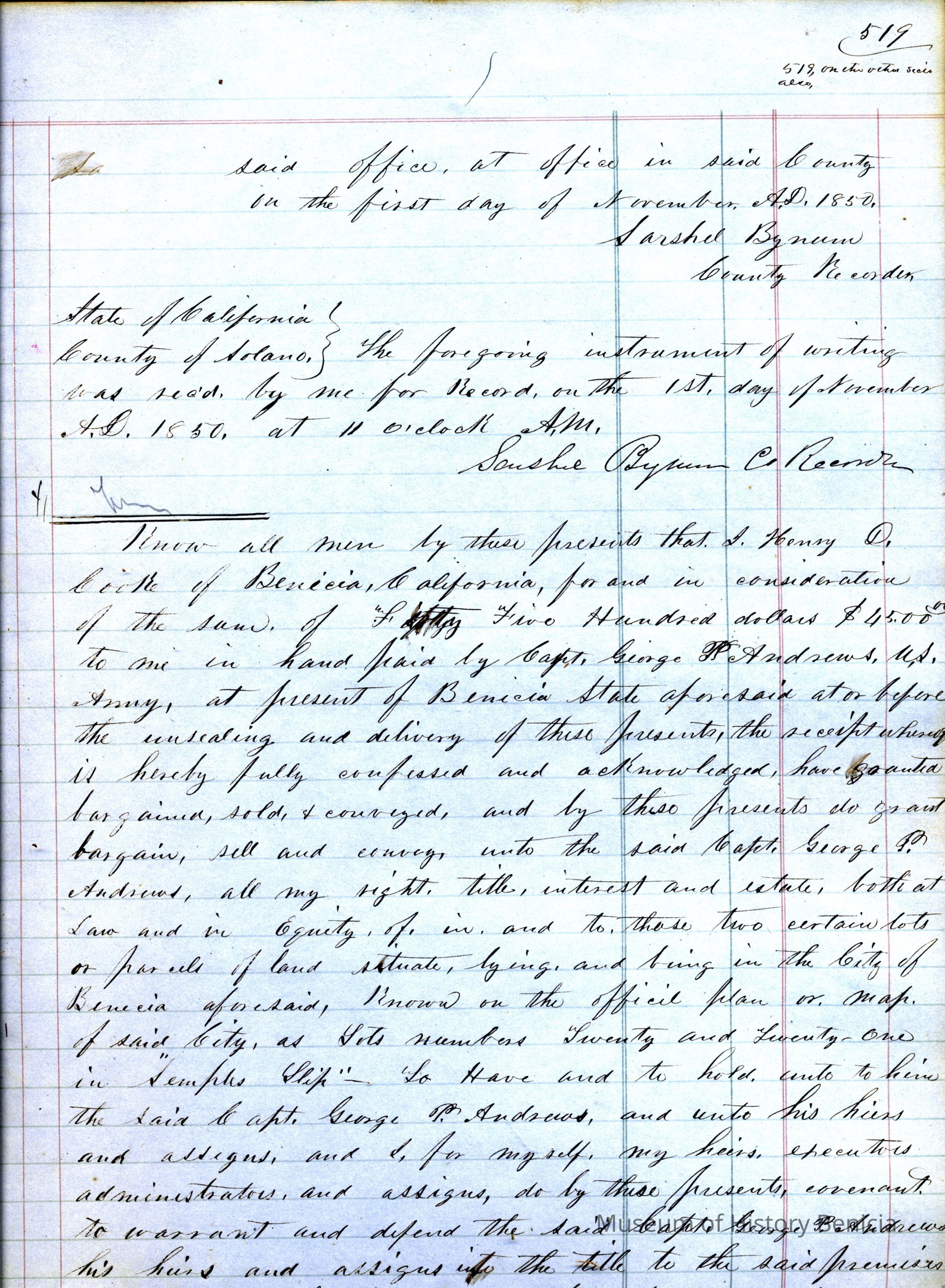 This ledger and loose index contain deeds and mortgages recorded in handwriting from May 1850 through November 1850 regarding land ownership filed in Benicia for the year 1850. The last entry concerns property being sold by John Broadman of Lahania Island of Maui (Hawaii) and giving power to his attorney to sell property [in Benicia Lot No.5 - Block No.7 and Lot No.15 - Block No.40]. The original cataloger wondered how he acquired the property?