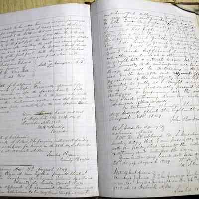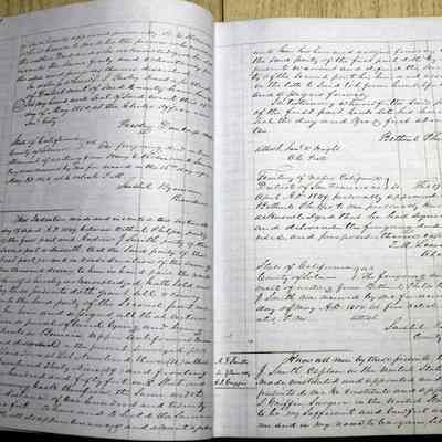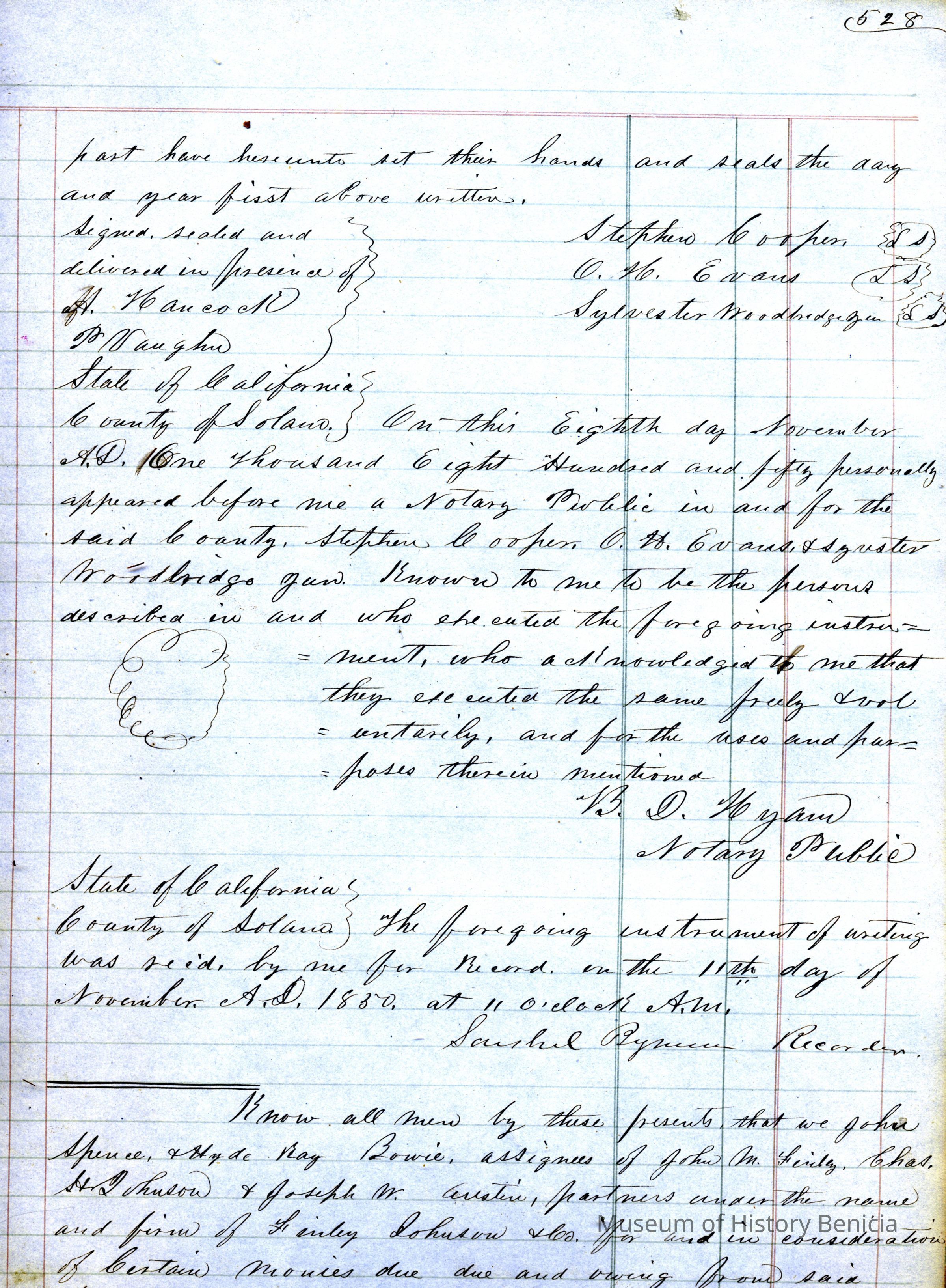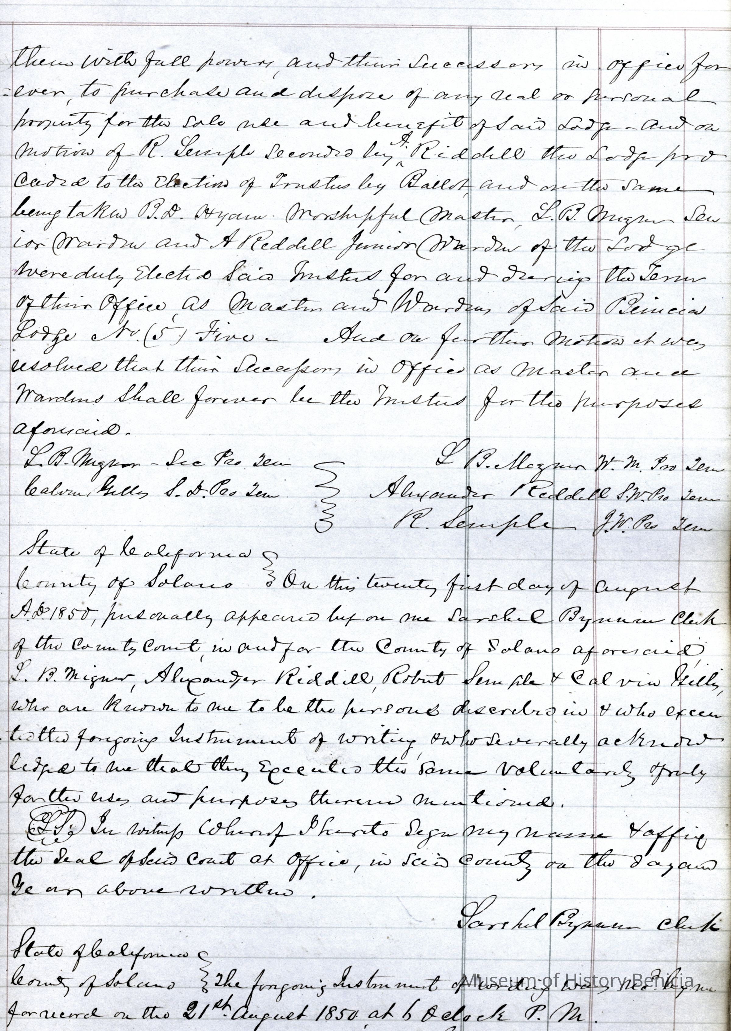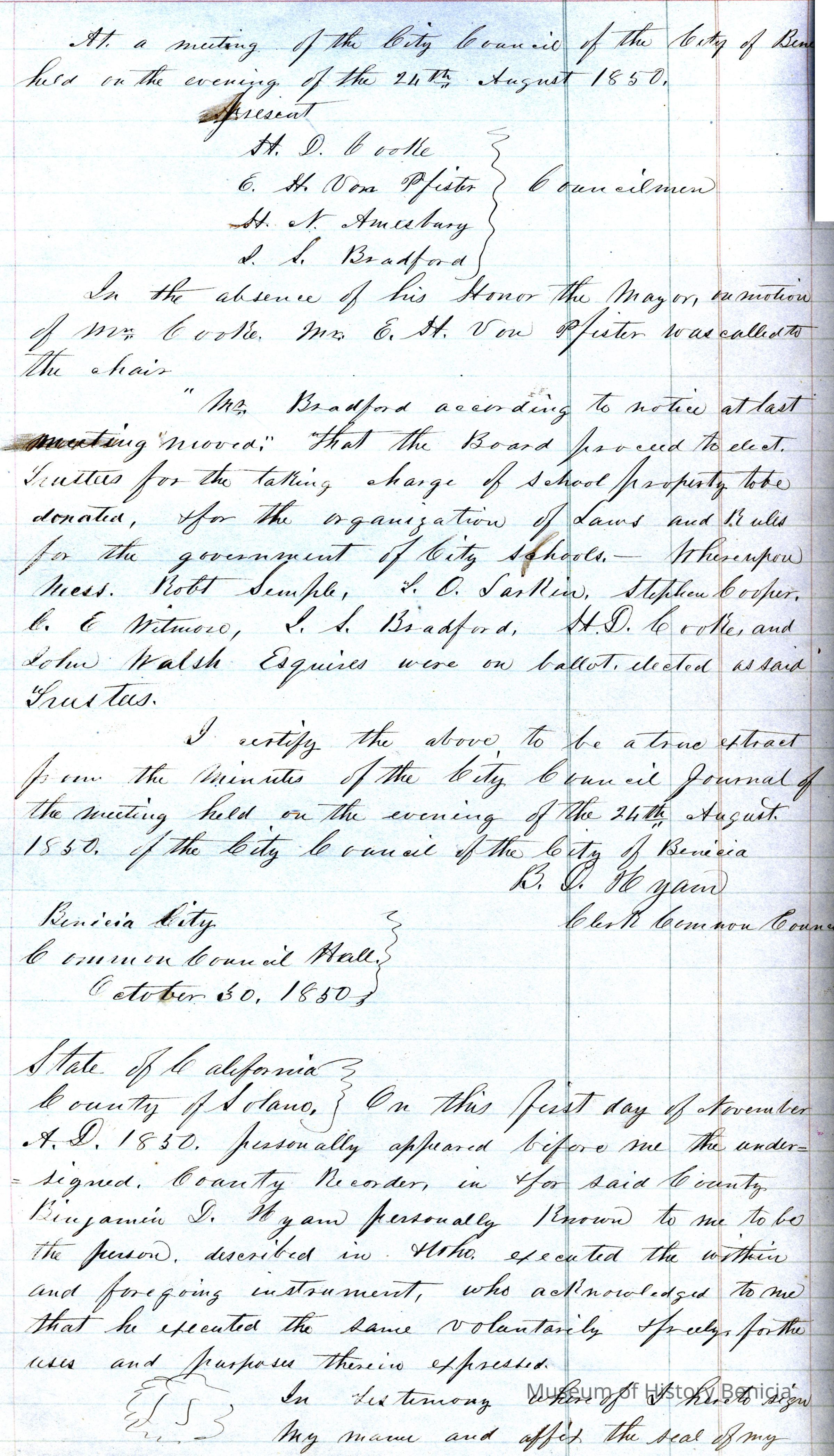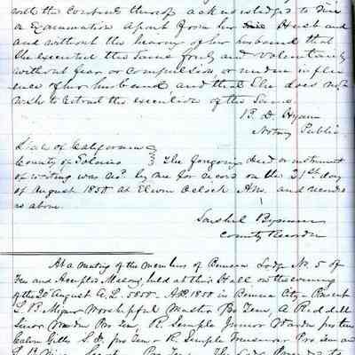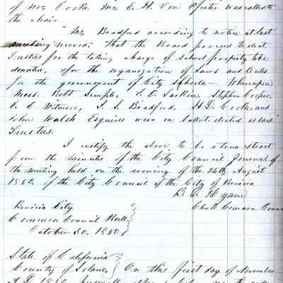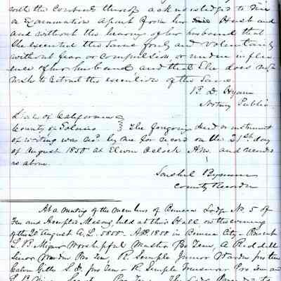 This ledger and loose index contain deeds and mortgages recorded in handwriting from May 1850 through November 1850 regarding land ownership filed in Benicia for the year 1850. The last entry concerns property being sold by John Broadman of Lahania Island of Maui (Hawaii) and giving power to his attorney to sell property [in Benicia Lot No.5 - Block No.7 and Lot No.15 - Block No.40]. The original cataloger wondered how he acquired the property?