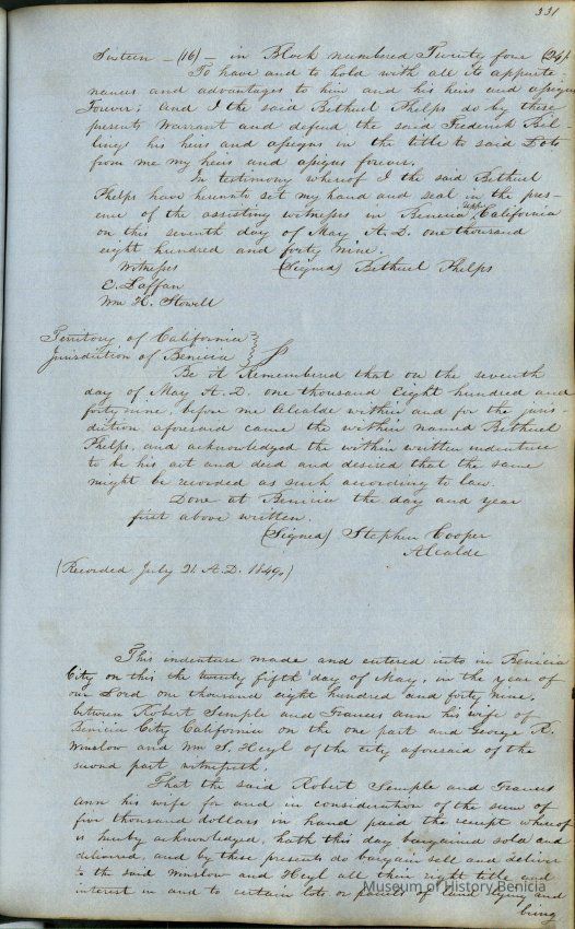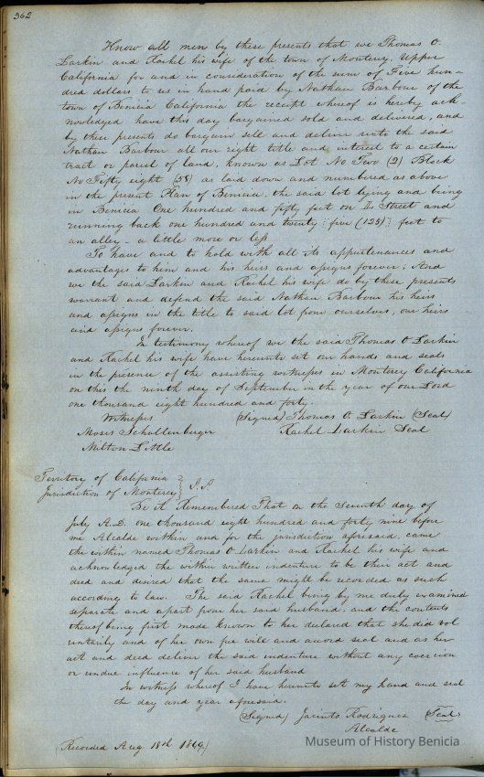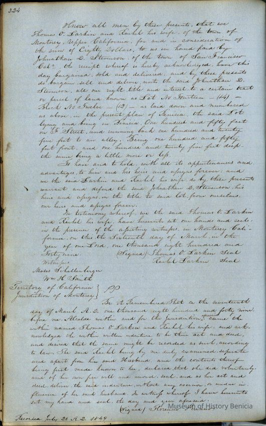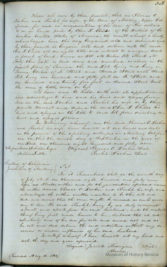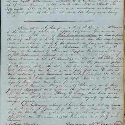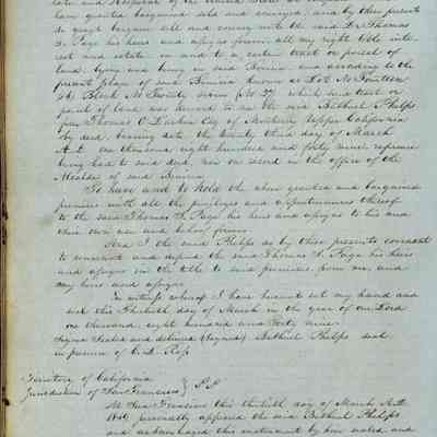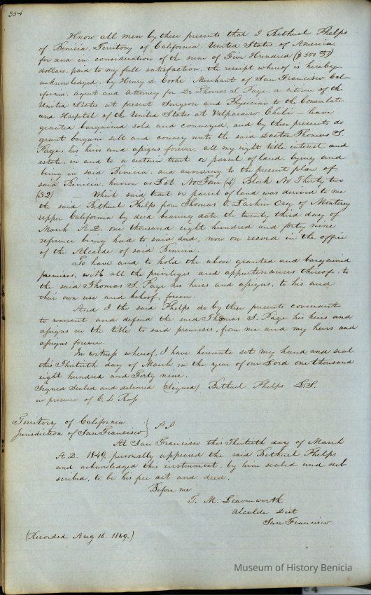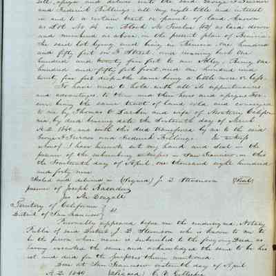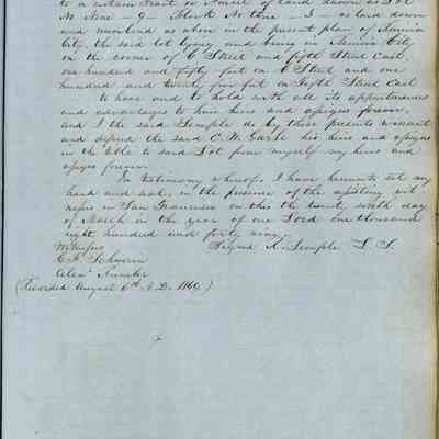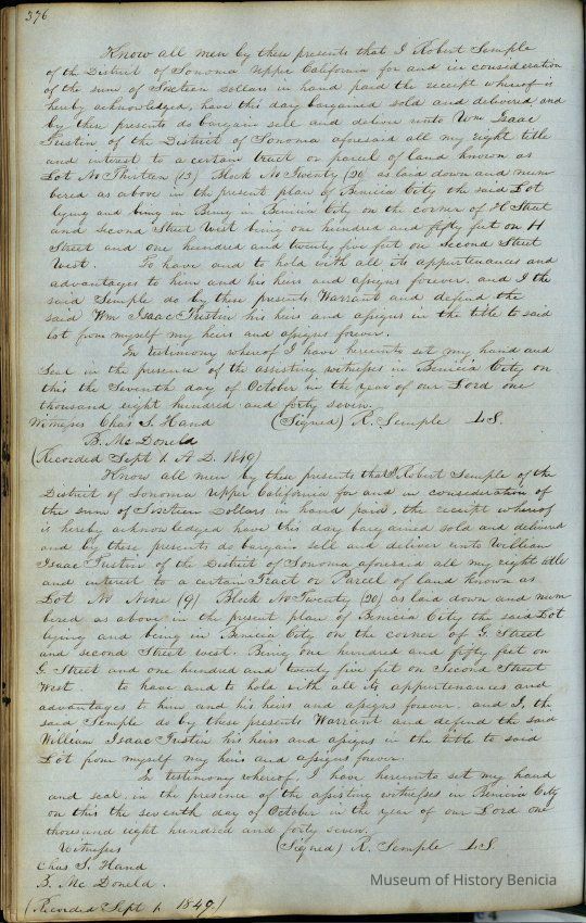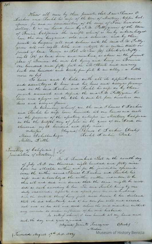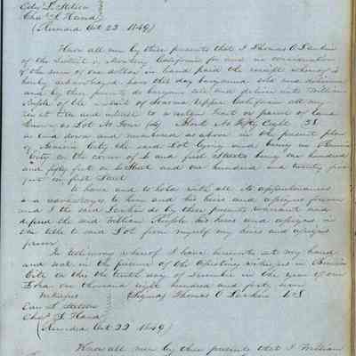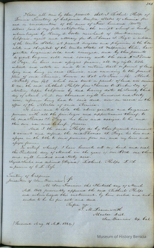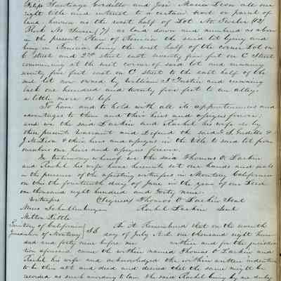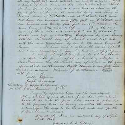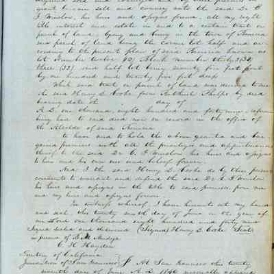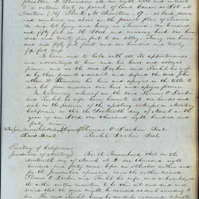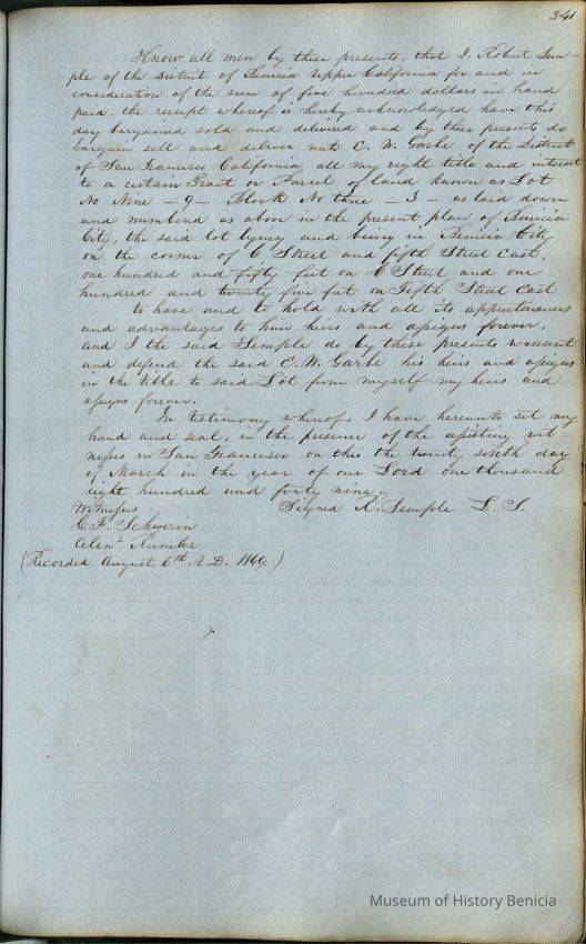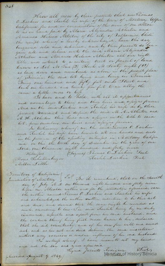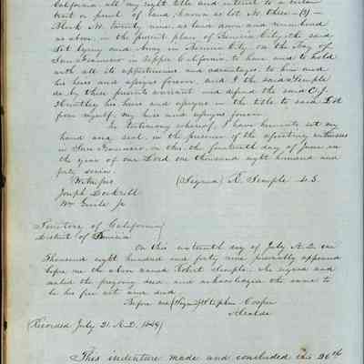 This journal/ledger contains the beginnings of Benicia including: lists and descriptions of first 12 houses in Benicia, a translation of the deed to General Vallejo by Manual Micheltorena, Governor of Calif. (1844); deed to Semple and Larkin by Vallejo (1847); deeds of properties sold by Semple and Larkin from 1847 - 1849