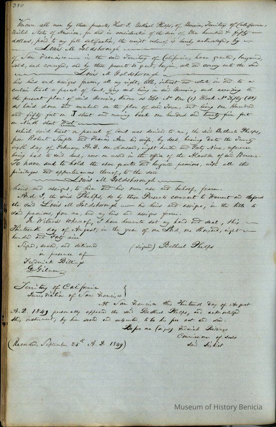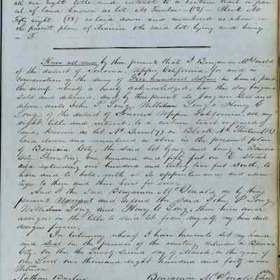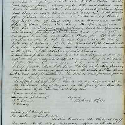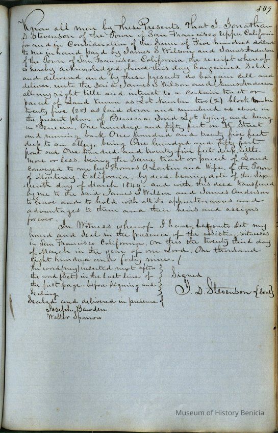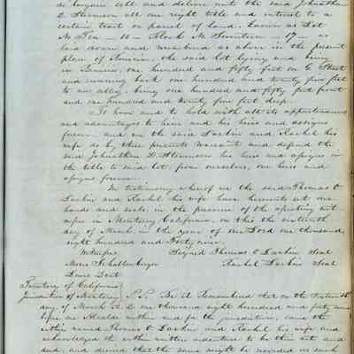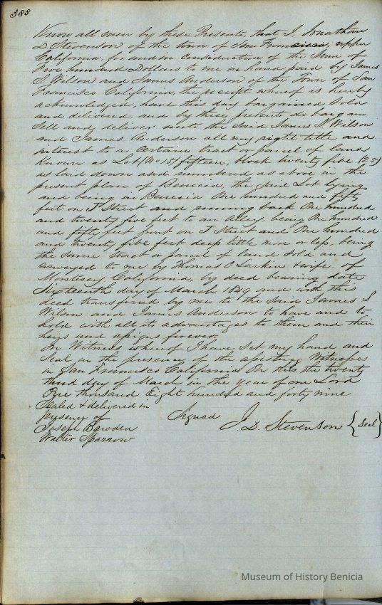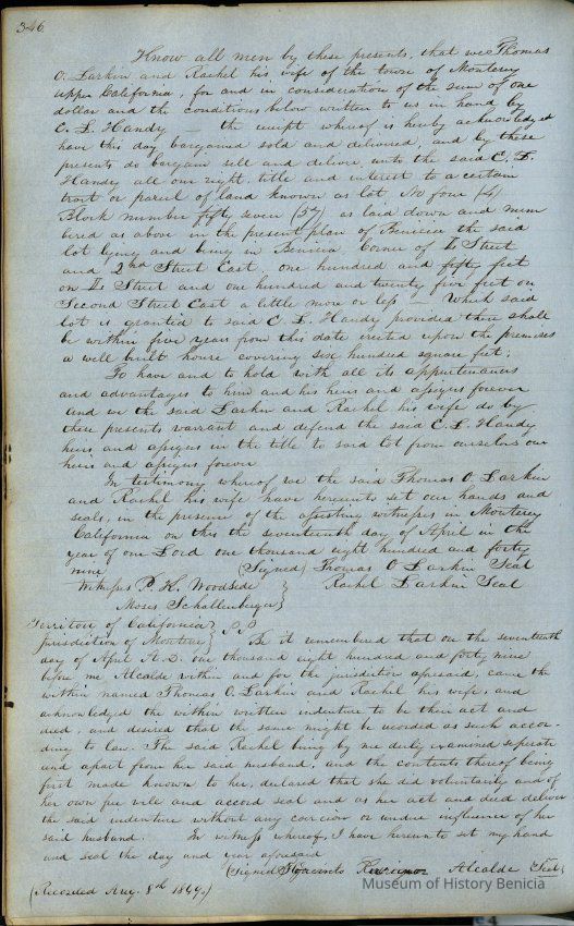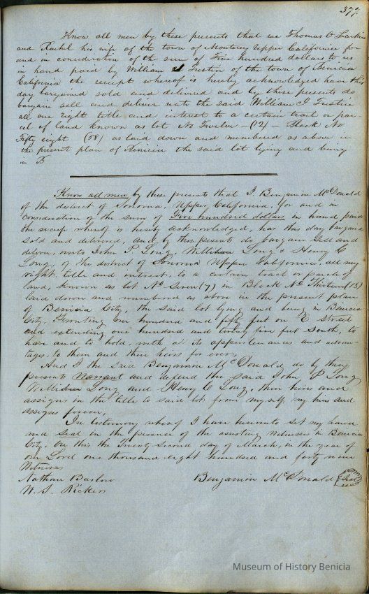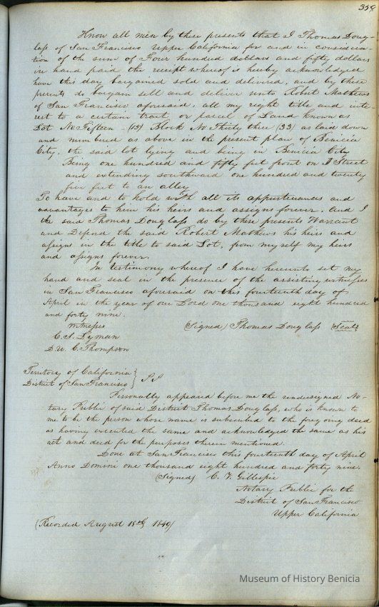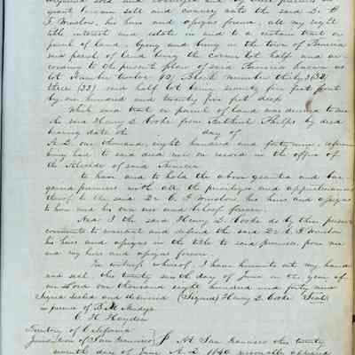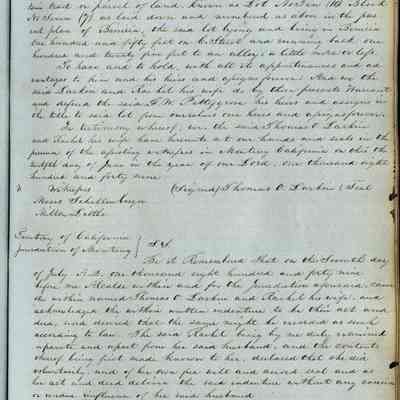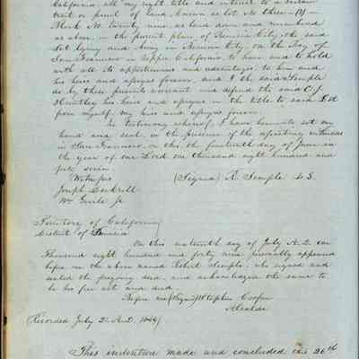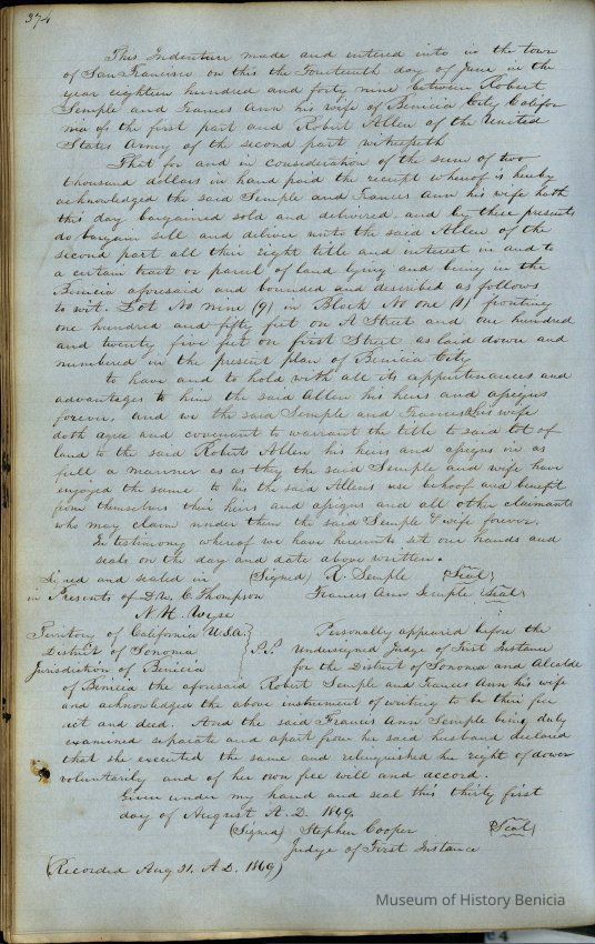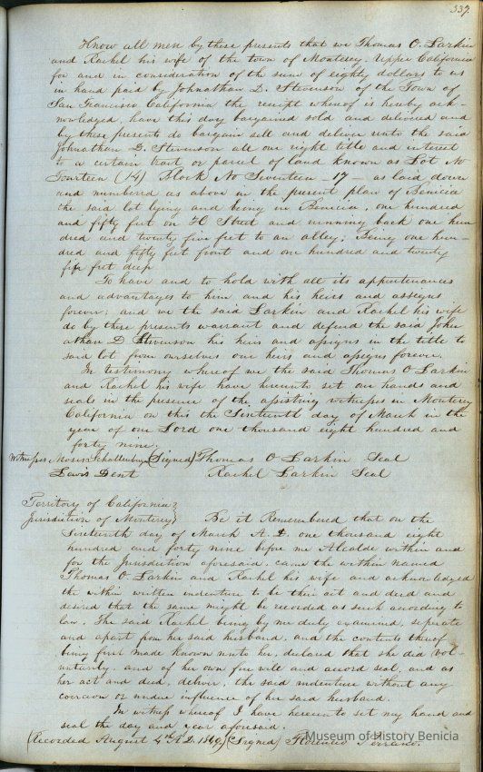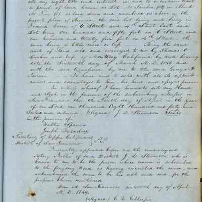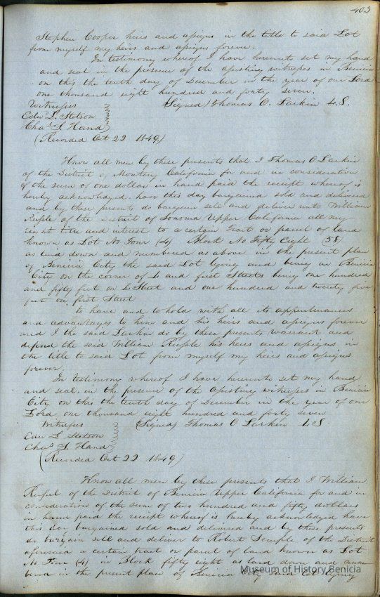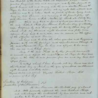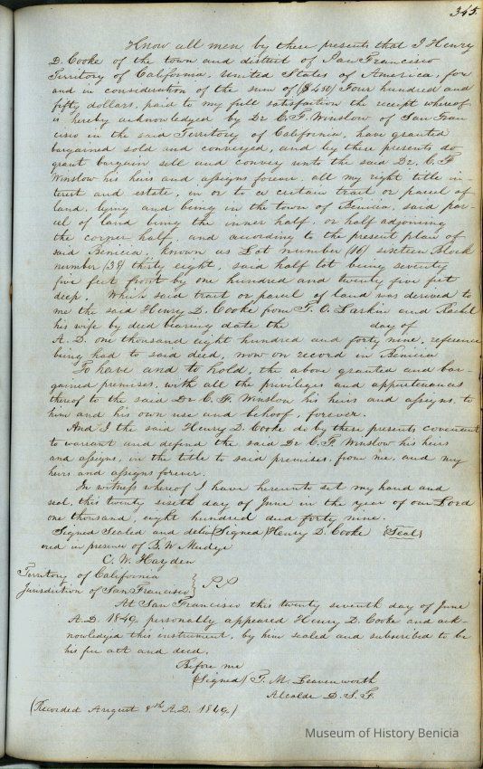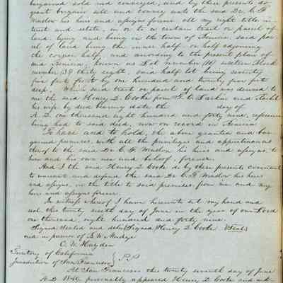 This journal/ledger contains the beginnings of Benicia including: lists and descriptions of first 12 houses in Benicia, a translation of the deed to General Vallejo by Manual Micheltorena, Governor of Calif. (1844); deed to Semple and Larkin by Vallejo (1847); deeds of properties sold by Semple and Larkin from 1847 - 1849