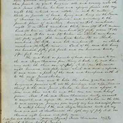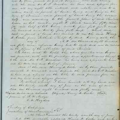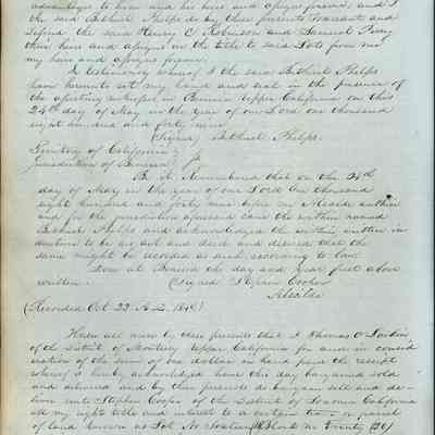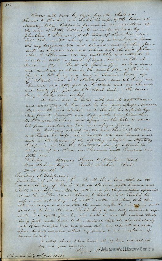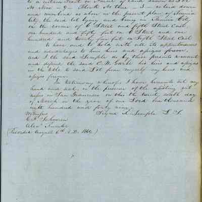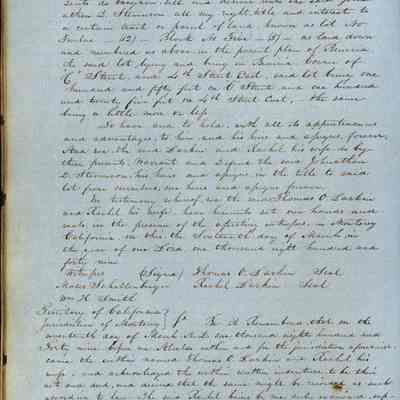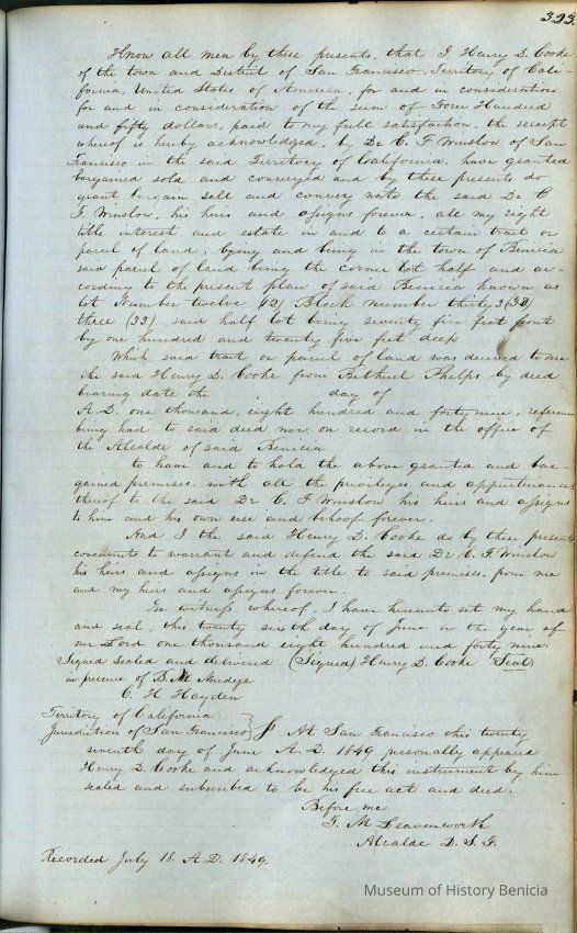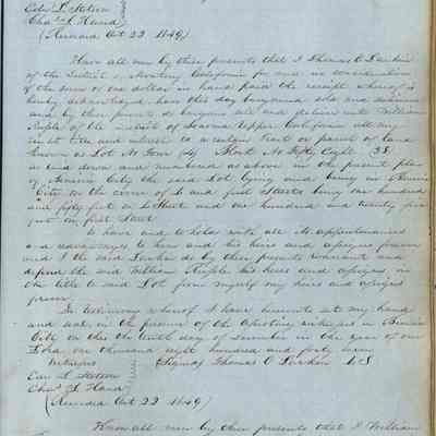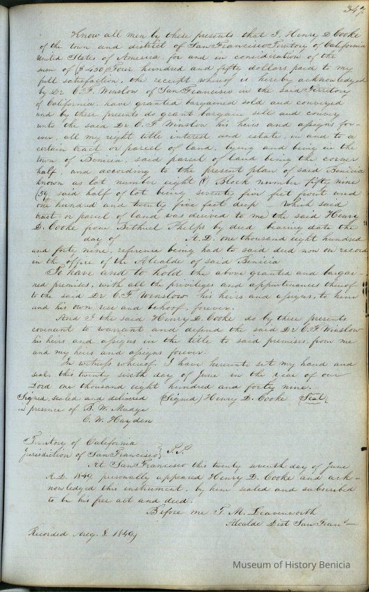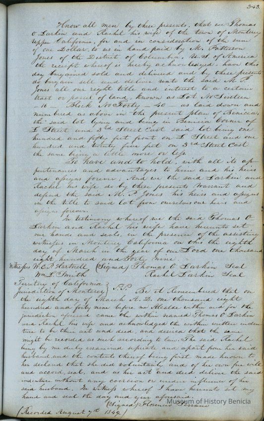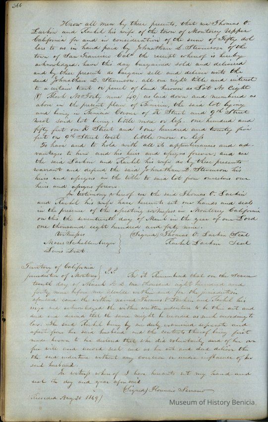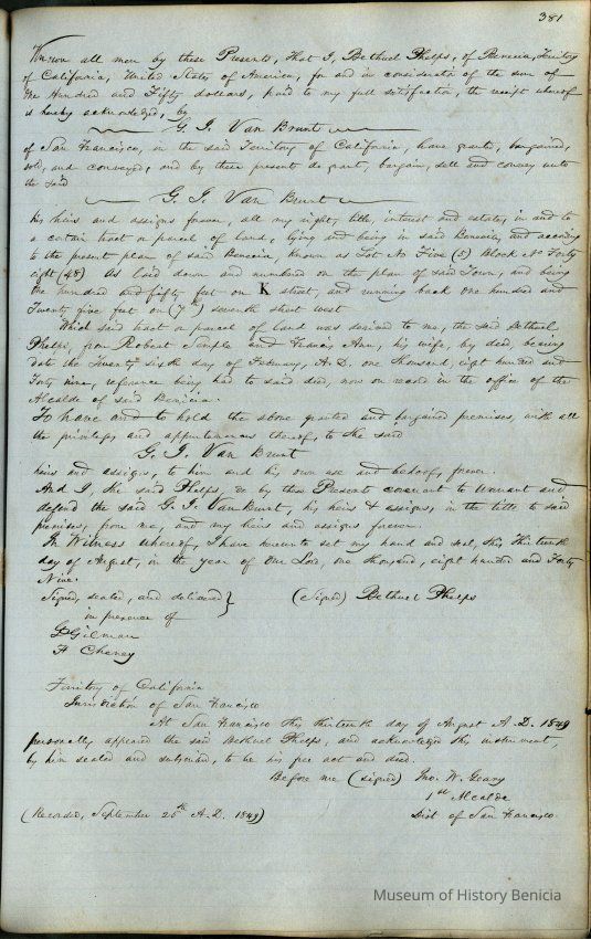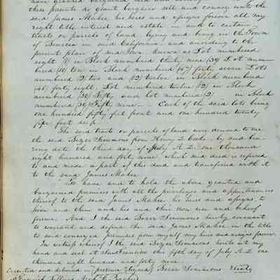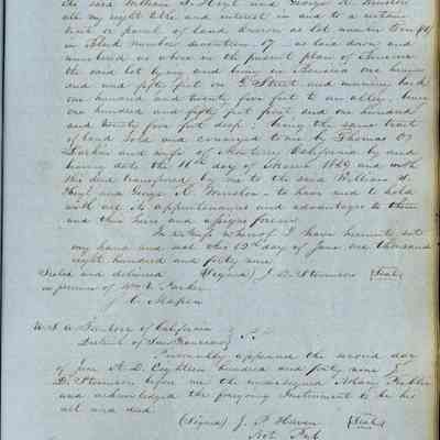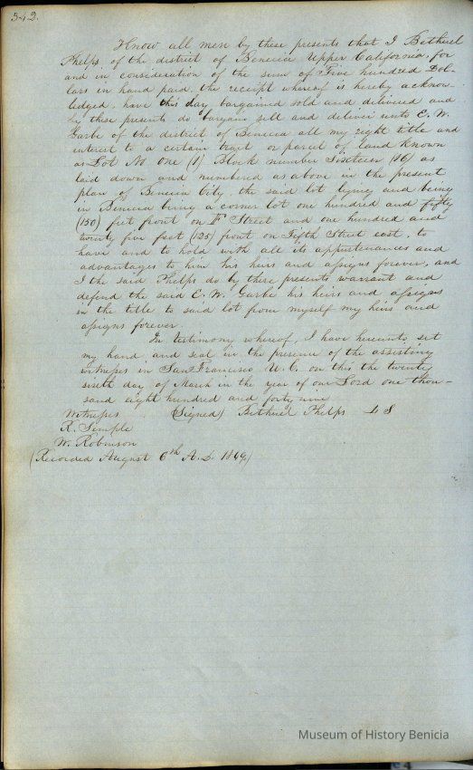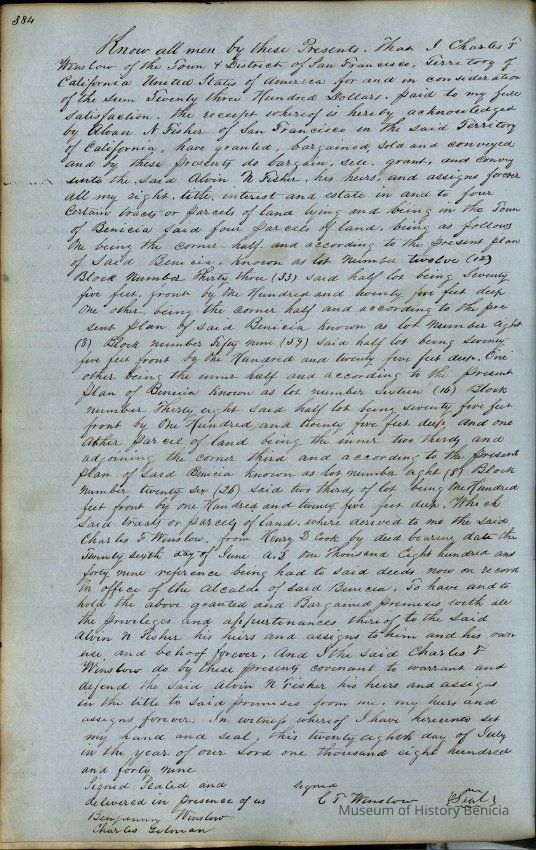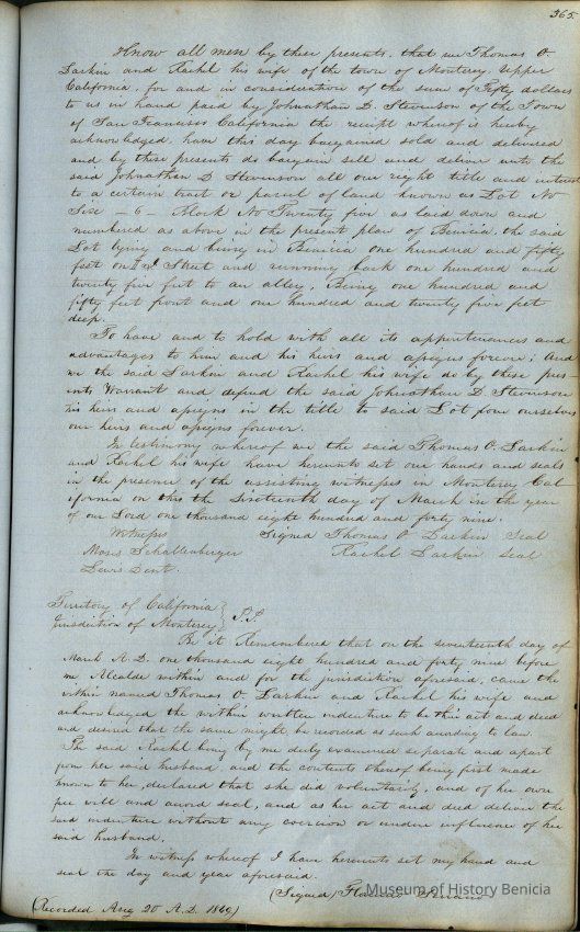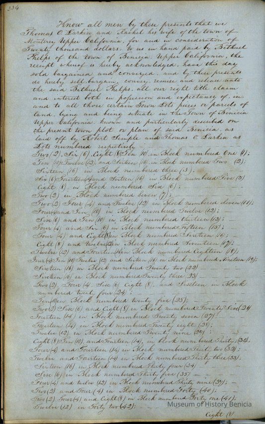 This journal/ledger contains the beginnings of Benicia including: lists and descriptions of first 12 houses in Benicia, a translation of the deed to General Vallejo by Manual Micheltorena, Governor of Calif. (1844); deed to Semple and Larkin by Vallejo (1847); deeds of properties sold by Semple and Larkin from 1847 - 1849