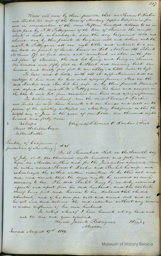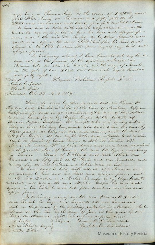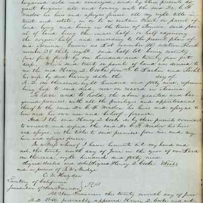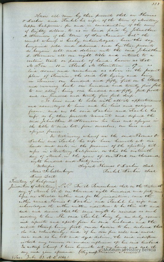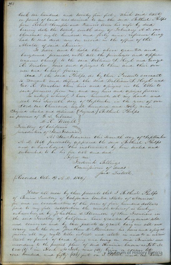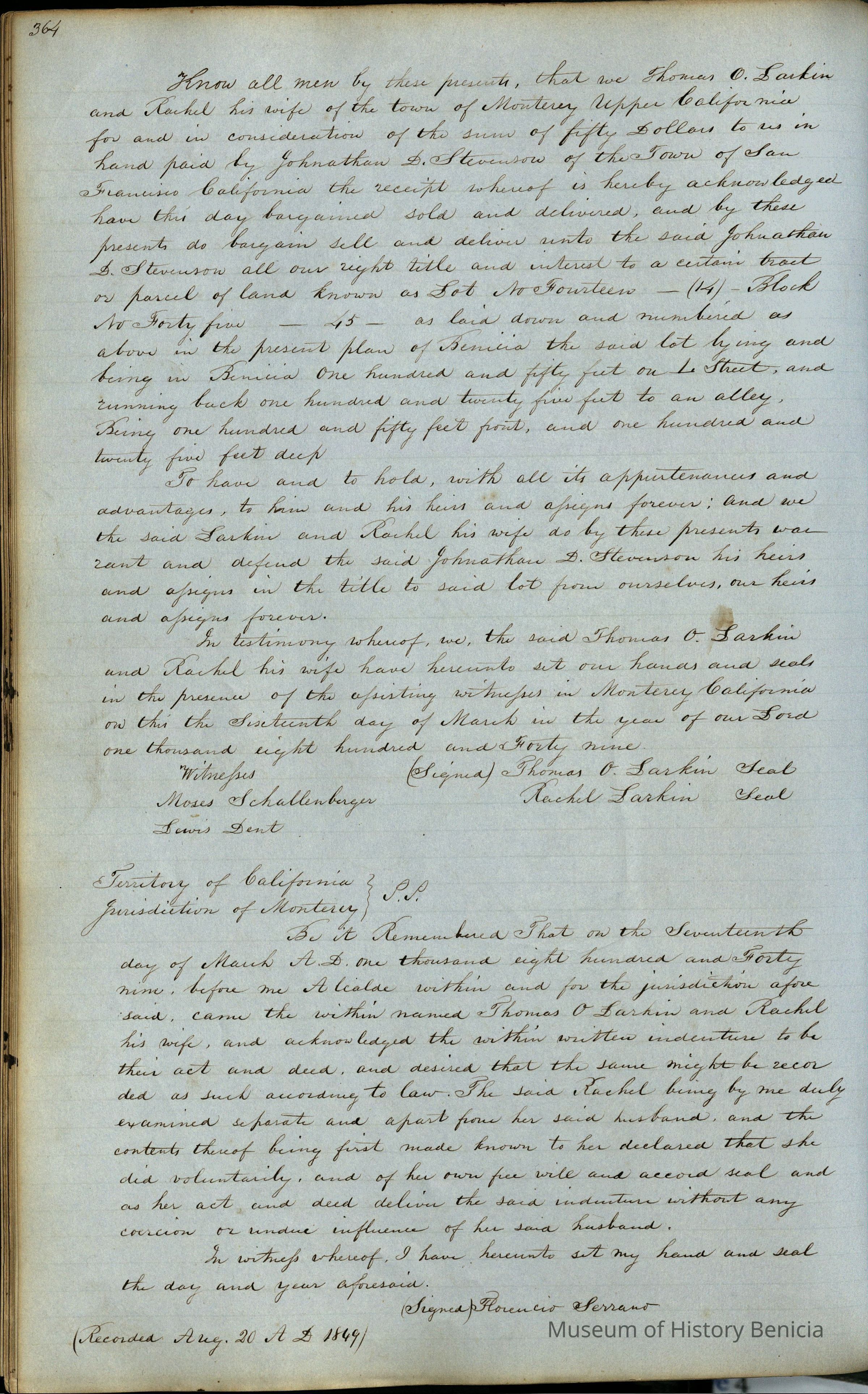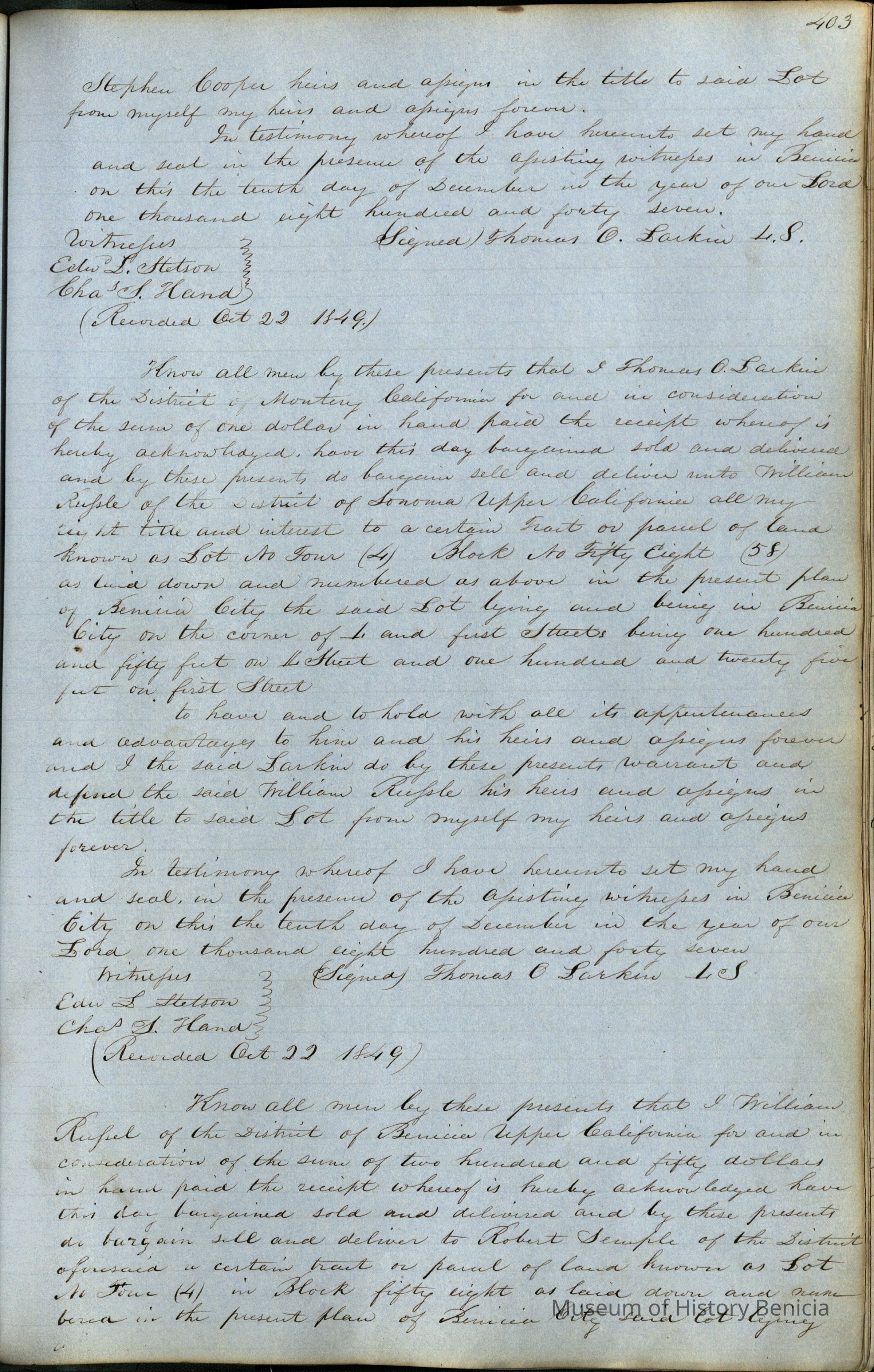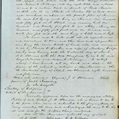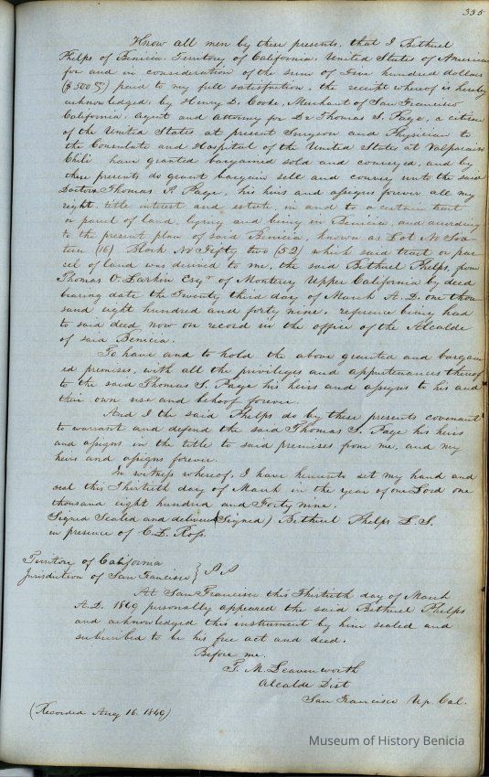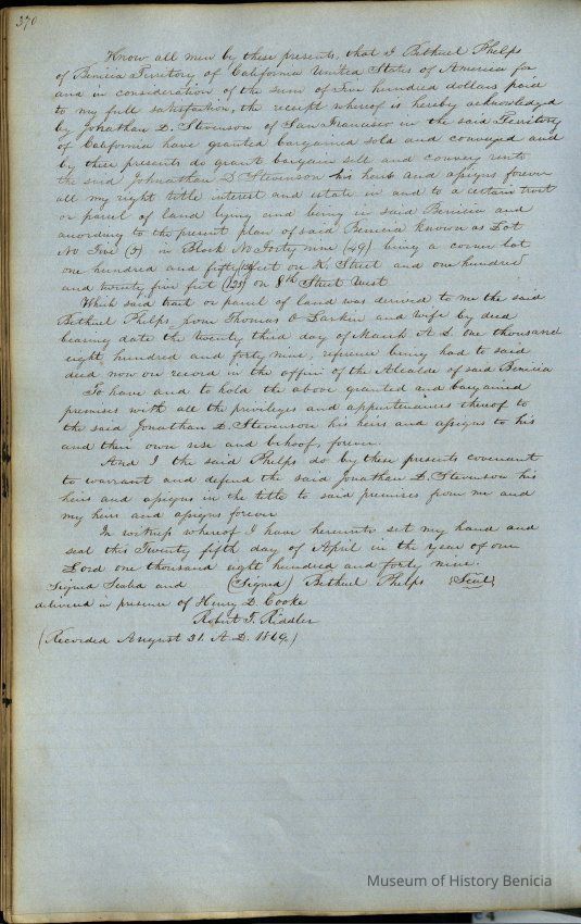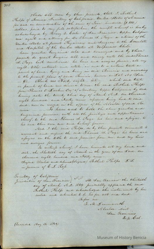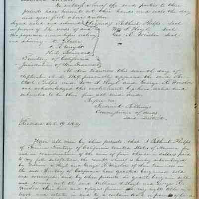 This journal/ledger contains the beginnings of Benicia including: lists and descriptions of first 12 houses in Benicia, a translation of the deed to General Vallejo by Manual Micheltorena, Governor of Calif. (1844); deed to Semple and Larkin by Vallejo (1847); deeds of properties sold by Semple and Larkin from 1847 - 1849