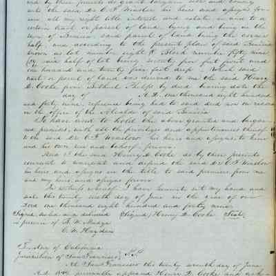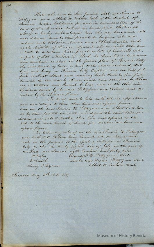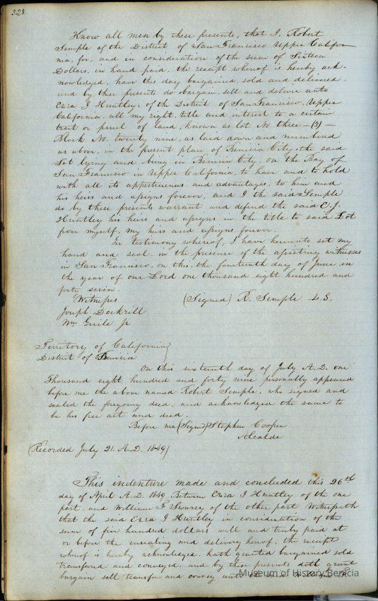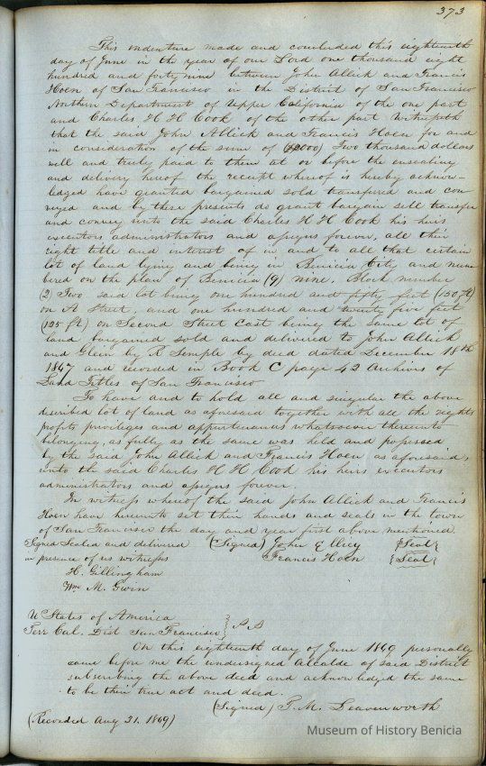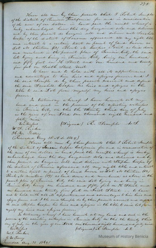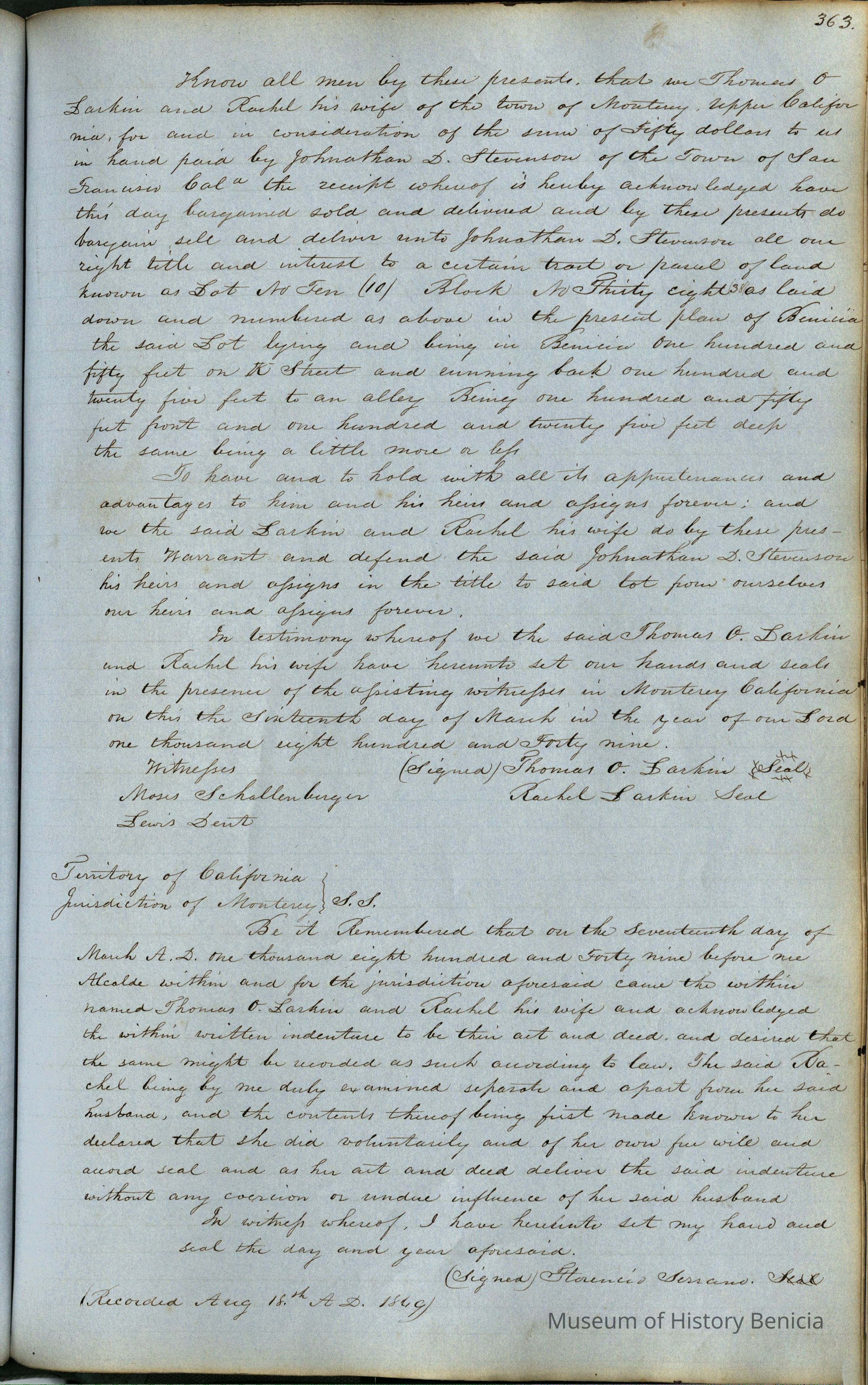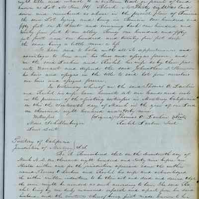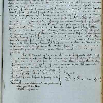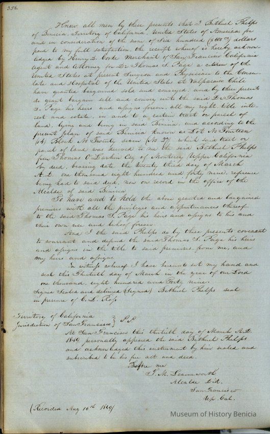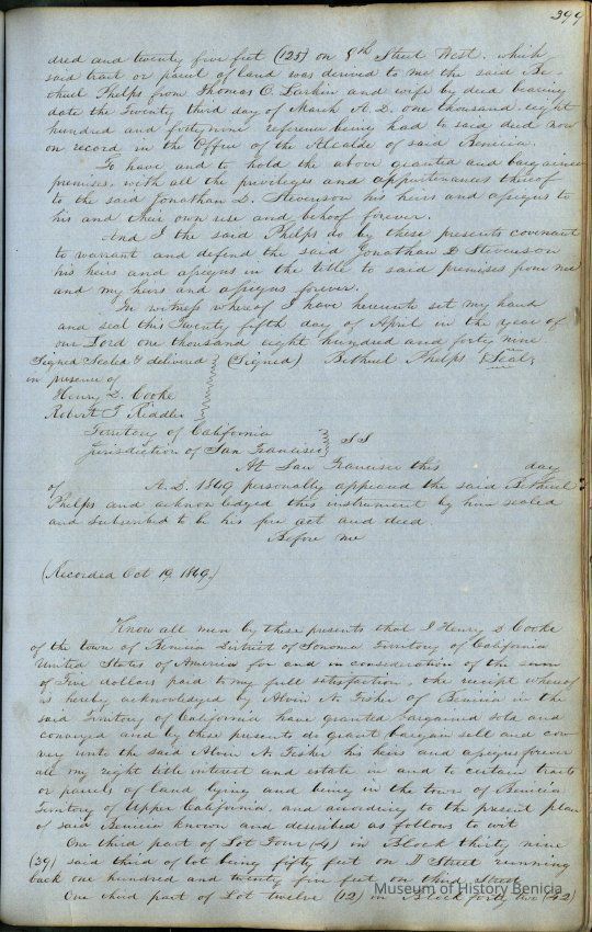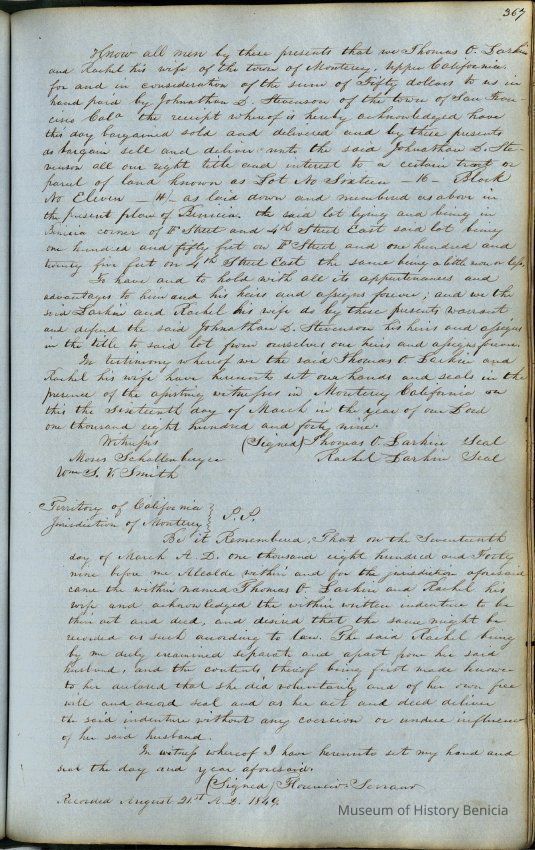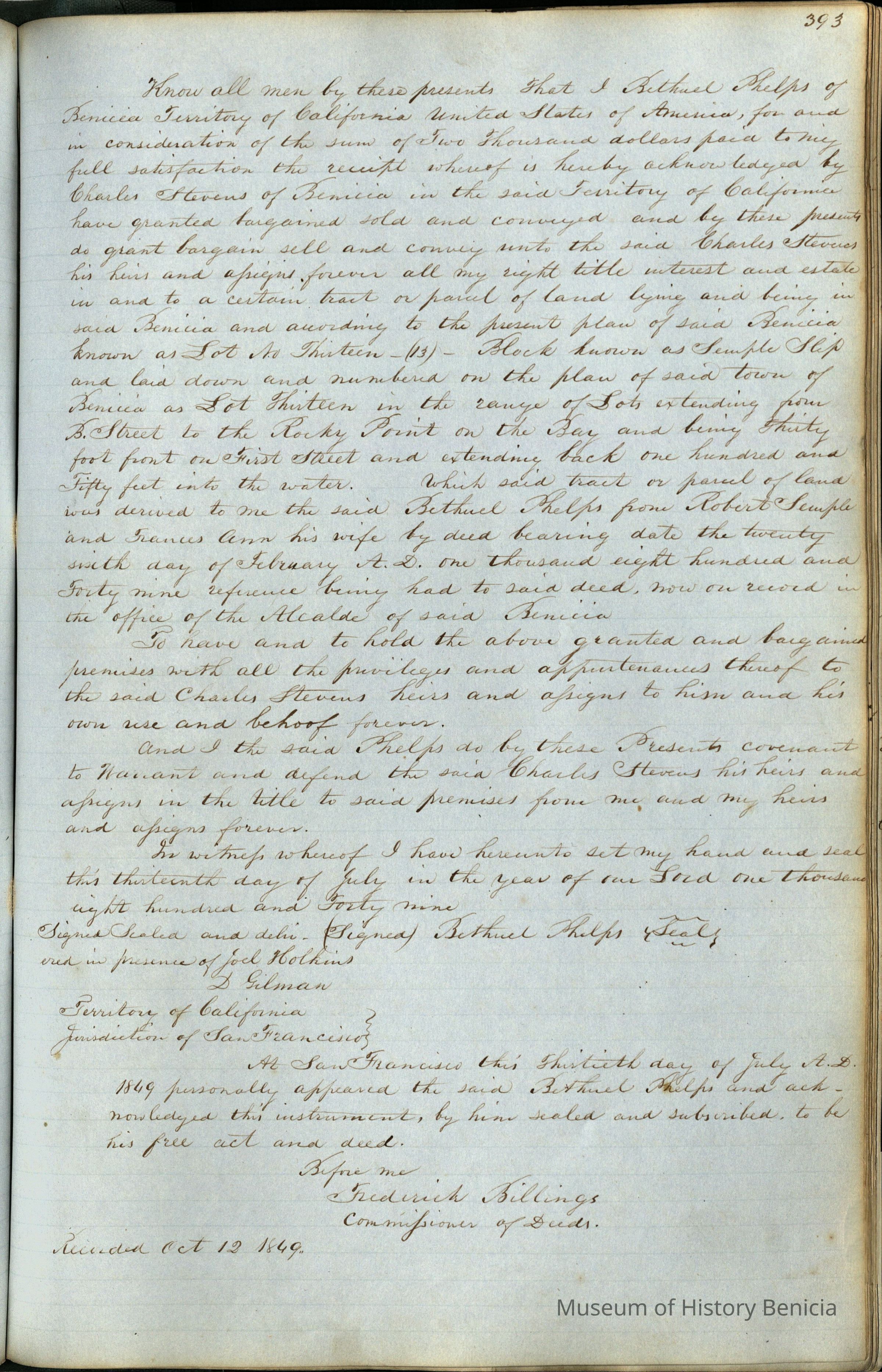 This journal/ledger contains the beginnings of Benicia including: lists and descriptions of first 12 houses in Benicia, a translation of the deed to General Vallejo by Manual Micheltorena, Governor of Calif. (1844); deed to Semple and Larkin by Vallejo (1847); deeds of properties sold by Semple and Larkin from 1847 - 1849