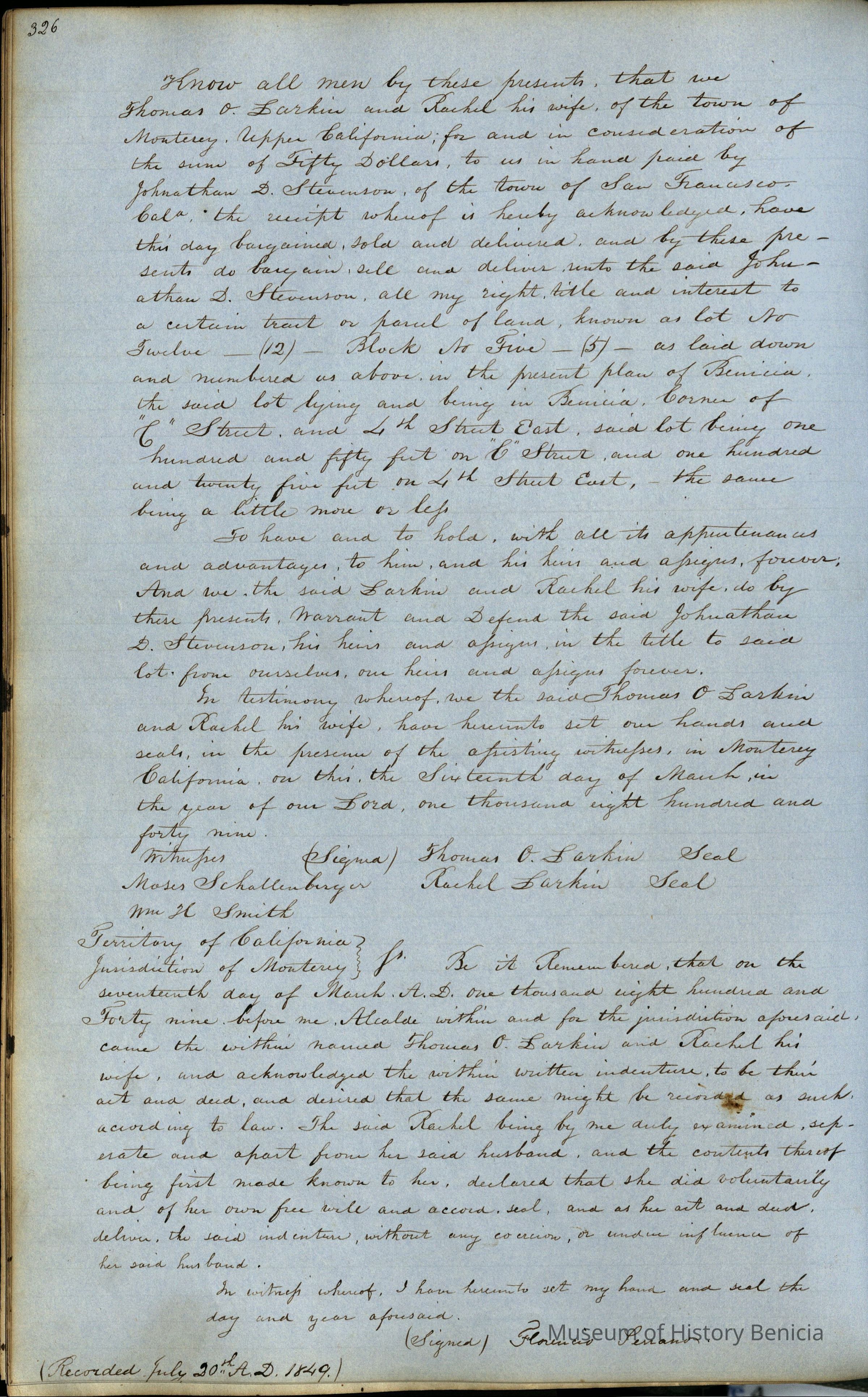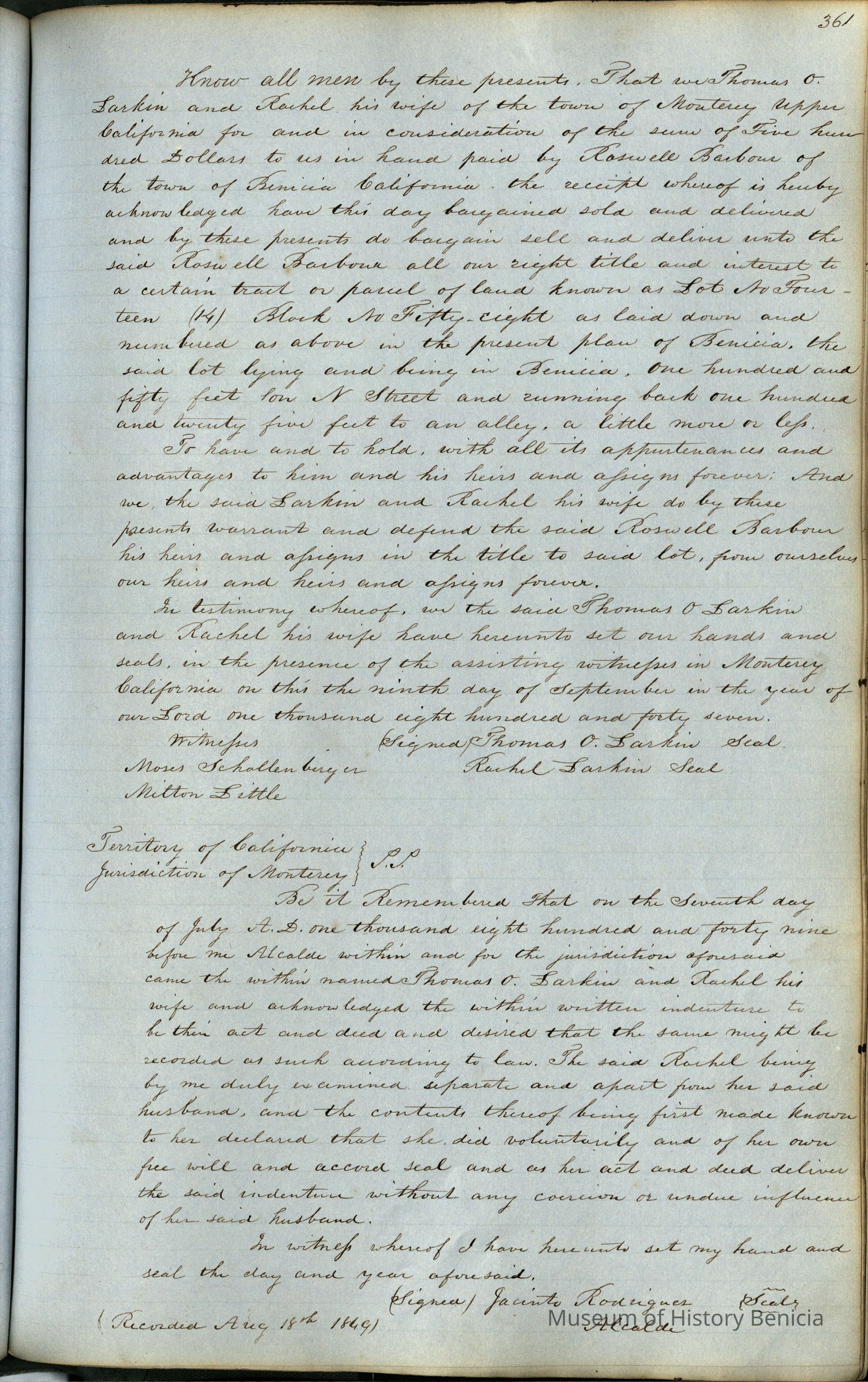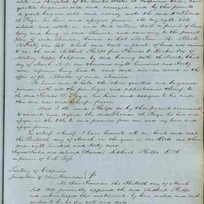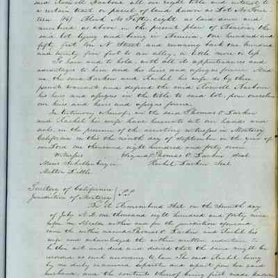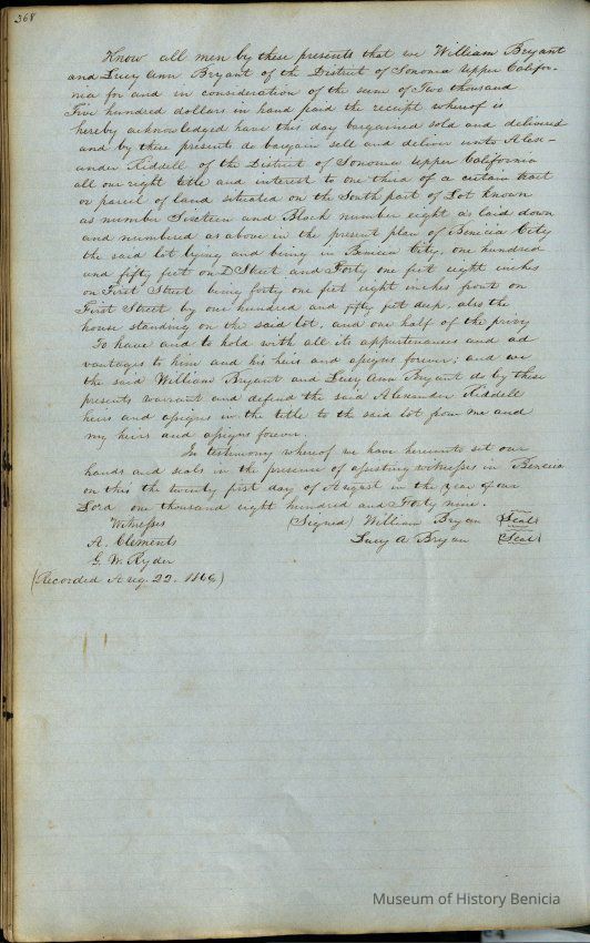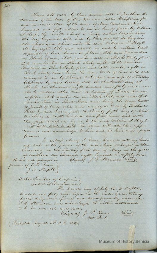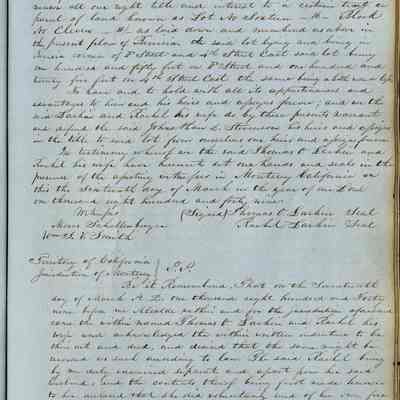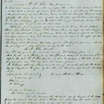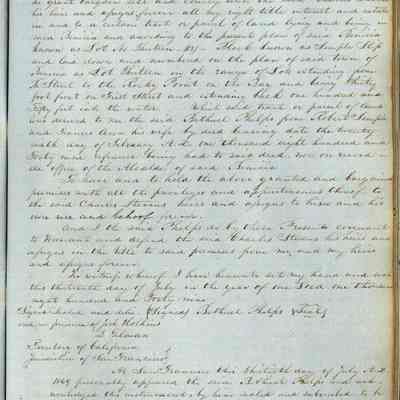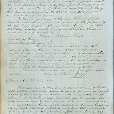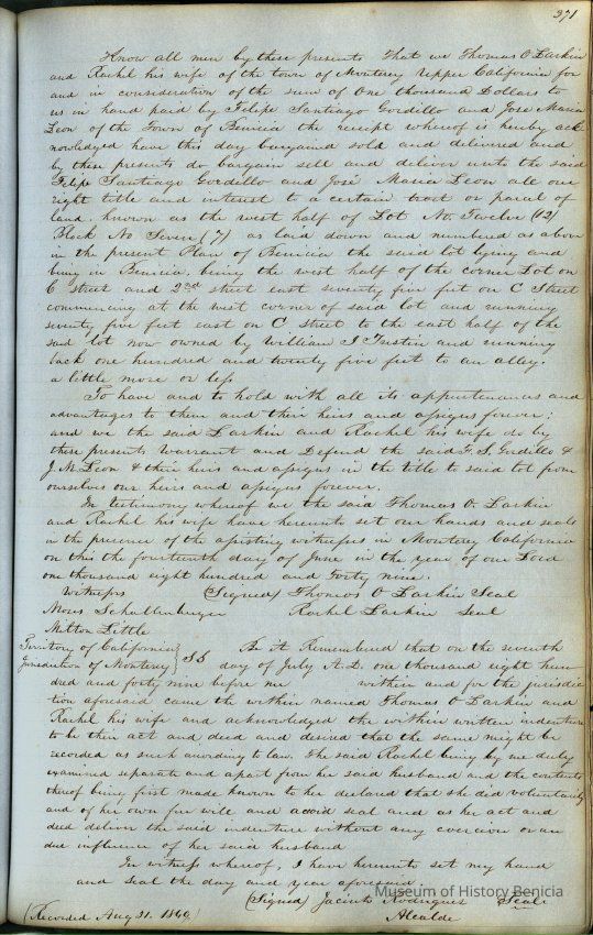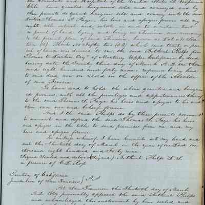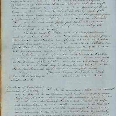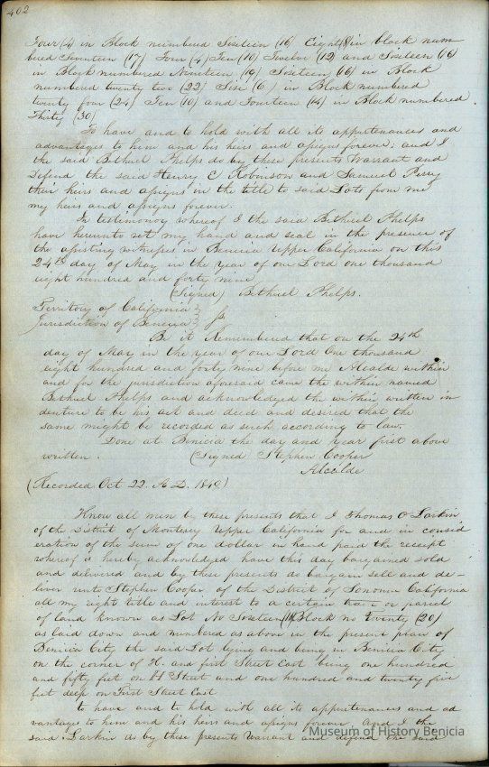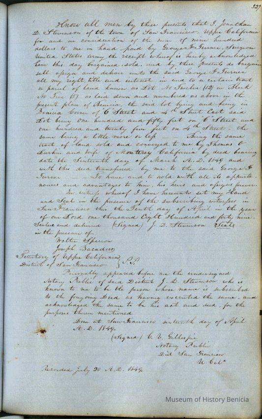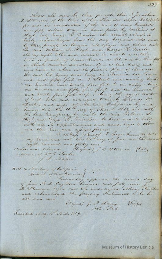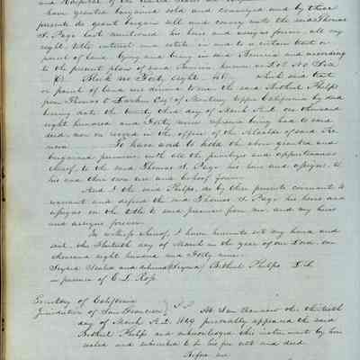 This journal/ledger contains the beginnings of Benicia including: lists and descriptions of first 12 houses in Benicia, a translation of the deed to General Vallejo by Manual Micheltorena, Governor of Calif. (1844); deed to Semple and Larkin by Vallejo (1847); deeds of properties sold by Semple and Larkin from 1847 - 1849