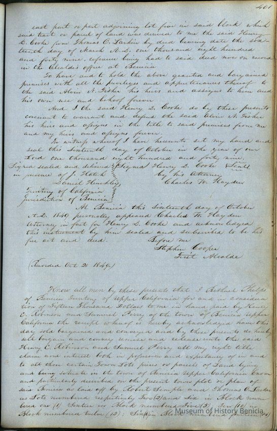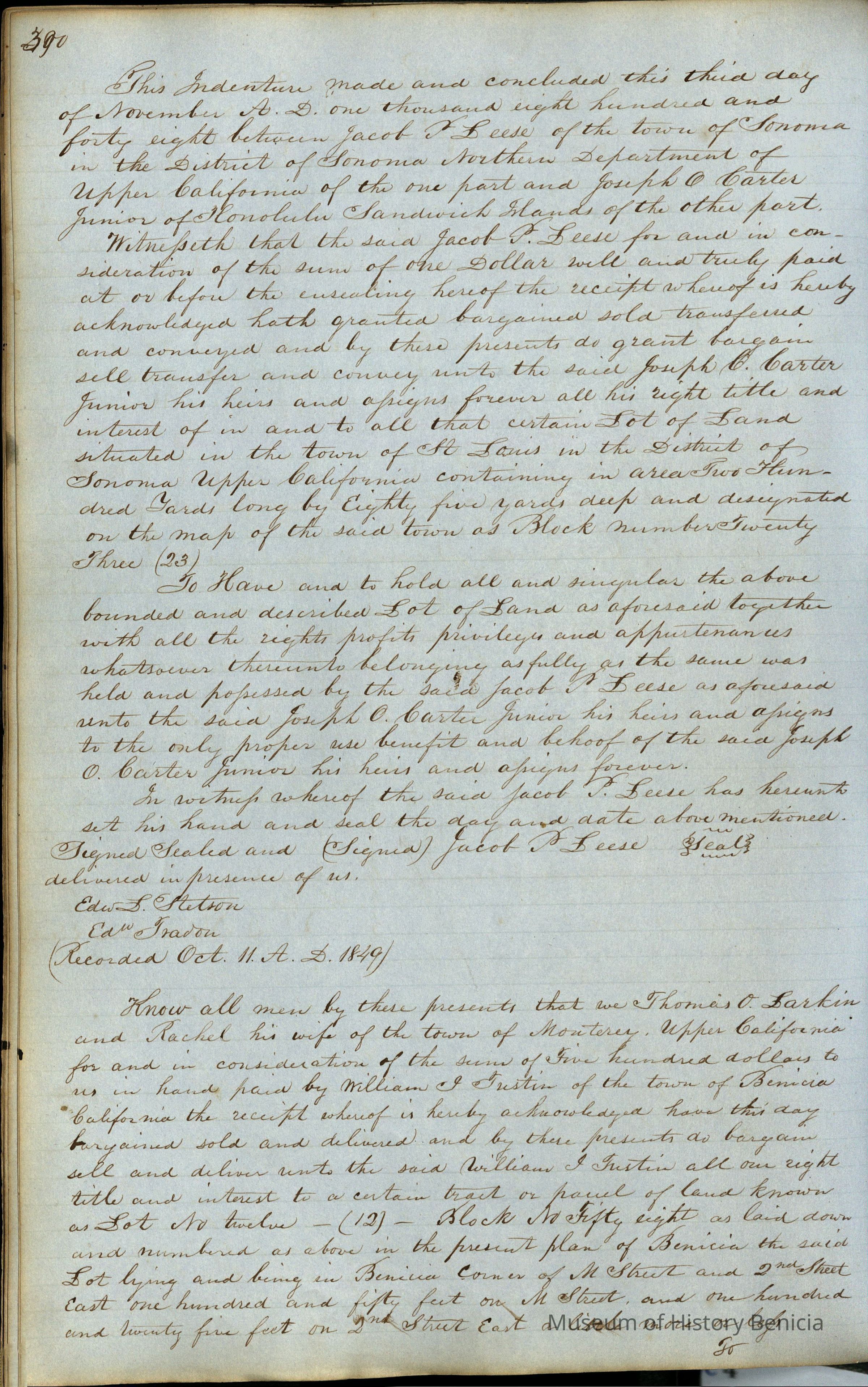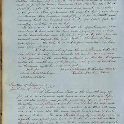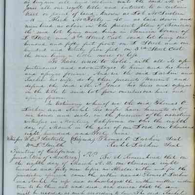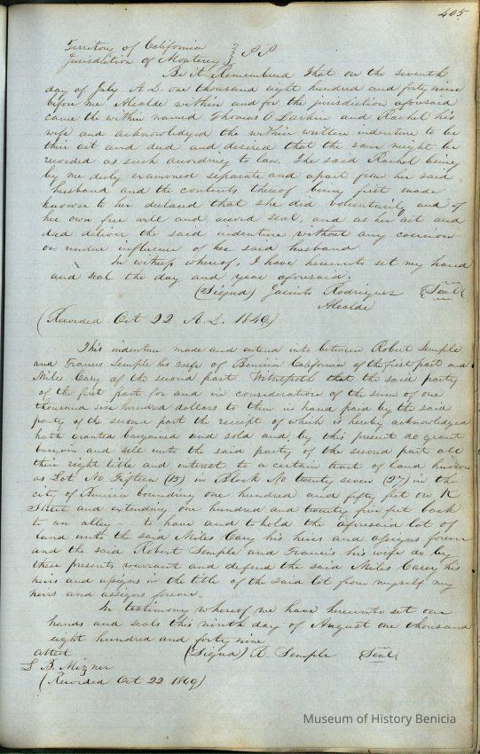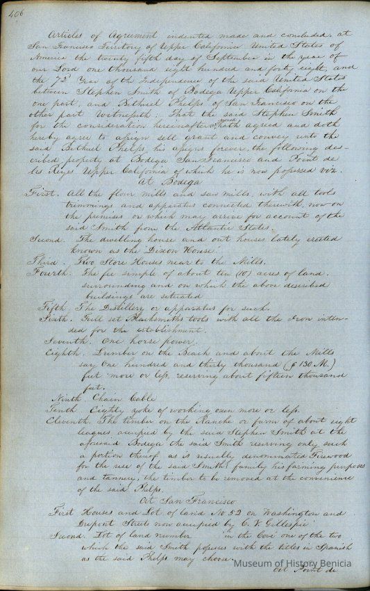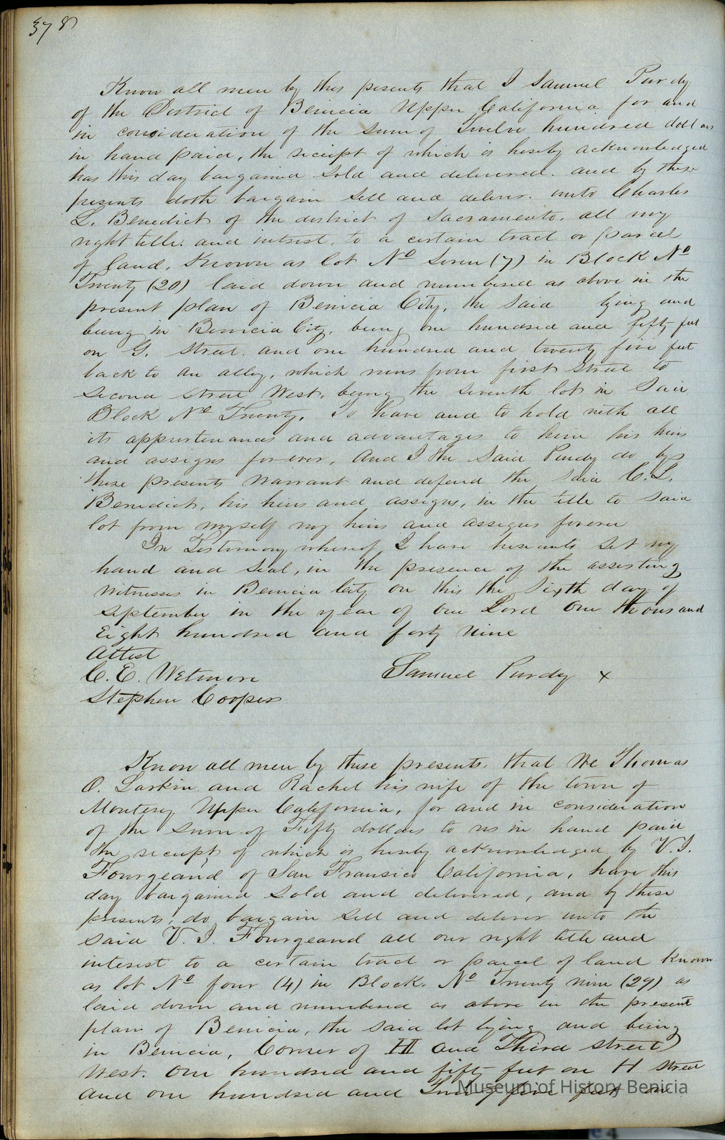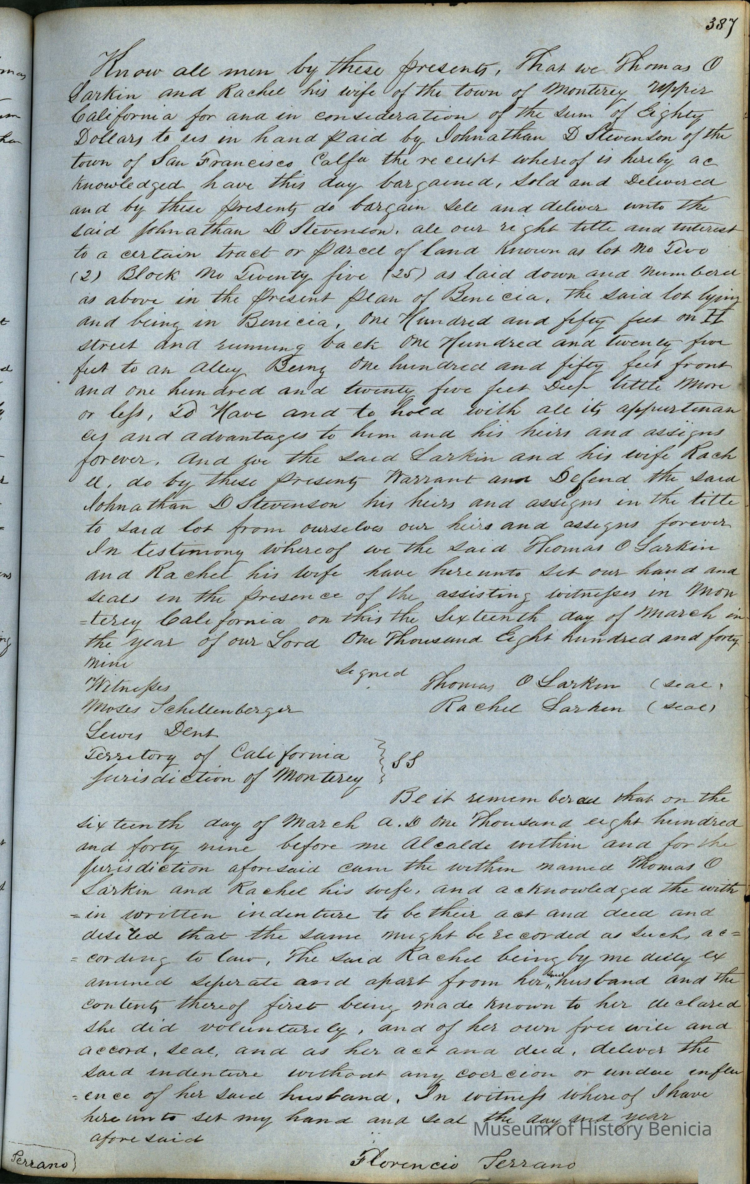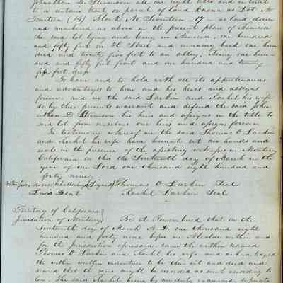 This journal/ledger contains the beginnings of Benicia including: lists and descriptions of first 12 houses in Benicia, a translation of the deed to General Vallejo by Manual Micheltorena, Governor of Calif. (1844); deed to Semple and Larkin by Vallejo (1847); deeds of properties sold by Semple and Larkin from 1847 - 1849