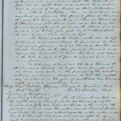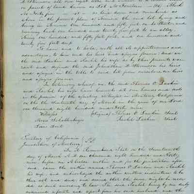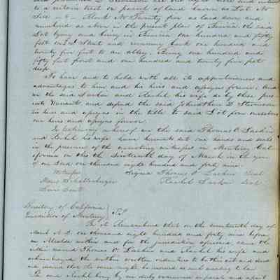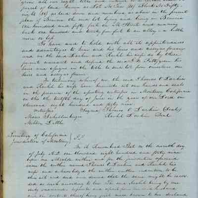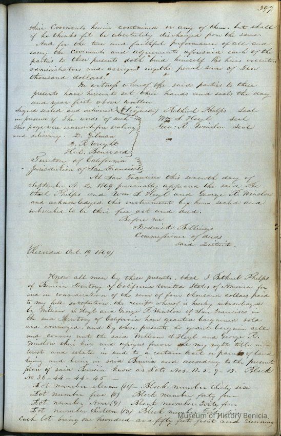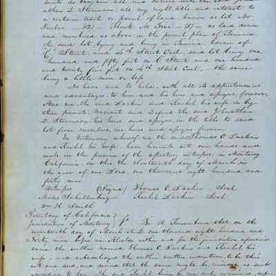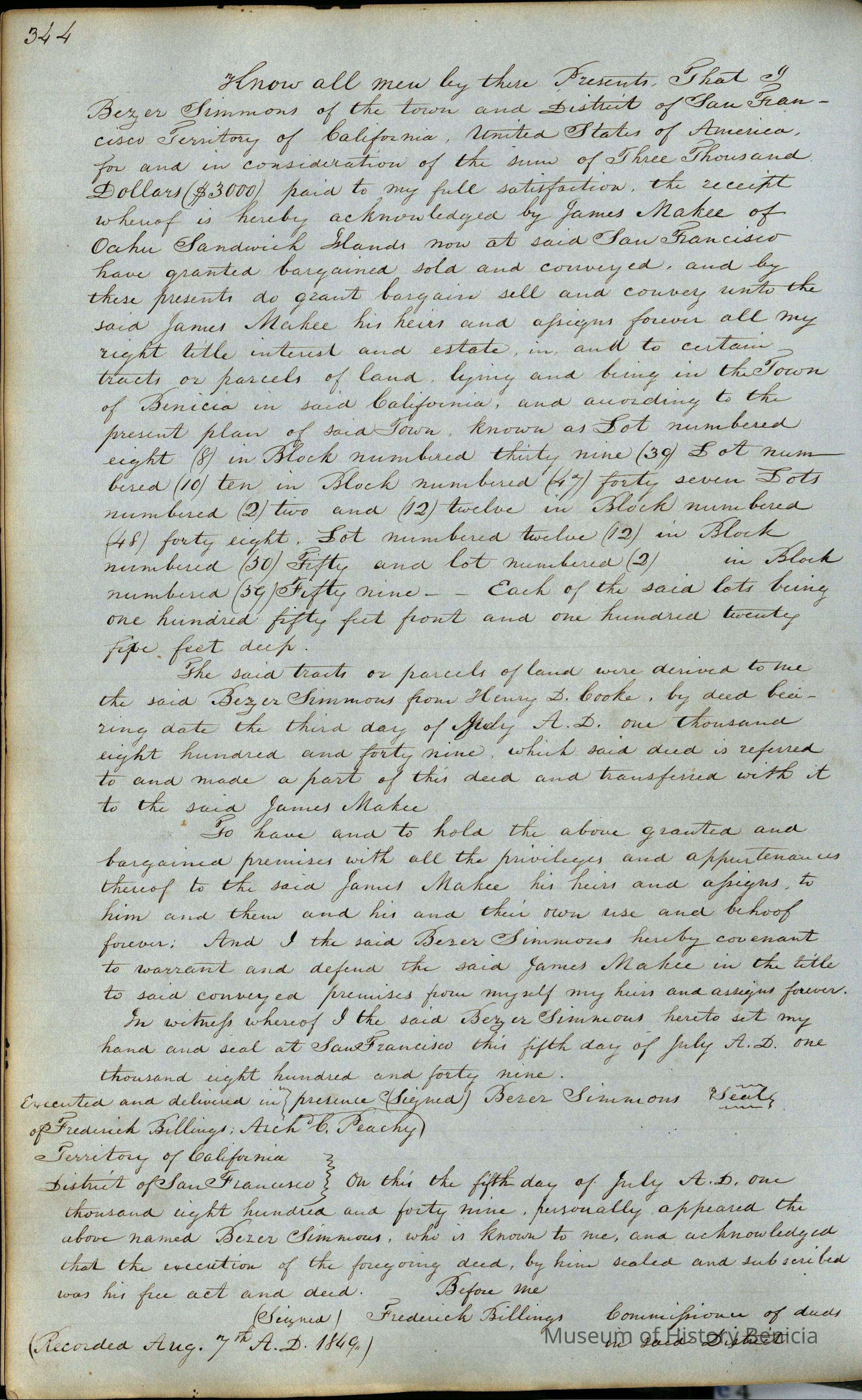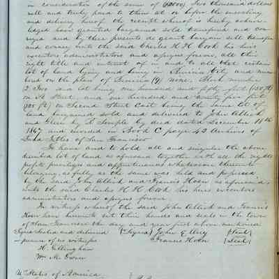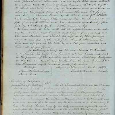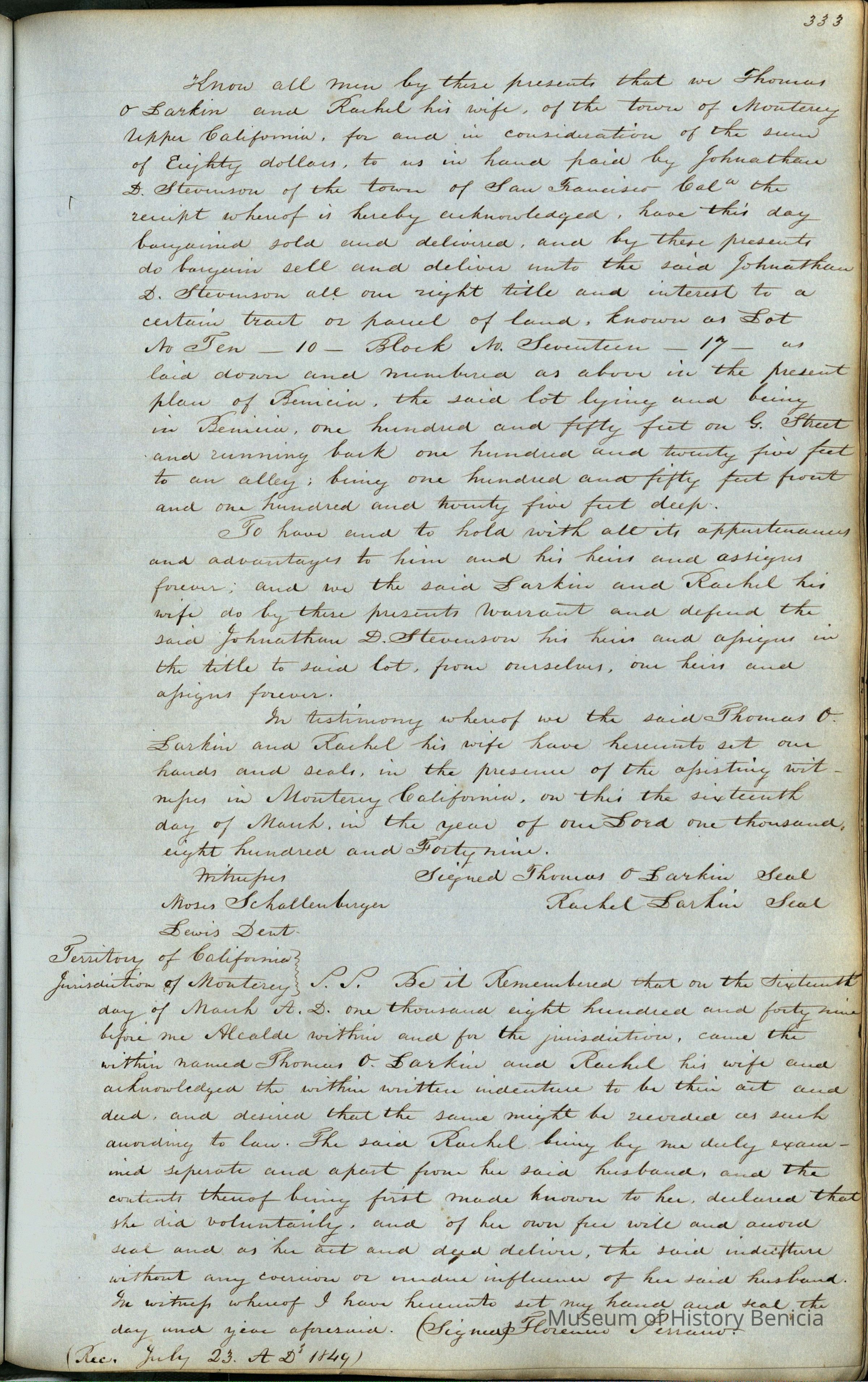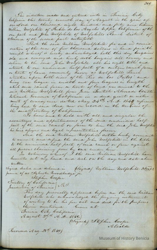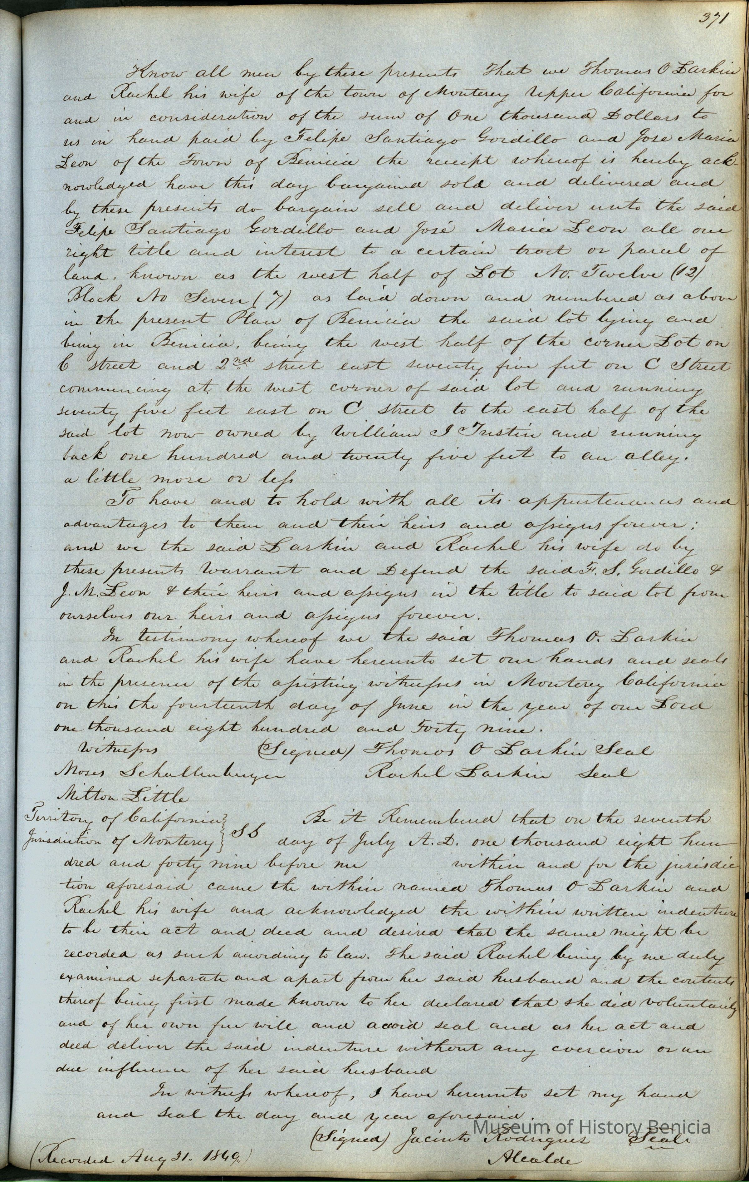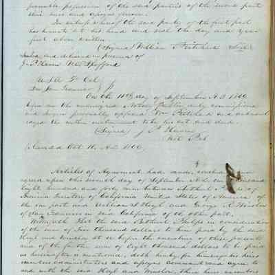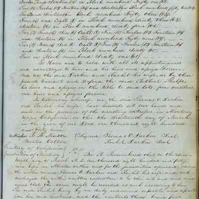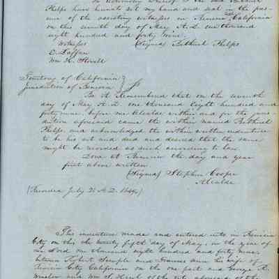 This journal/ledger contains the beginnings of Benicia including: lists and descriptions of first 12 houses in Benicia, a translation of the deed to General Vallejo by Manual Micheltorena, Governor of Calif. (1844); deed to Semple and Larkin by Vallejo (1847); deeds of properties sold by Semple and Larkin from 1847 - 1849