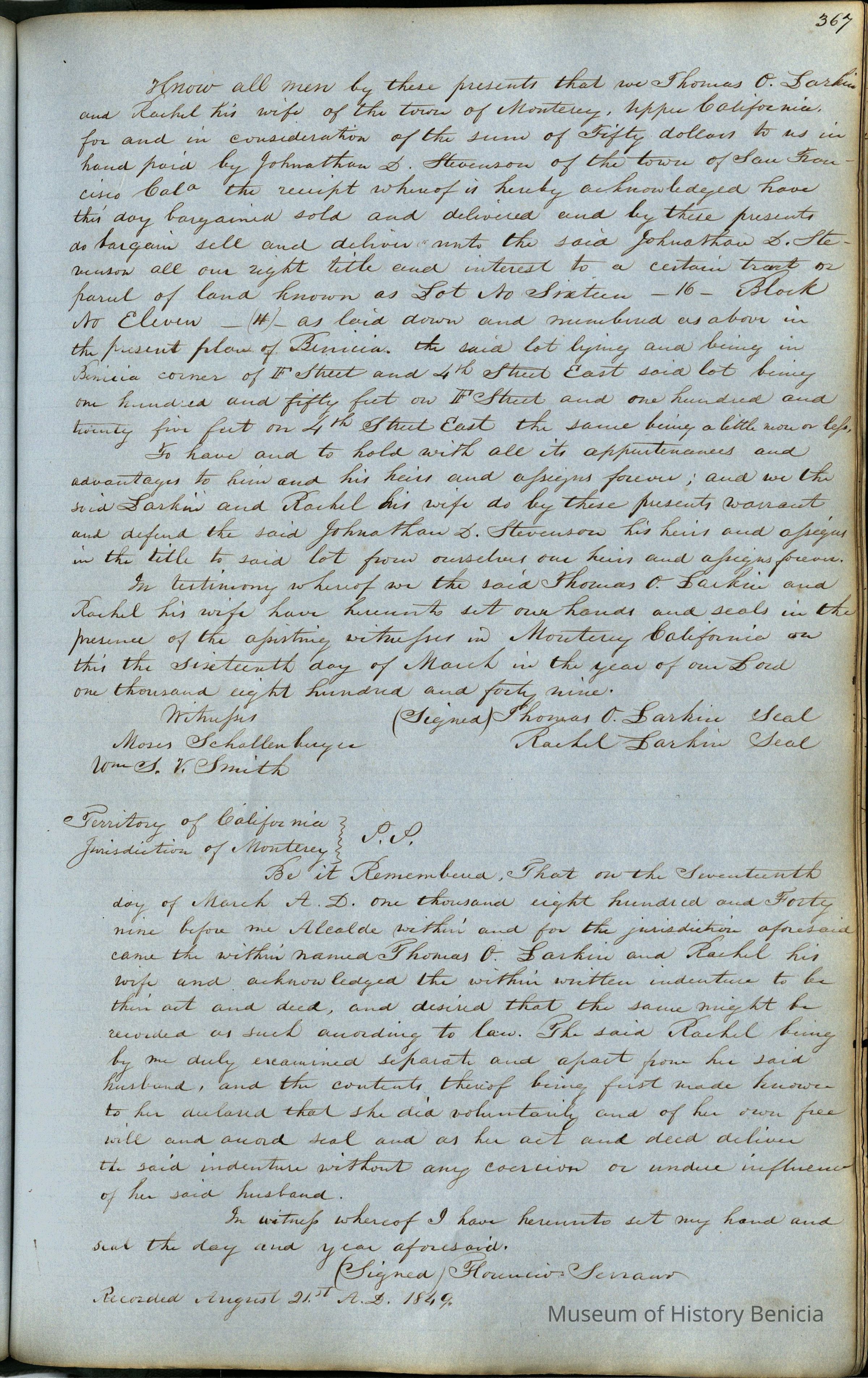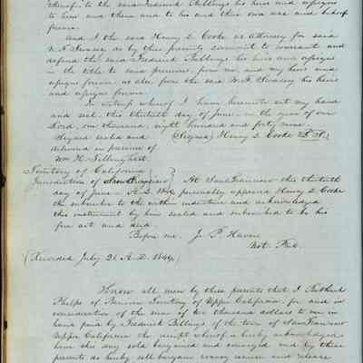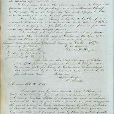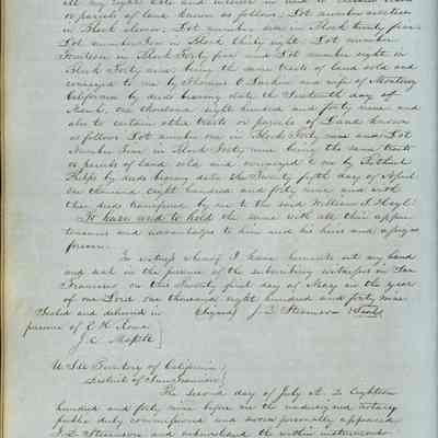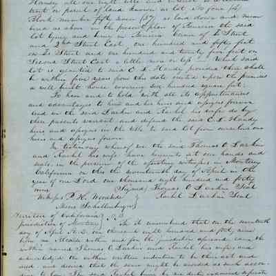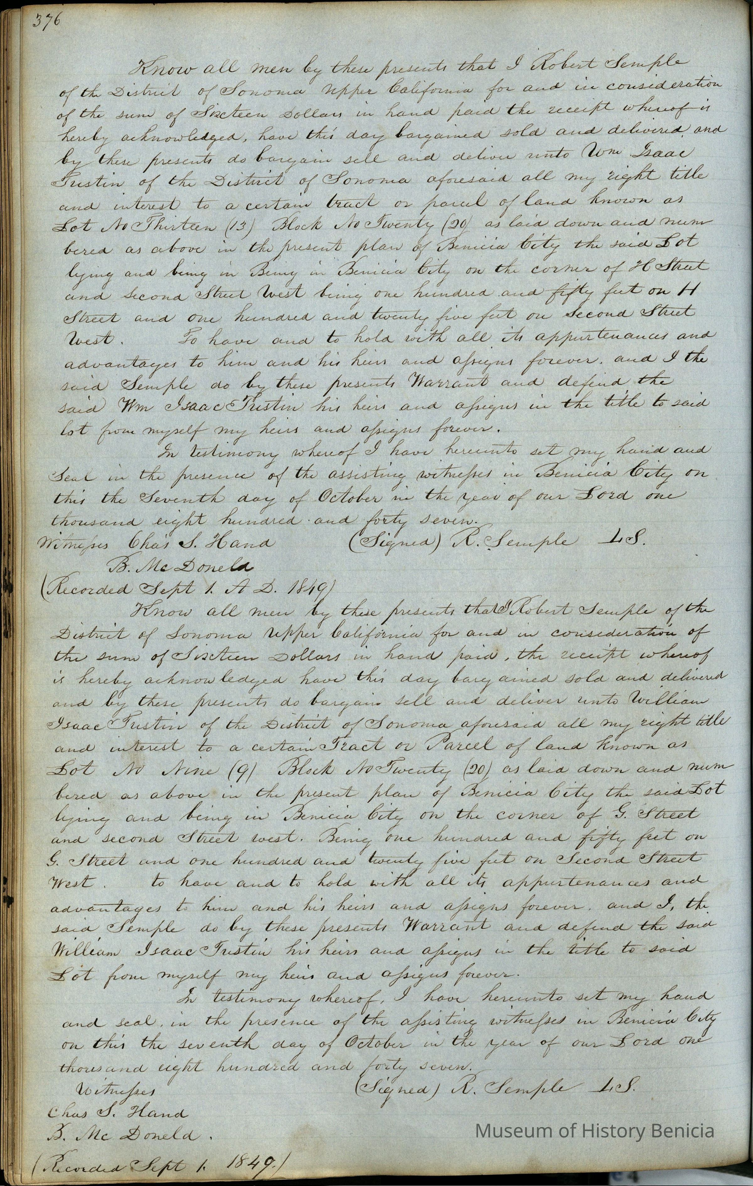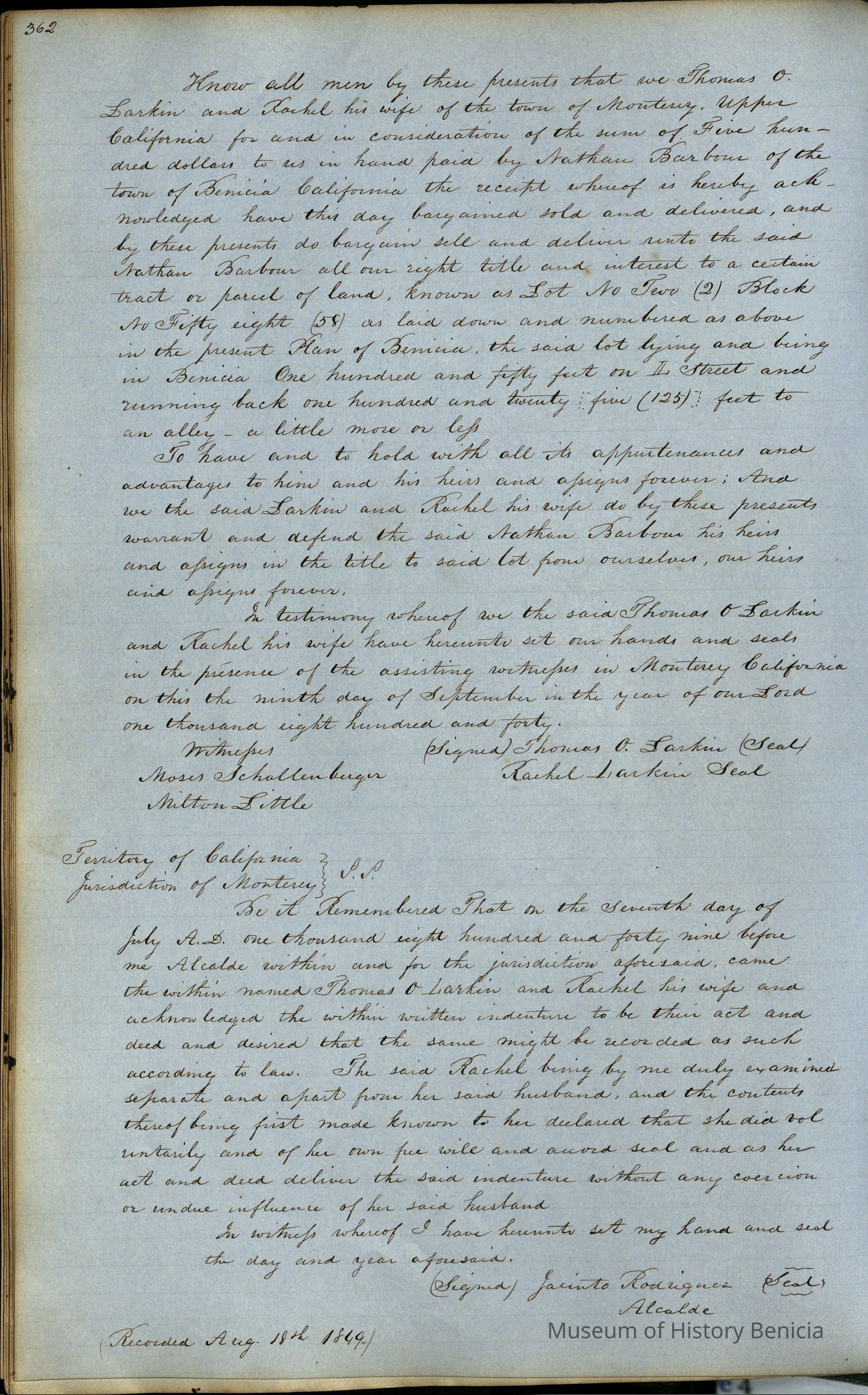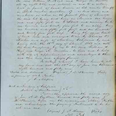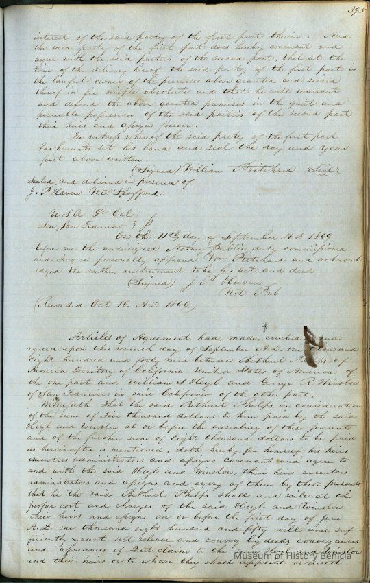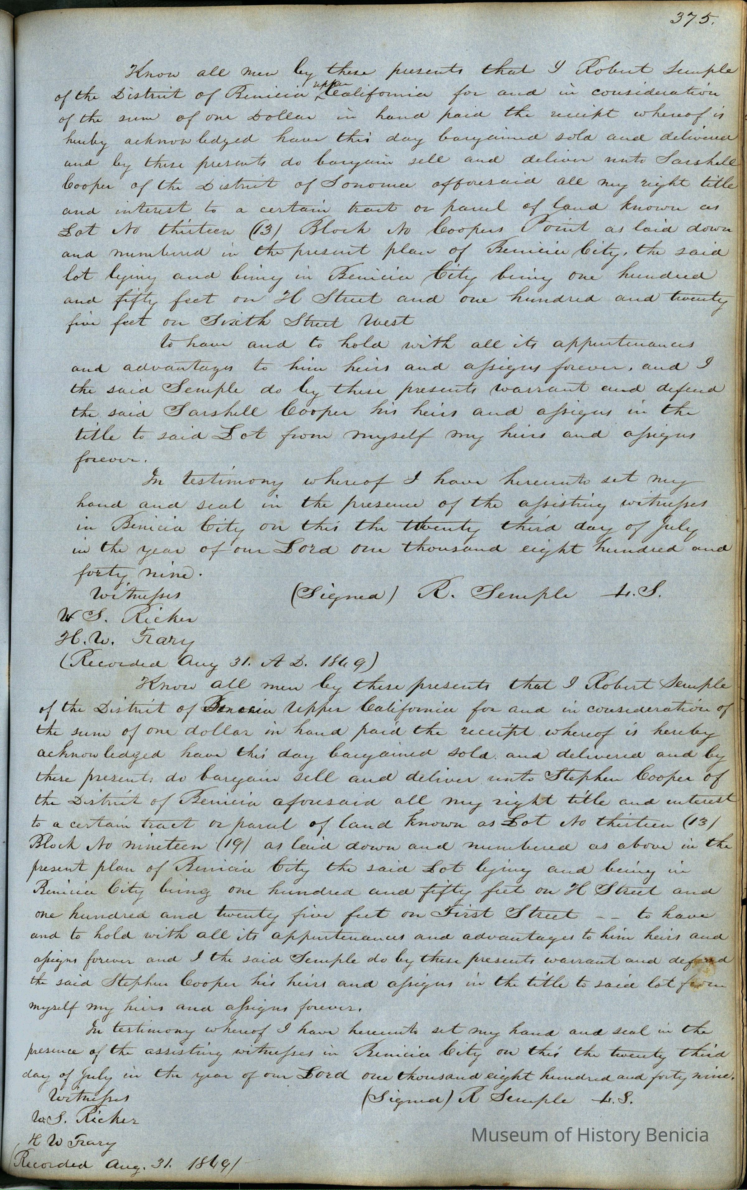 This journal/ledger contains the beginnings of Benicia including: lists and descriptions of first 12 houses in Benicia, a translation of the deed to General Vallejo by Manual Micheltorena, Governor of Calif. (1844); deed to Semple and Larkin by Vallejo (1847); deeds of properties sold by Semple and Larkin from 1847 - 1849