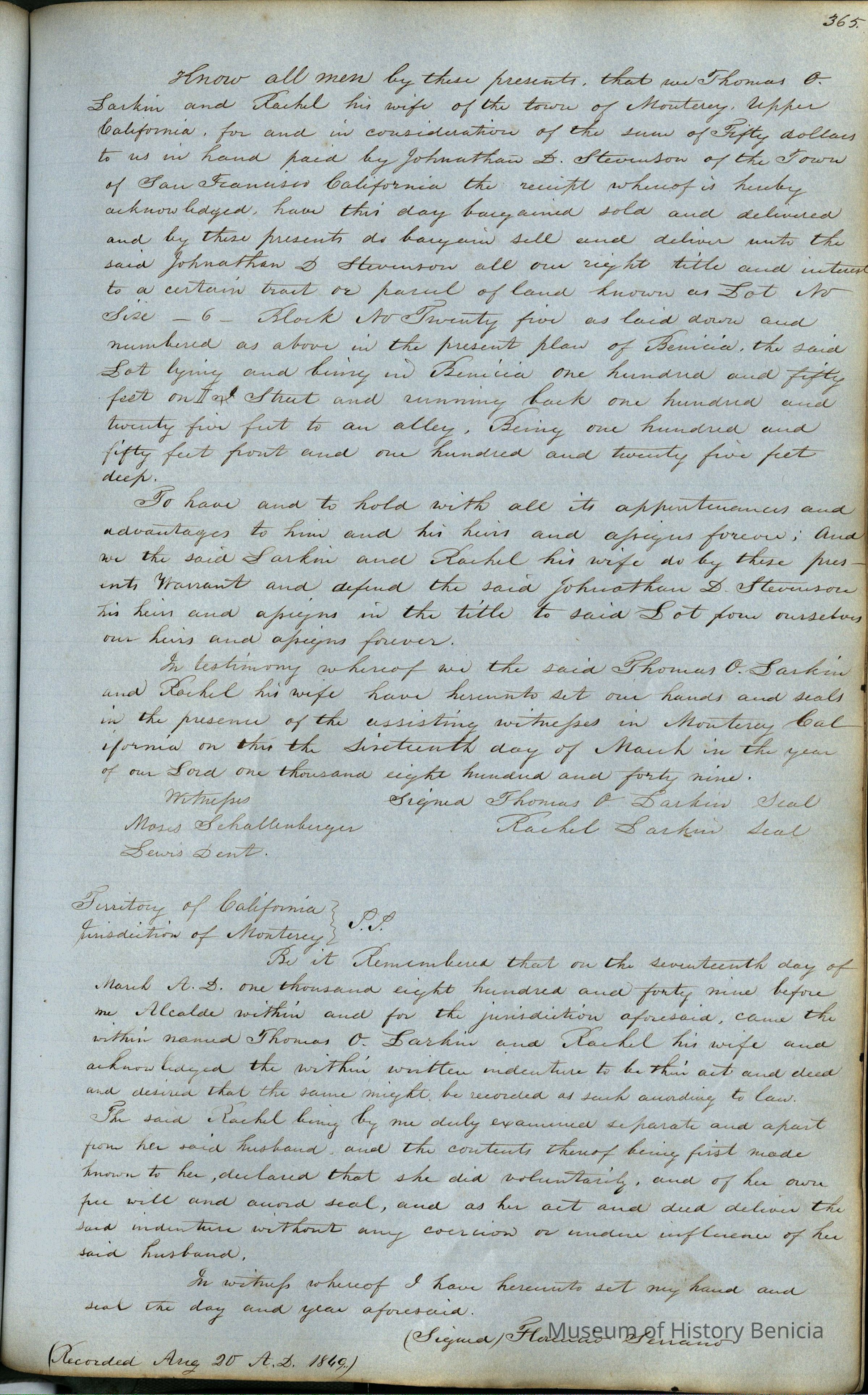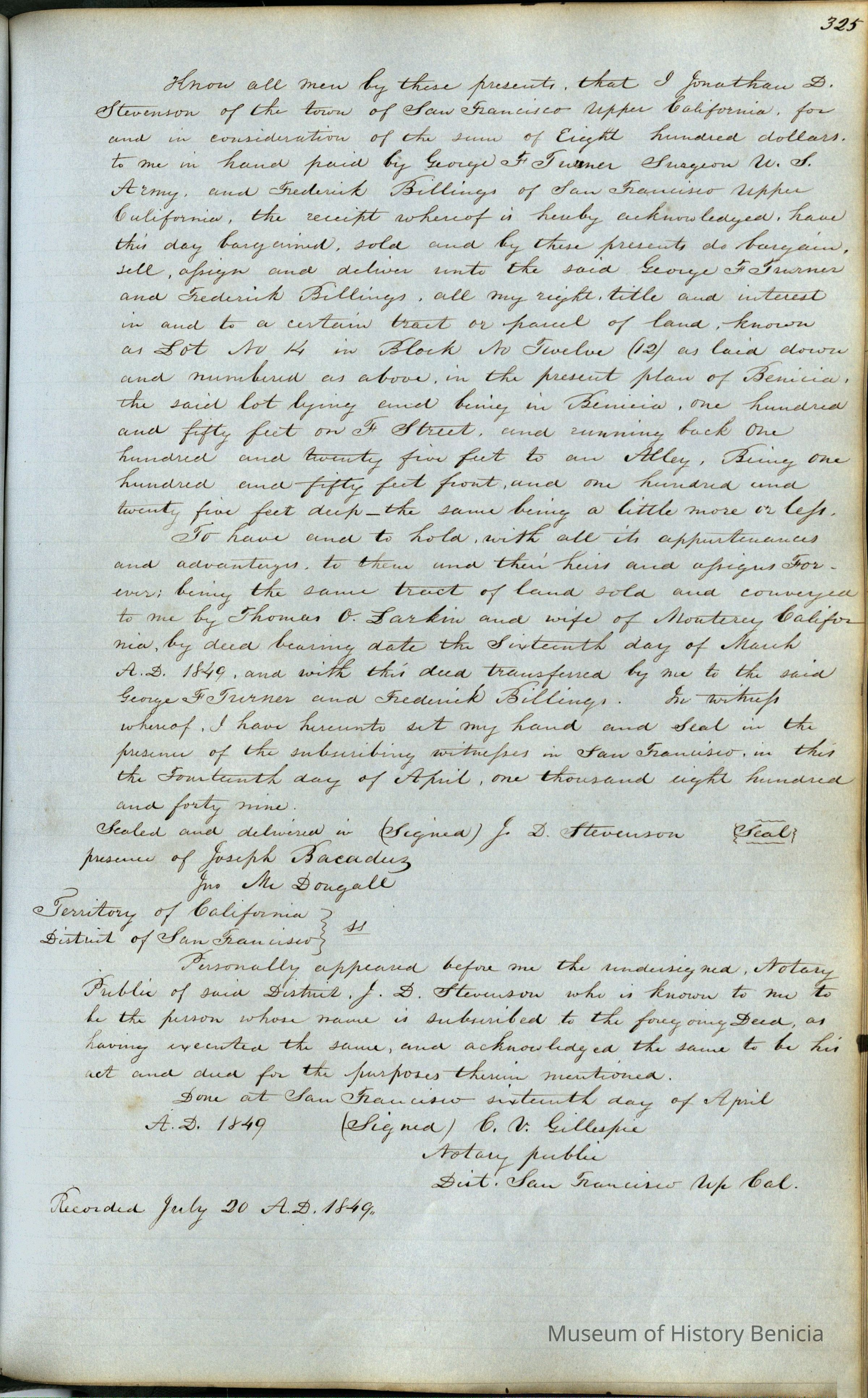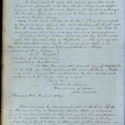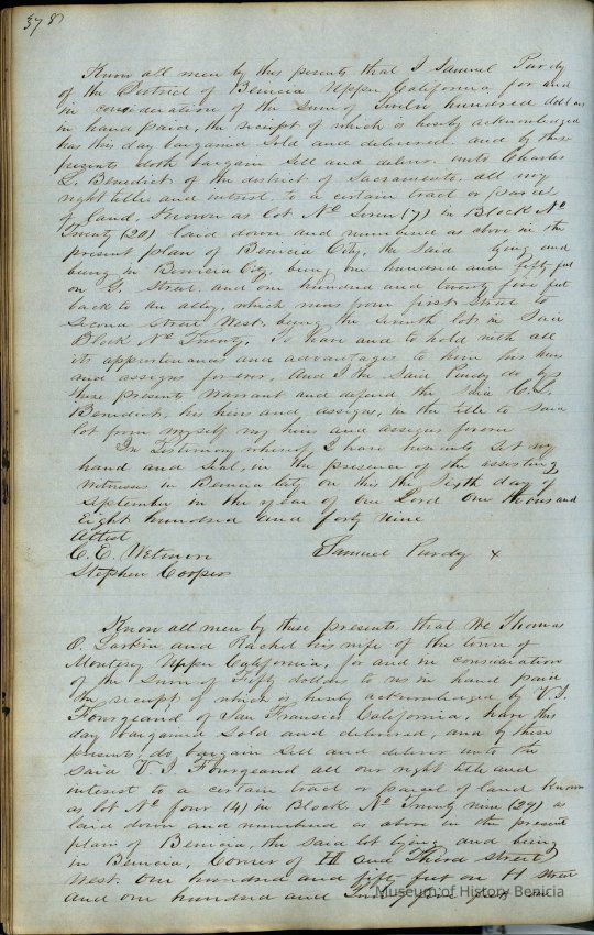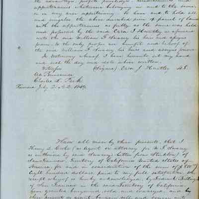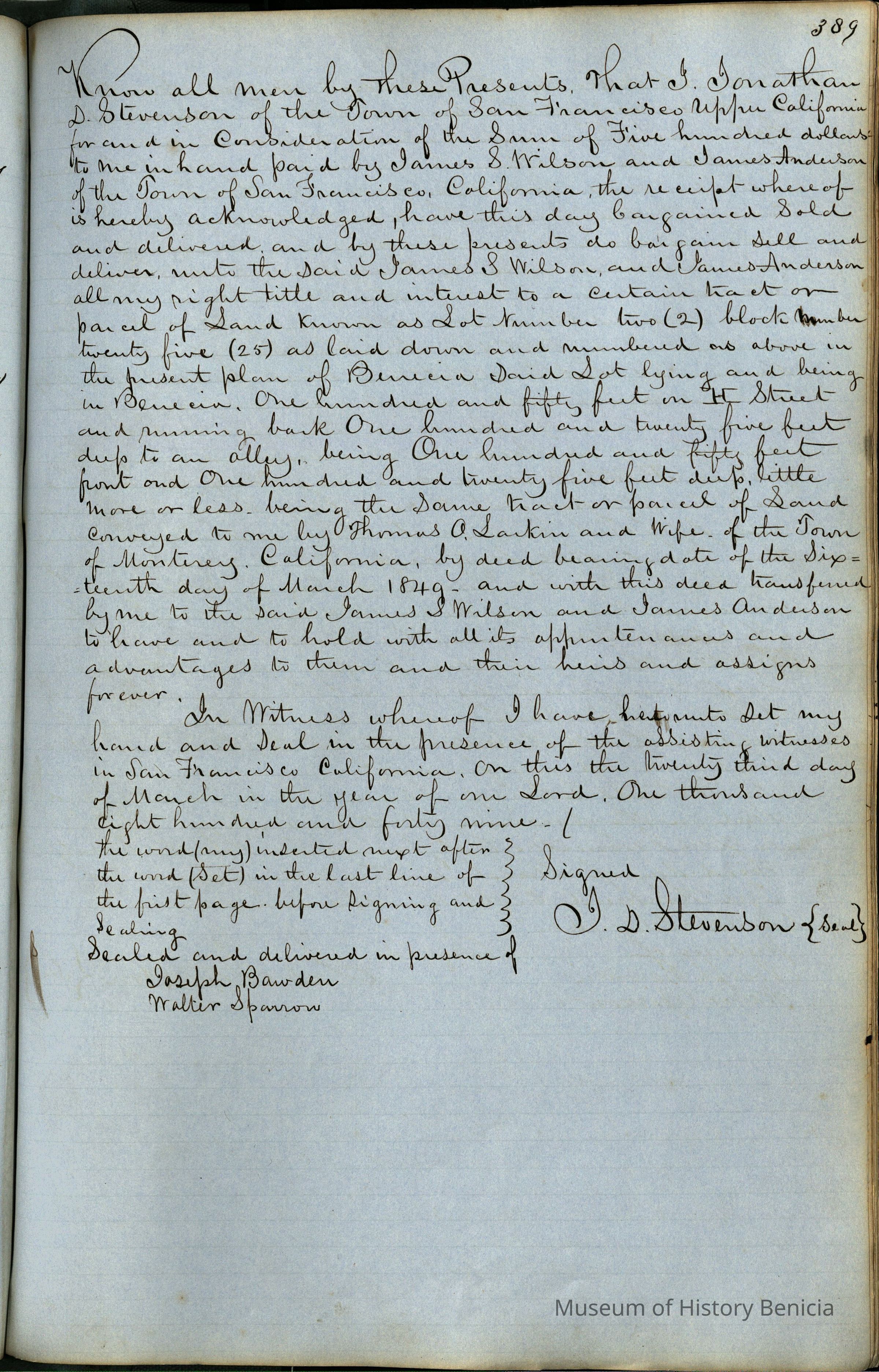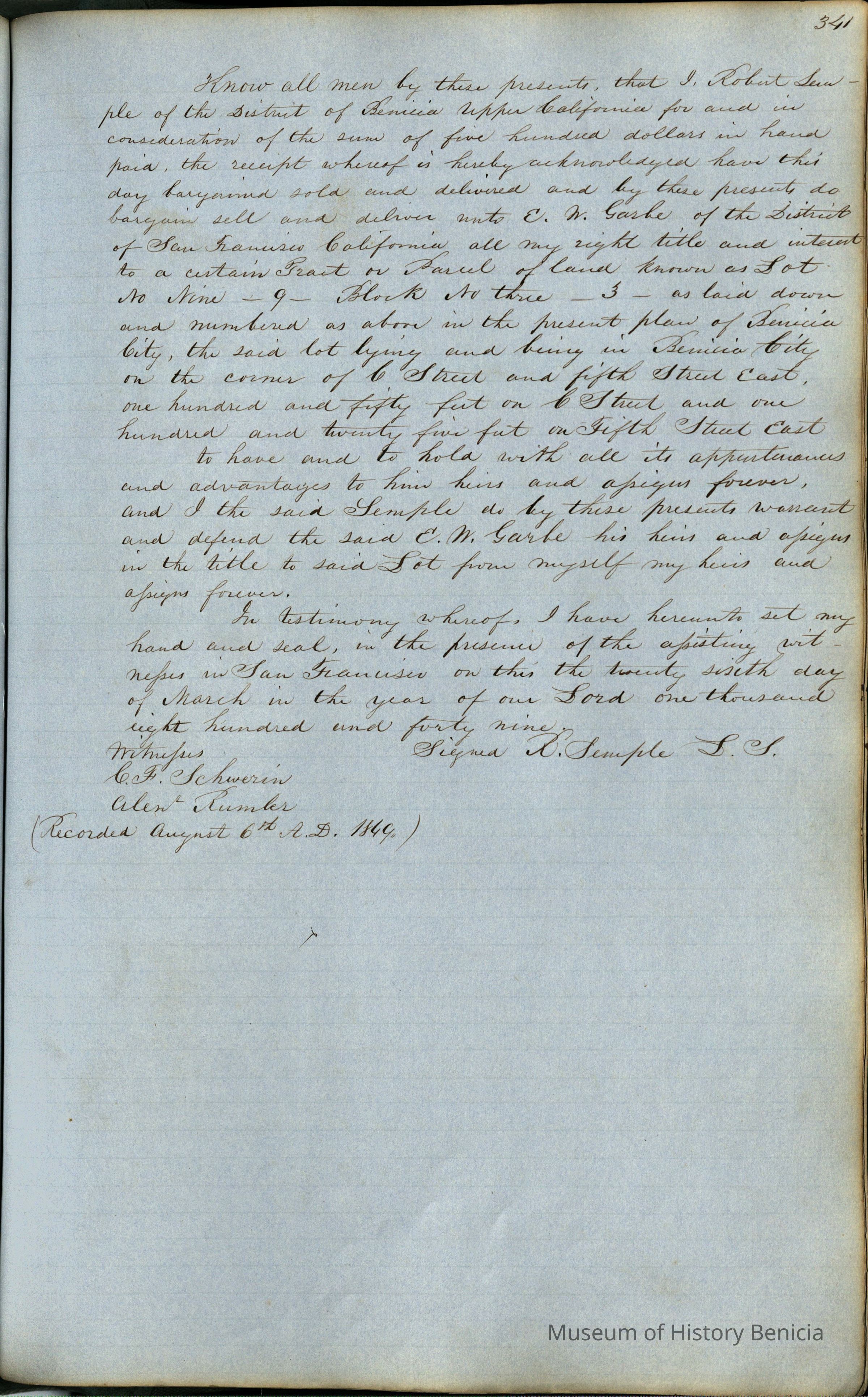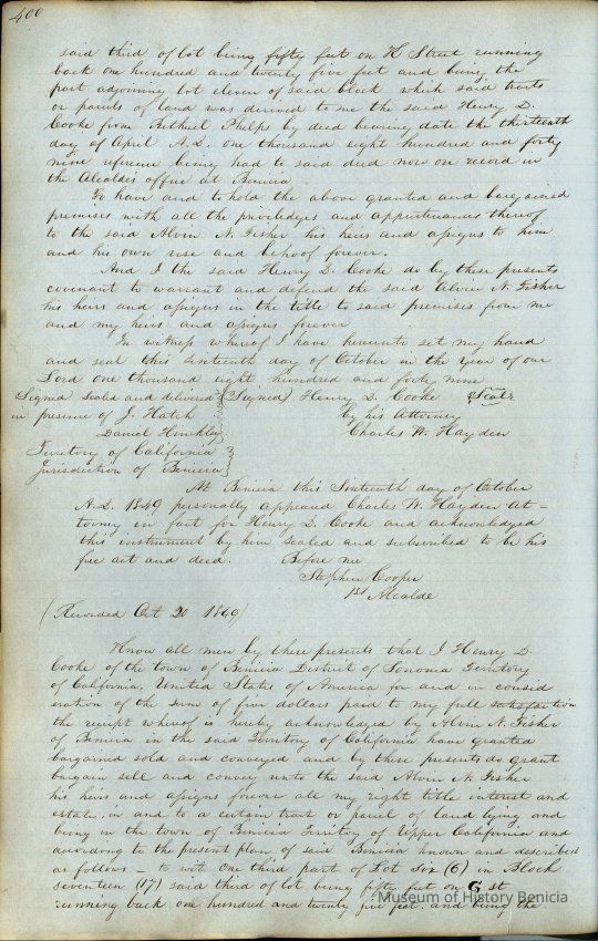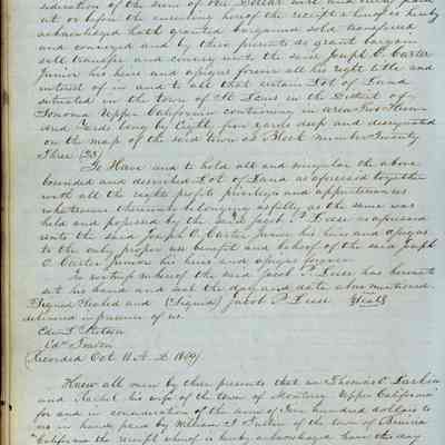 This journal/ledger contains the beginnings of Benicia including: lists and descriptions of first 12 houses in Benicia, a translation of the deed to General Vallejo by Manual Micheltorena, Governor of Calif. (1844); deed to Semple and Larkin by Vallejo (1847); deeds of properties sold by Semple and Larkin from 1847 - 1849