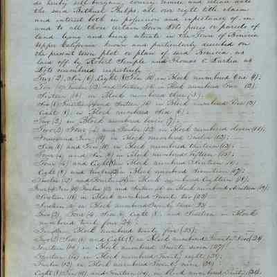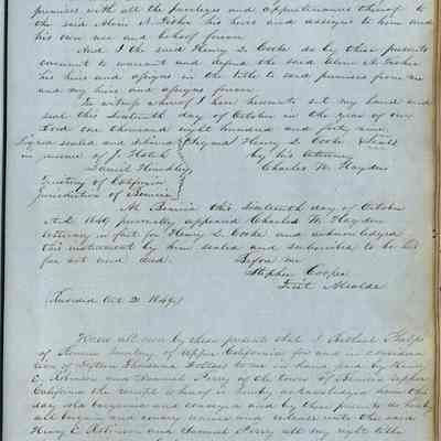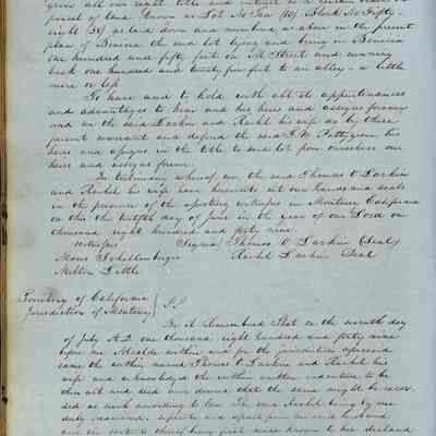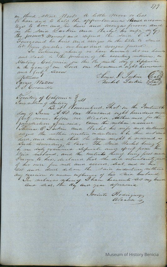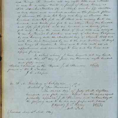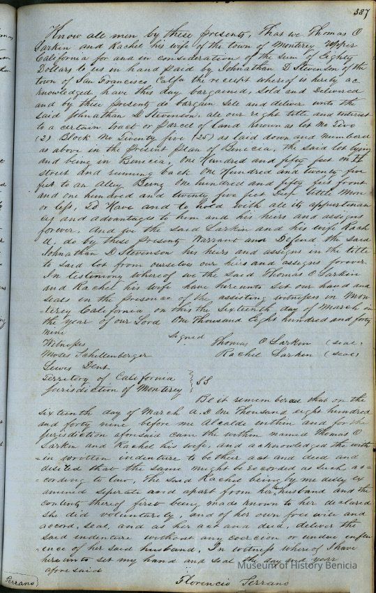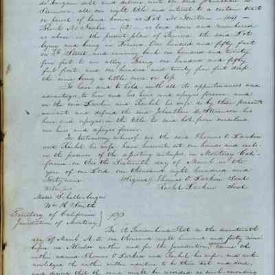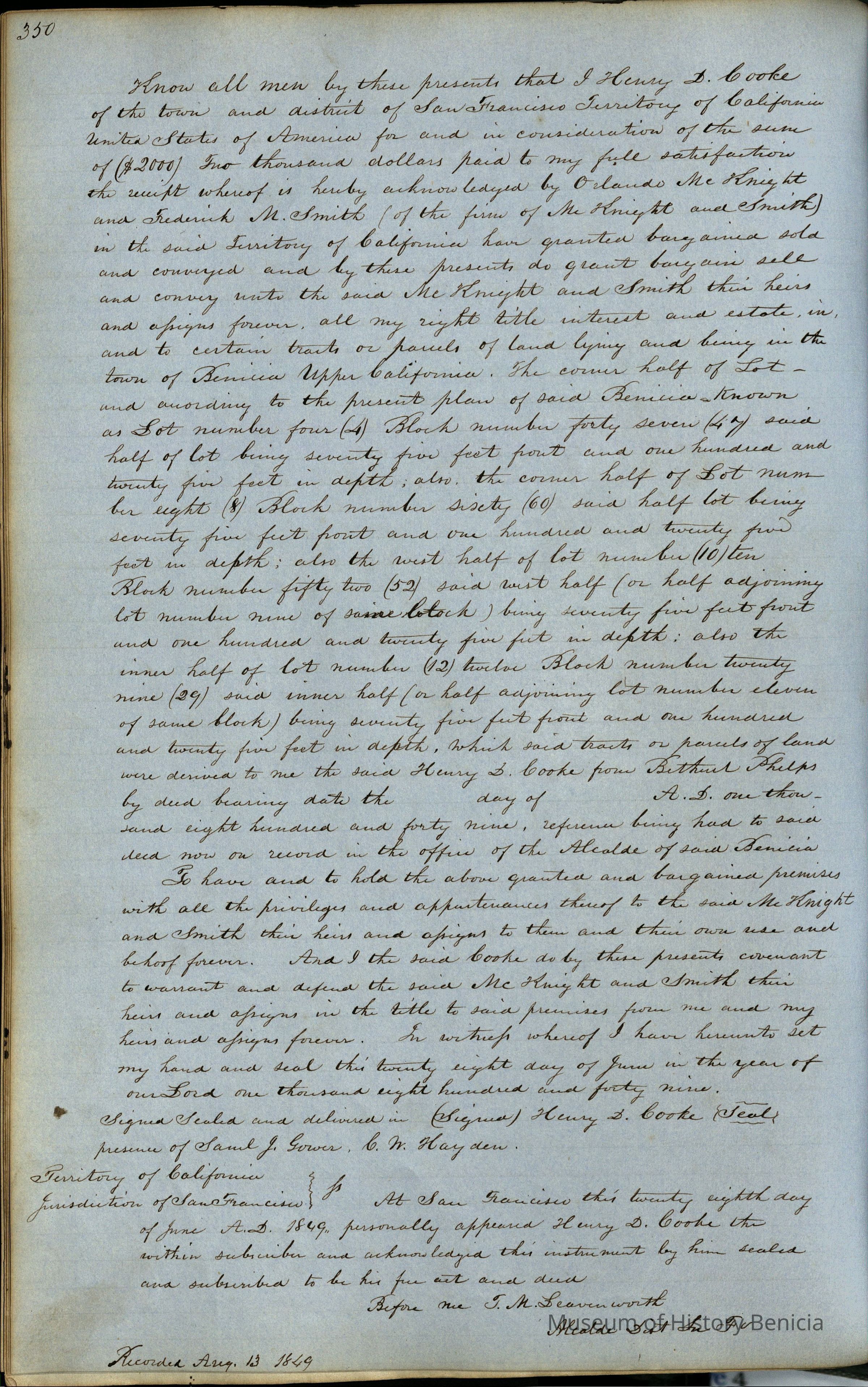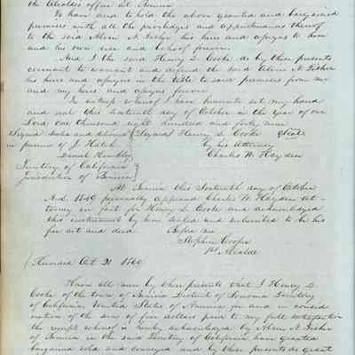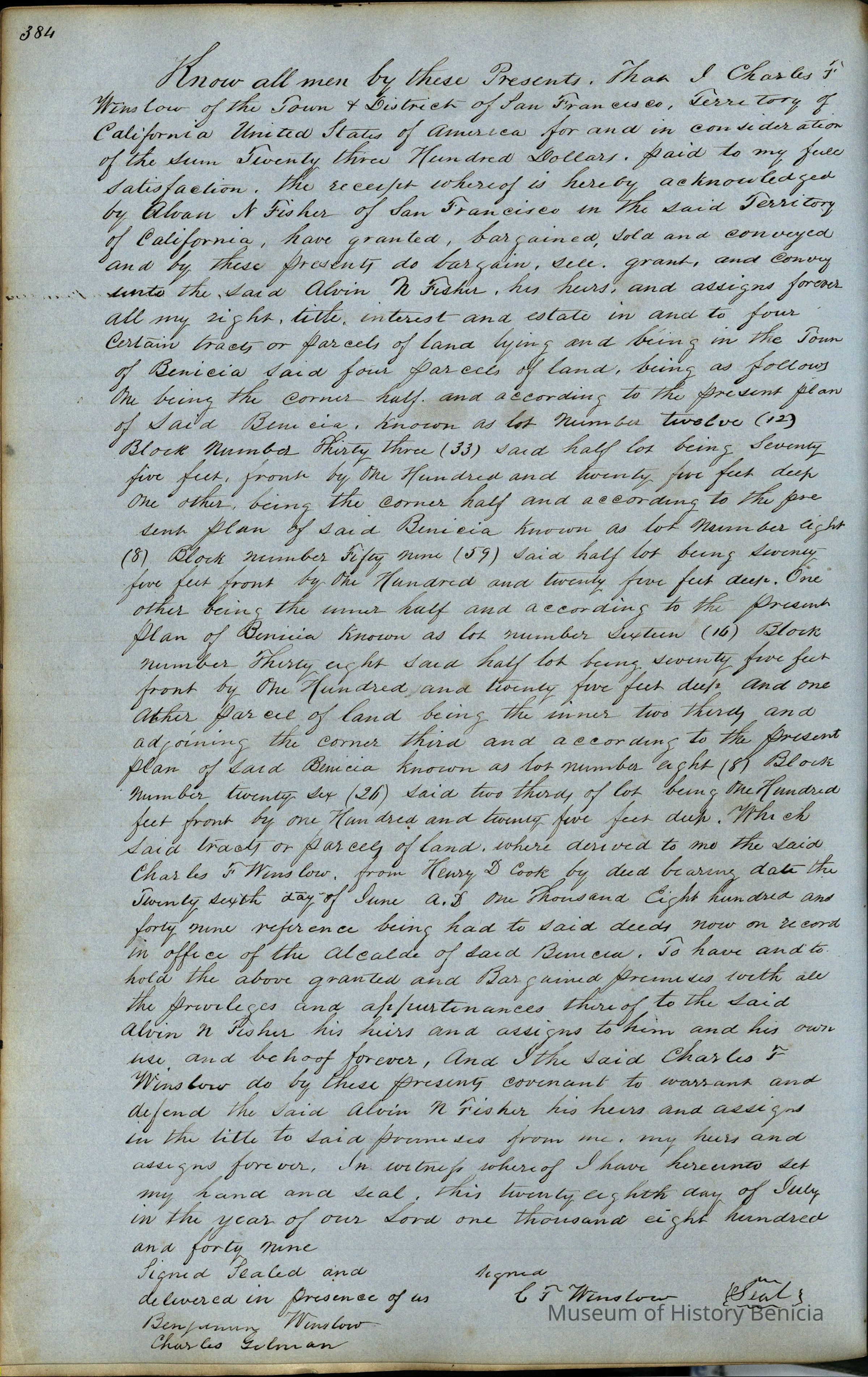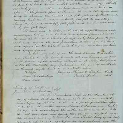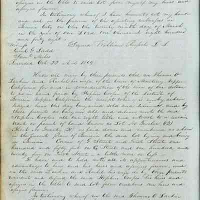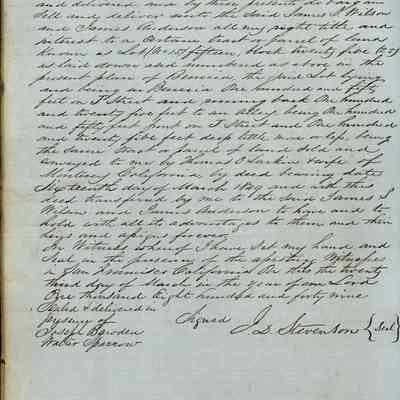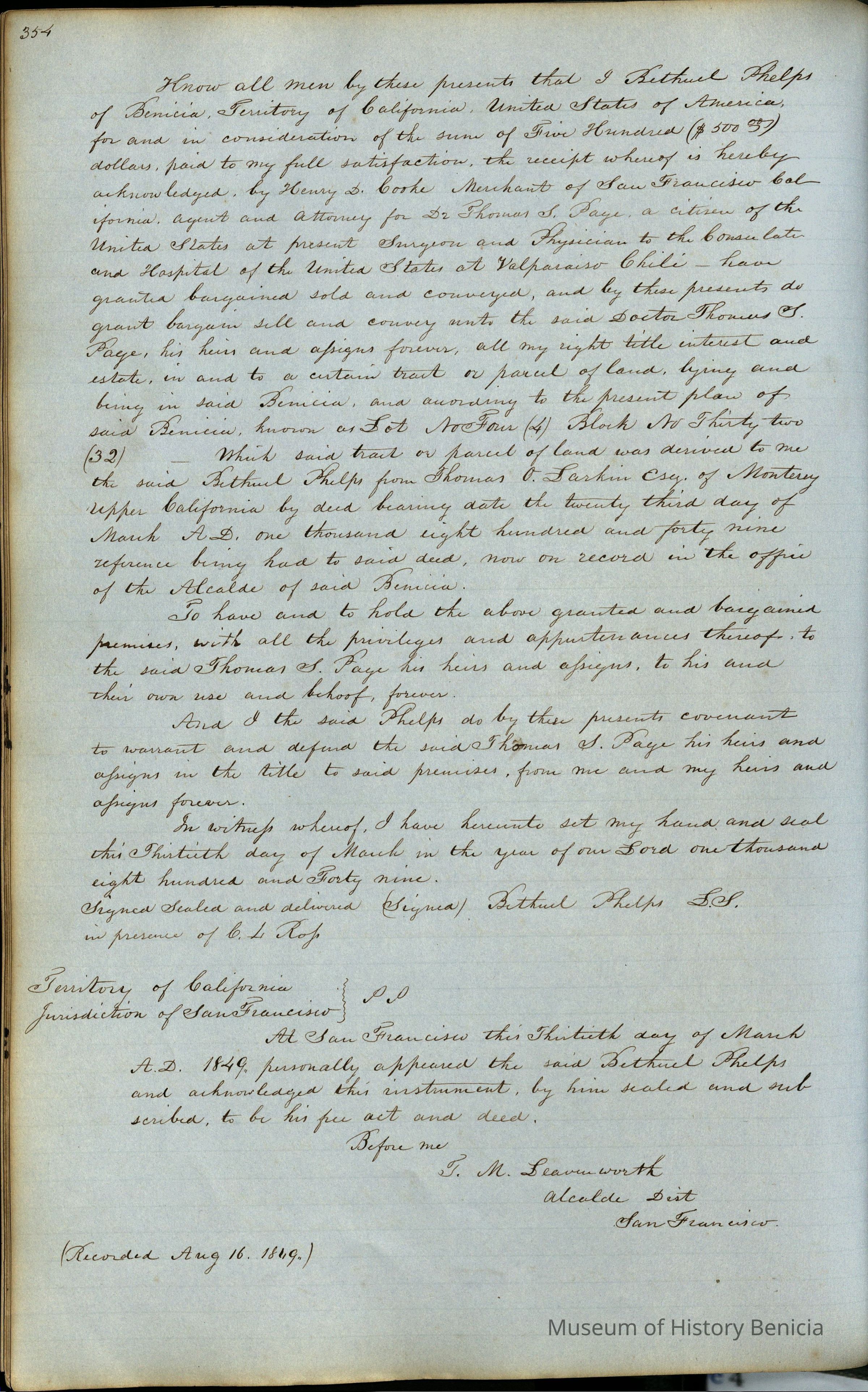 This journal/ledger contains the beginnings of Benicia including: lists and descriptions of first 12 houses in Benicia, a translation of the deed to General Vallejo by Manual Micheltorena, Governor of Calif. (1844); deed to Semple and Larkin by Vallejo (1847); deeds of properties sold by Semple and Larkin from 1847 - 1849