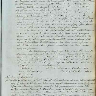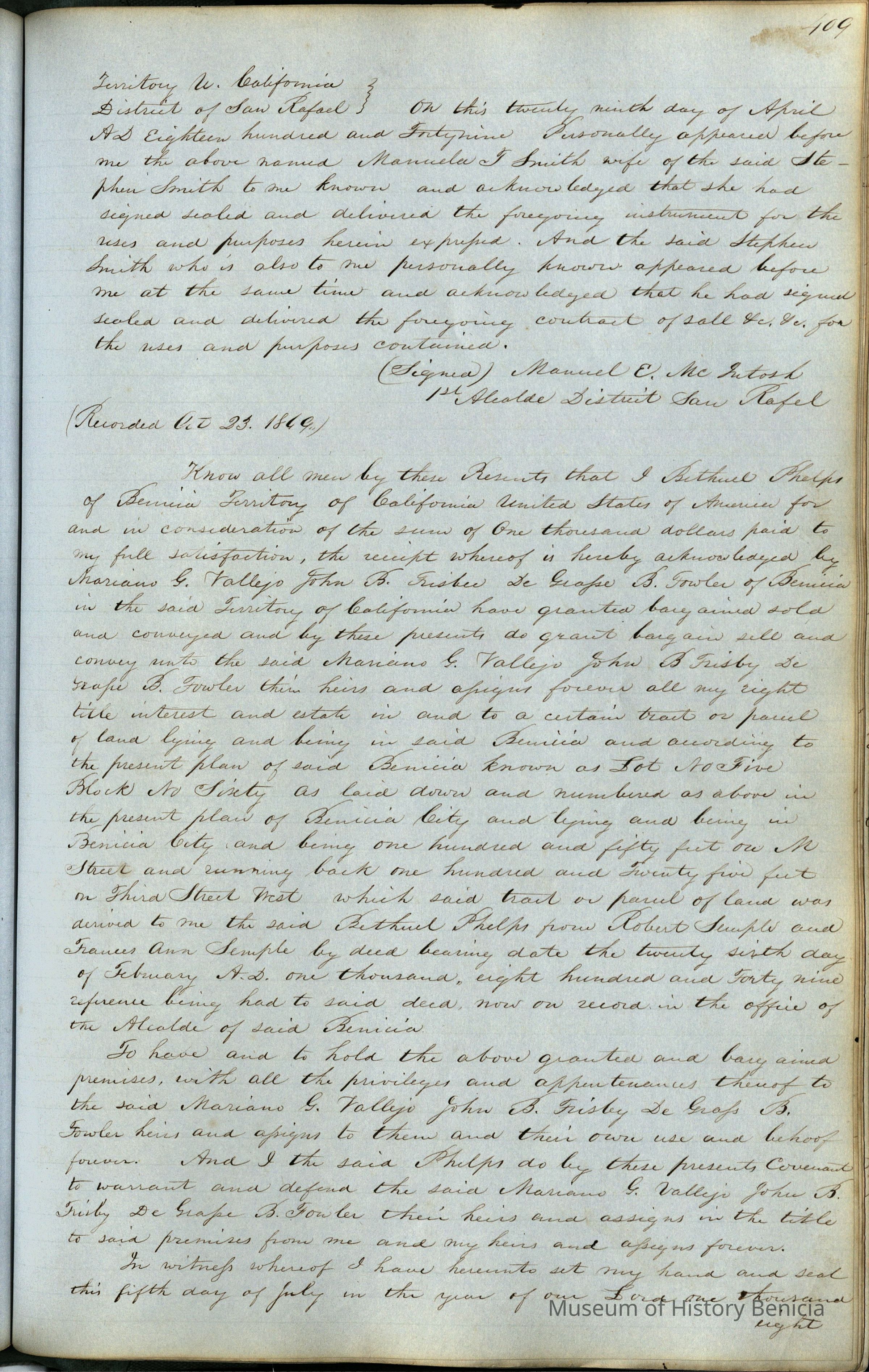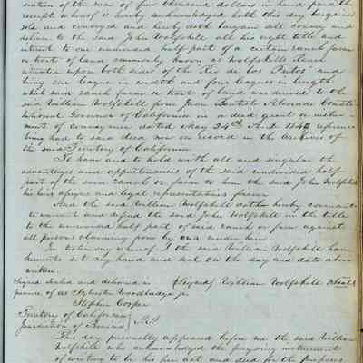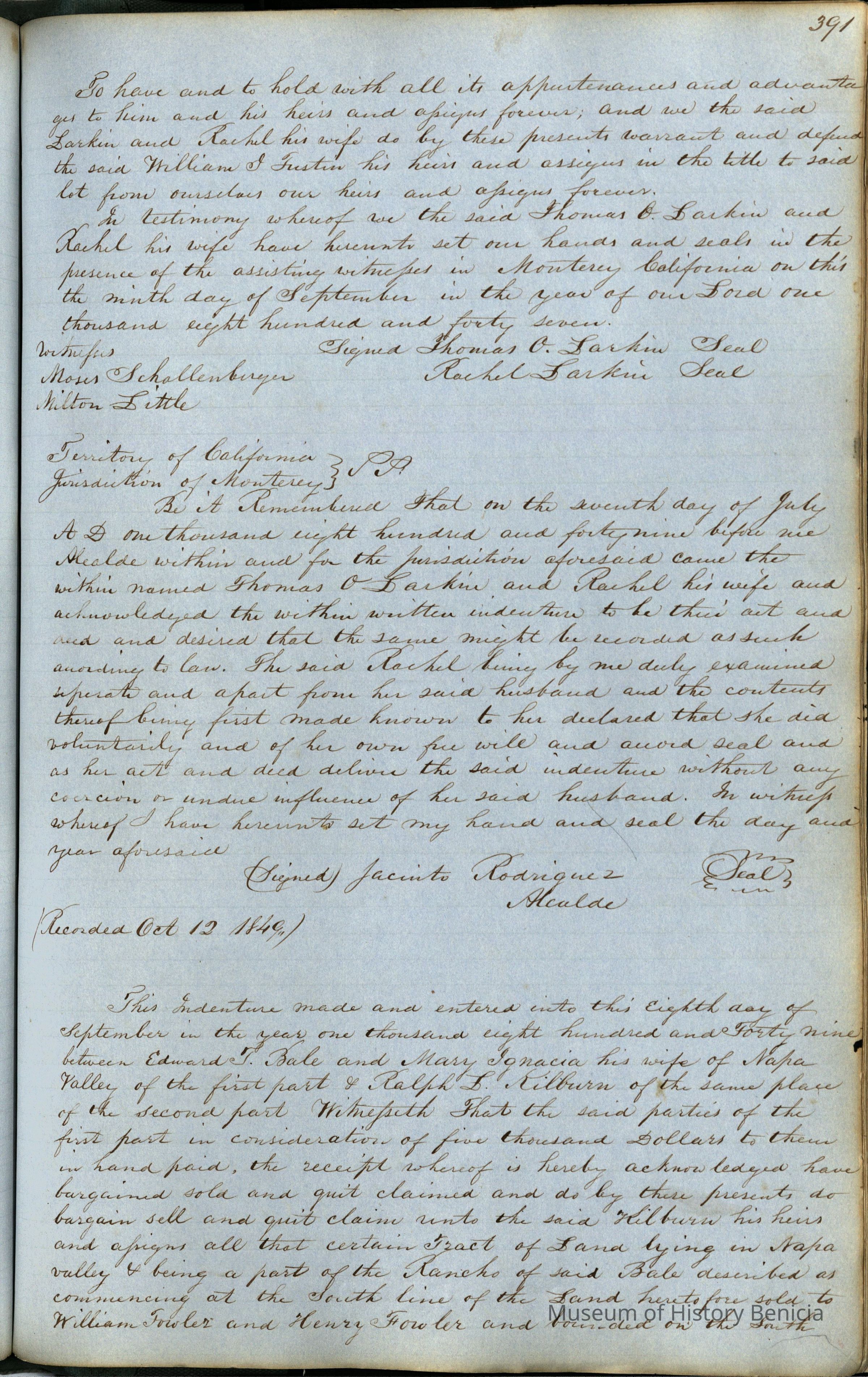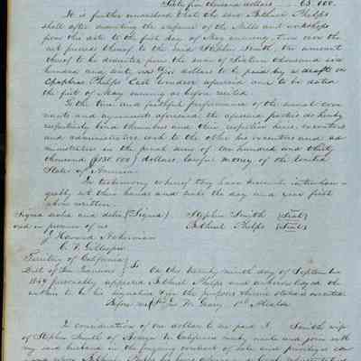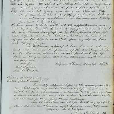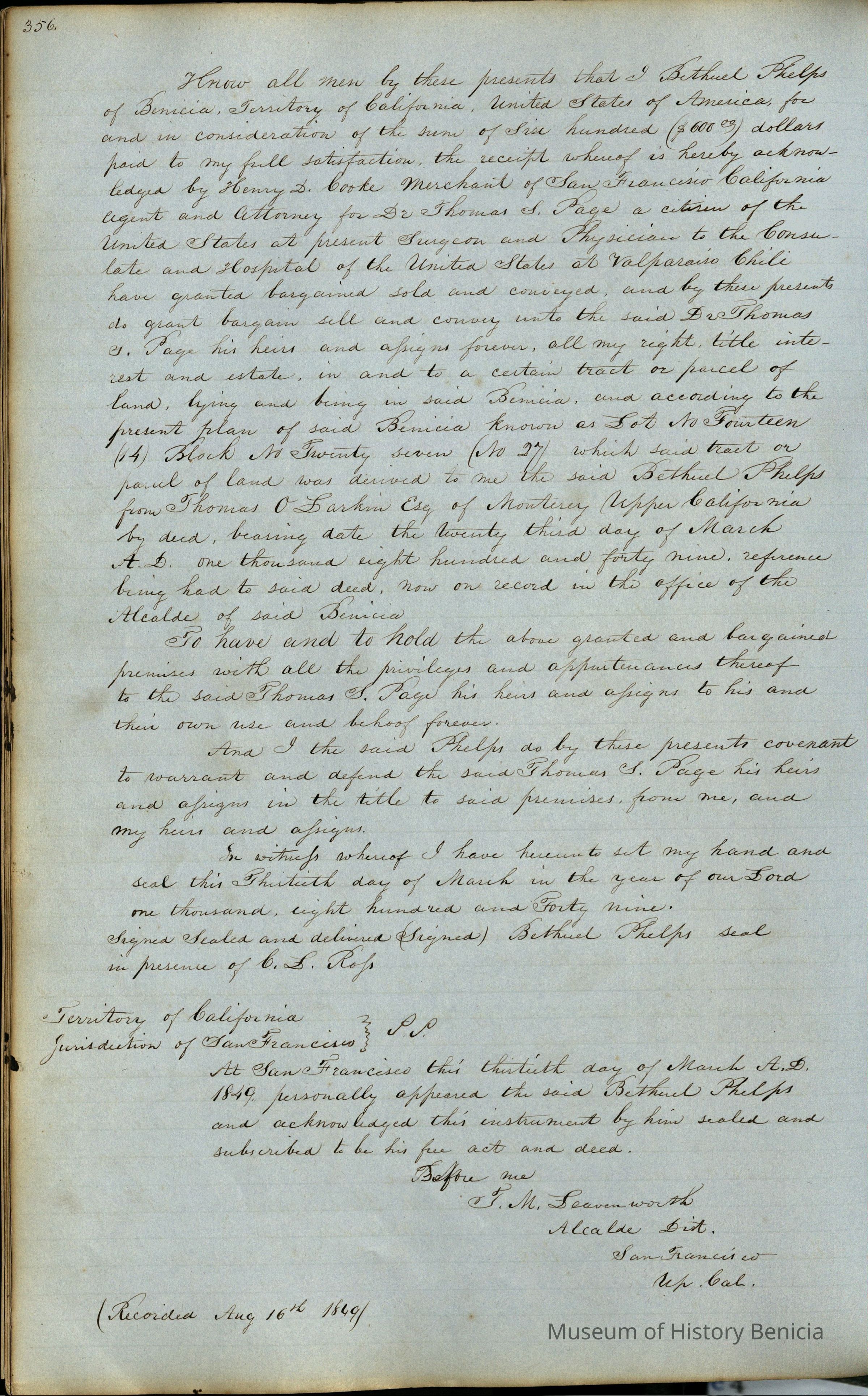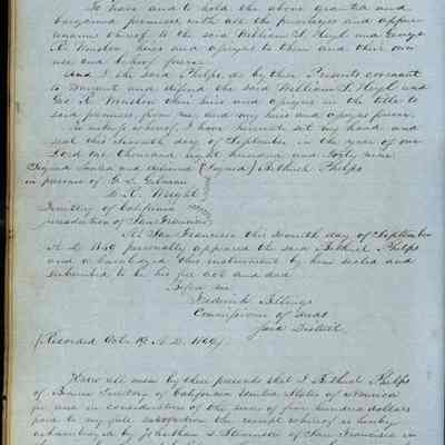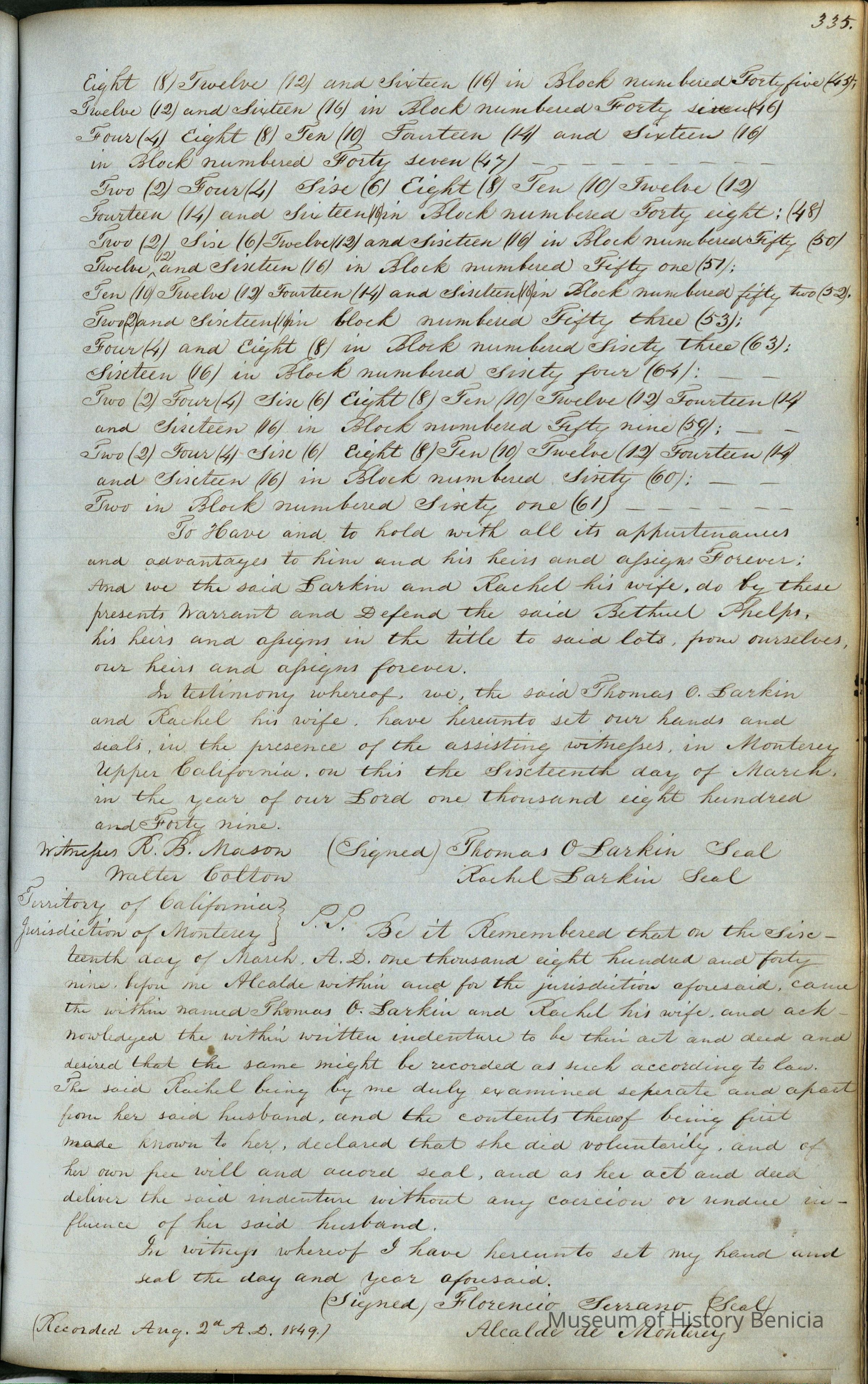 This journal/ledger contains the beginnings of Benicia including: lists and descriptions of first 12 houses in Benicia, a translation of the deed to General Vallejo by Manual Micheltorena, Governor of Calif. (1844); deed to Semple and Larkin by Vallejo (1847); deeds of properties sold by Semple and Larkin from 1847 - 1849