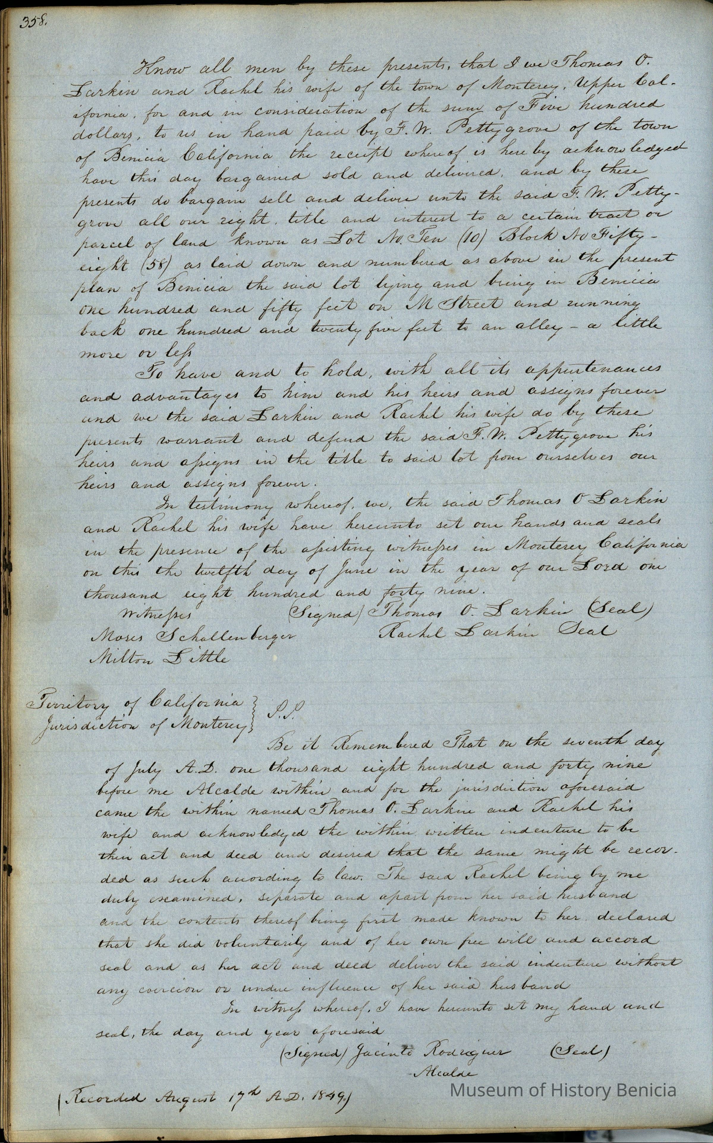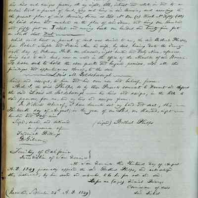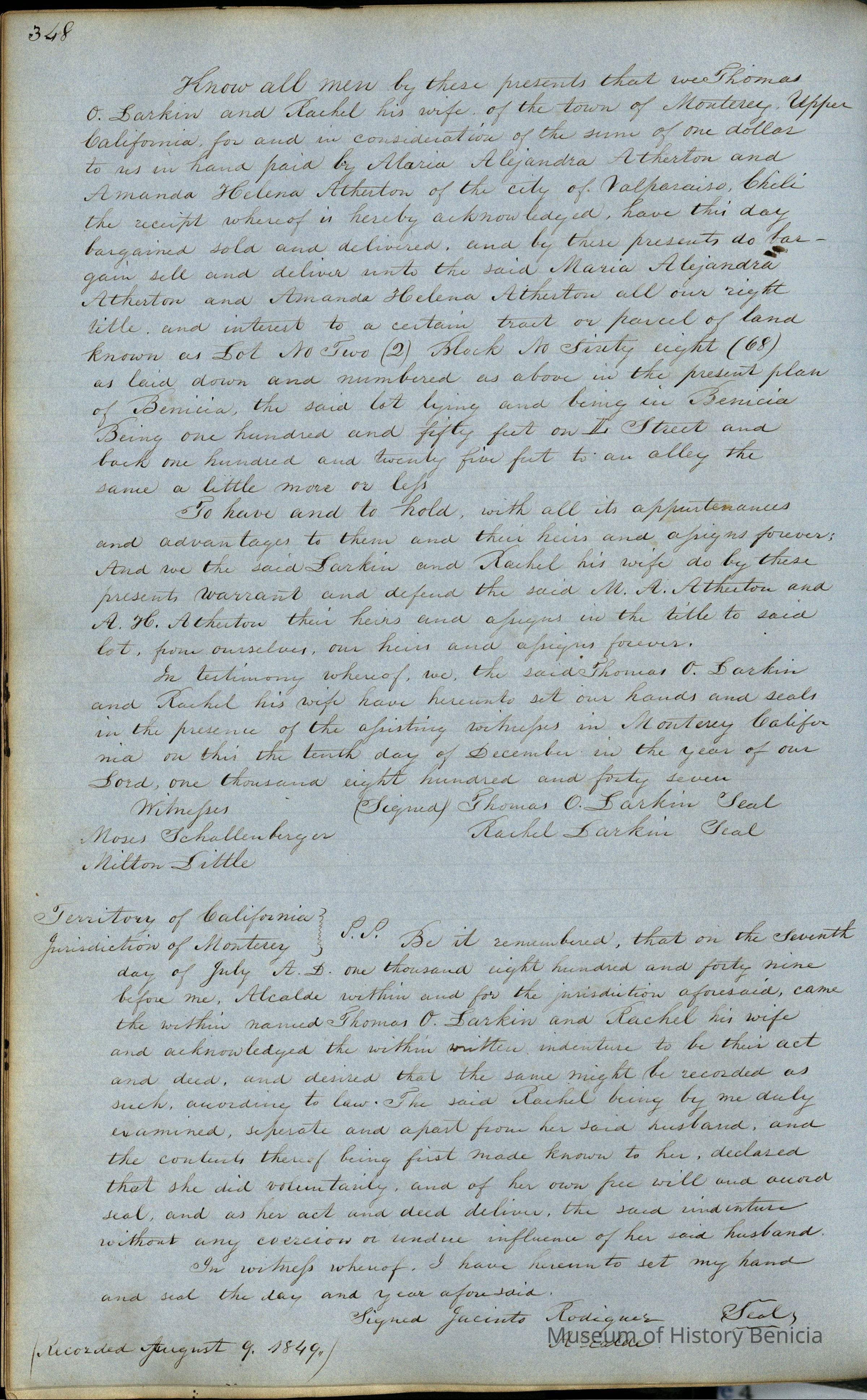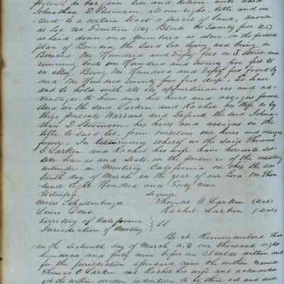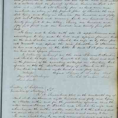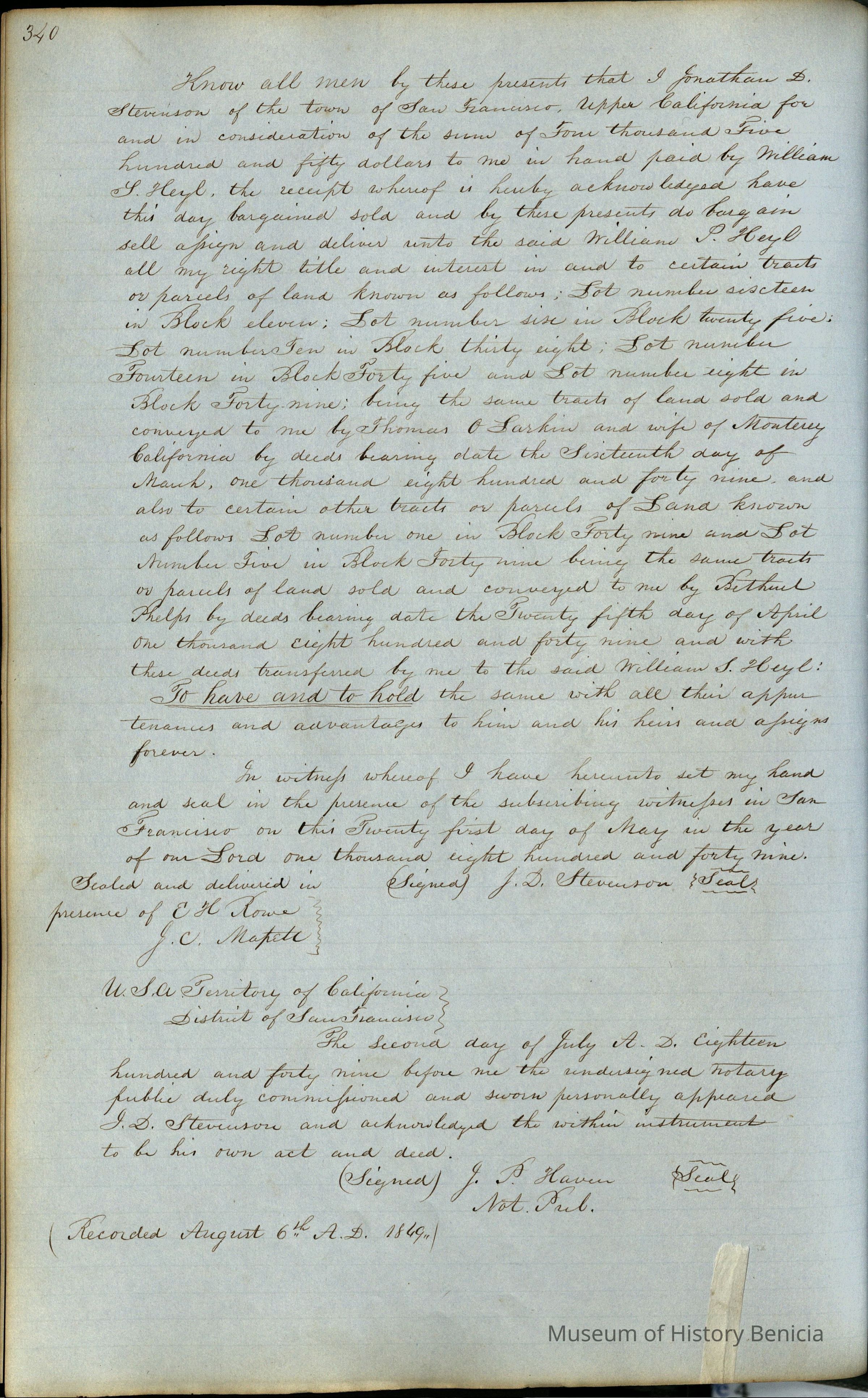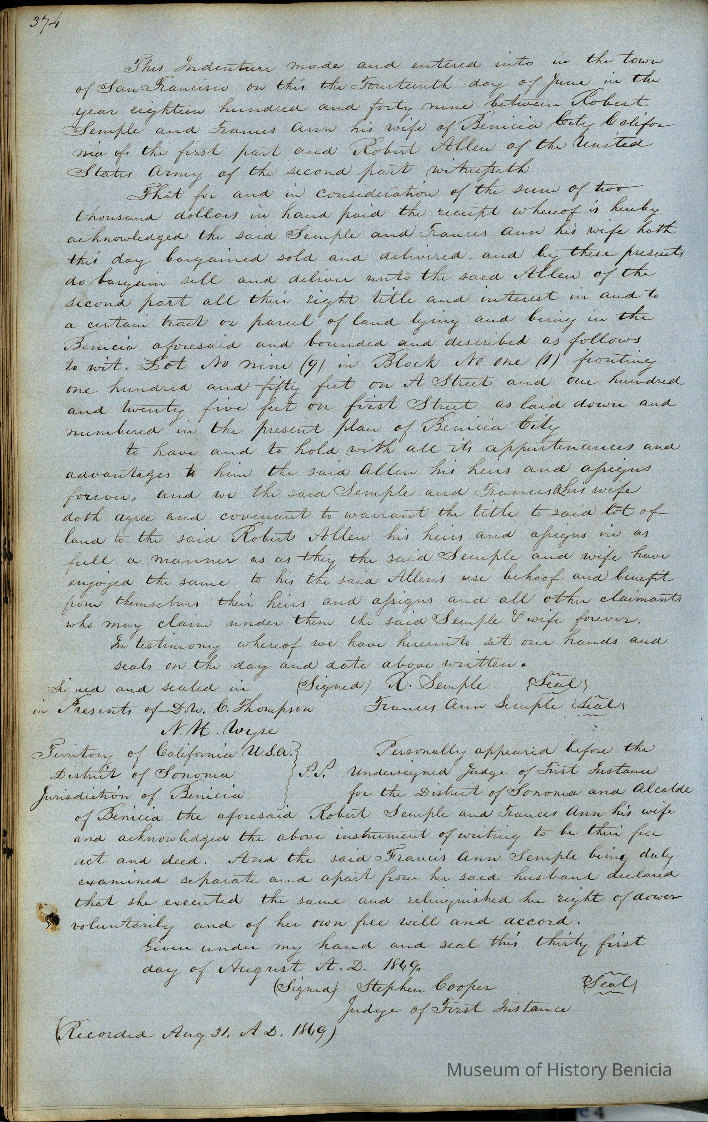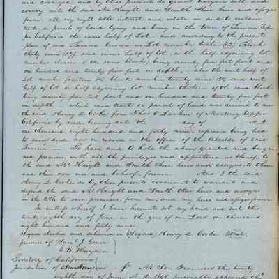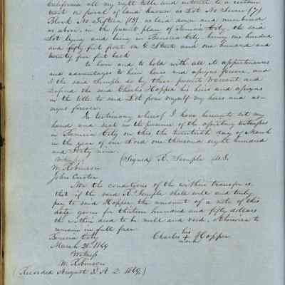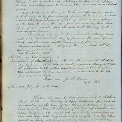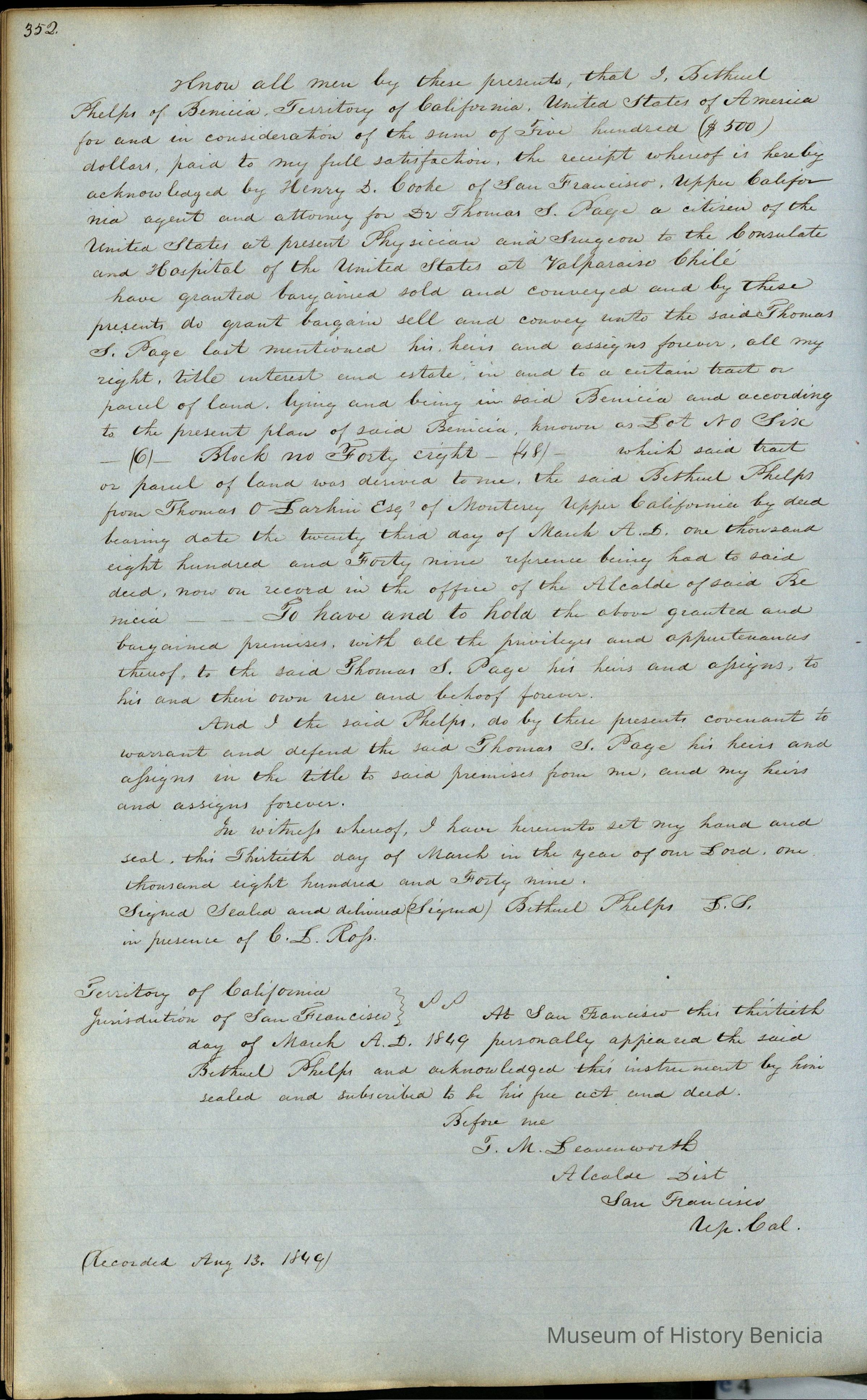 This journal/ledger contains the beginnings of Benicia including: lists and descriptions of first 12 houses in Benicia, a translation of the deed to General Vallejo by Manual Micheltorena, Governor of Calif. (1844); deed to Semple and Larkin by Vallejo (1847); deeds of properties sold by Semple and Larkin from 1847 - 1849