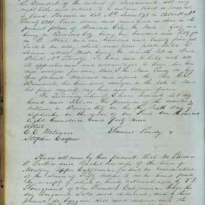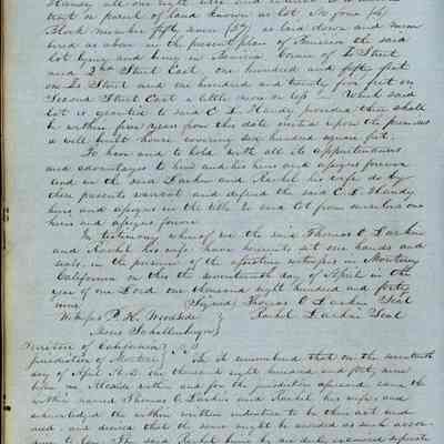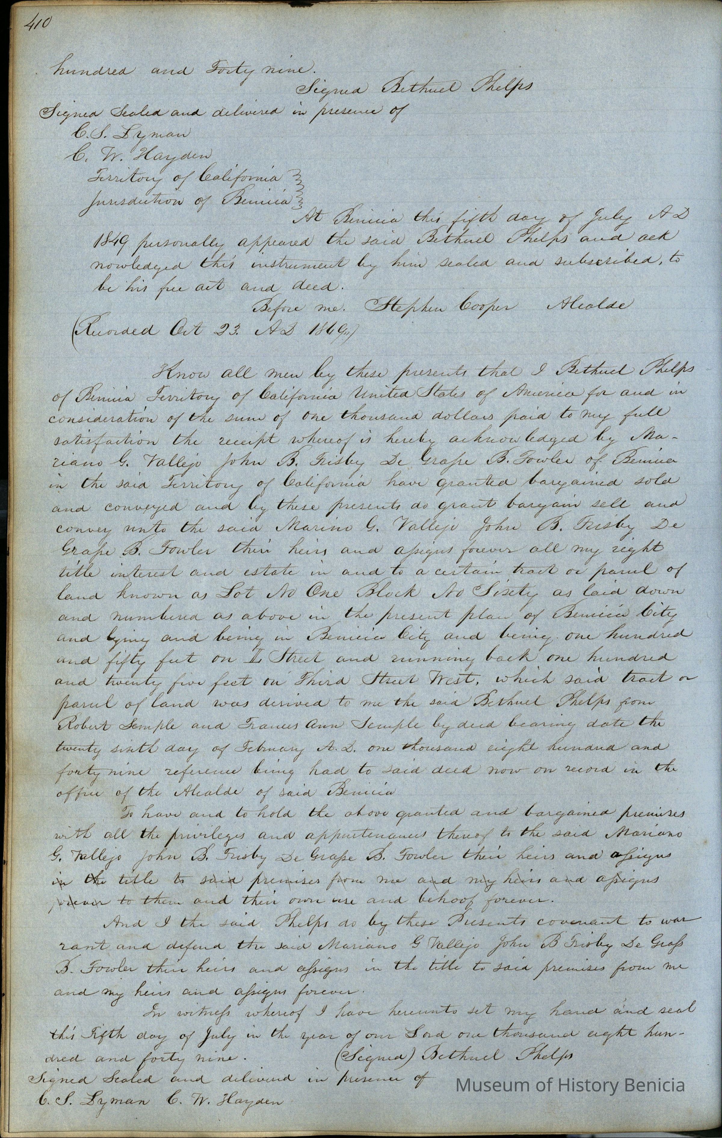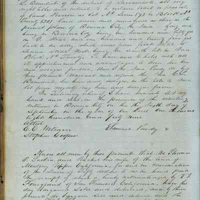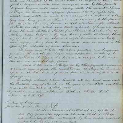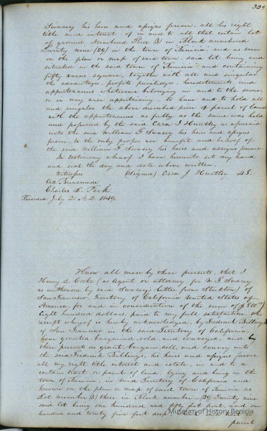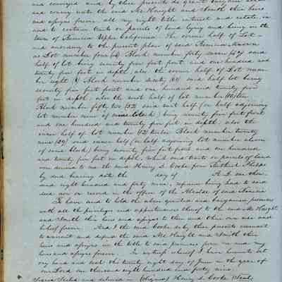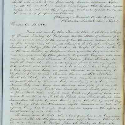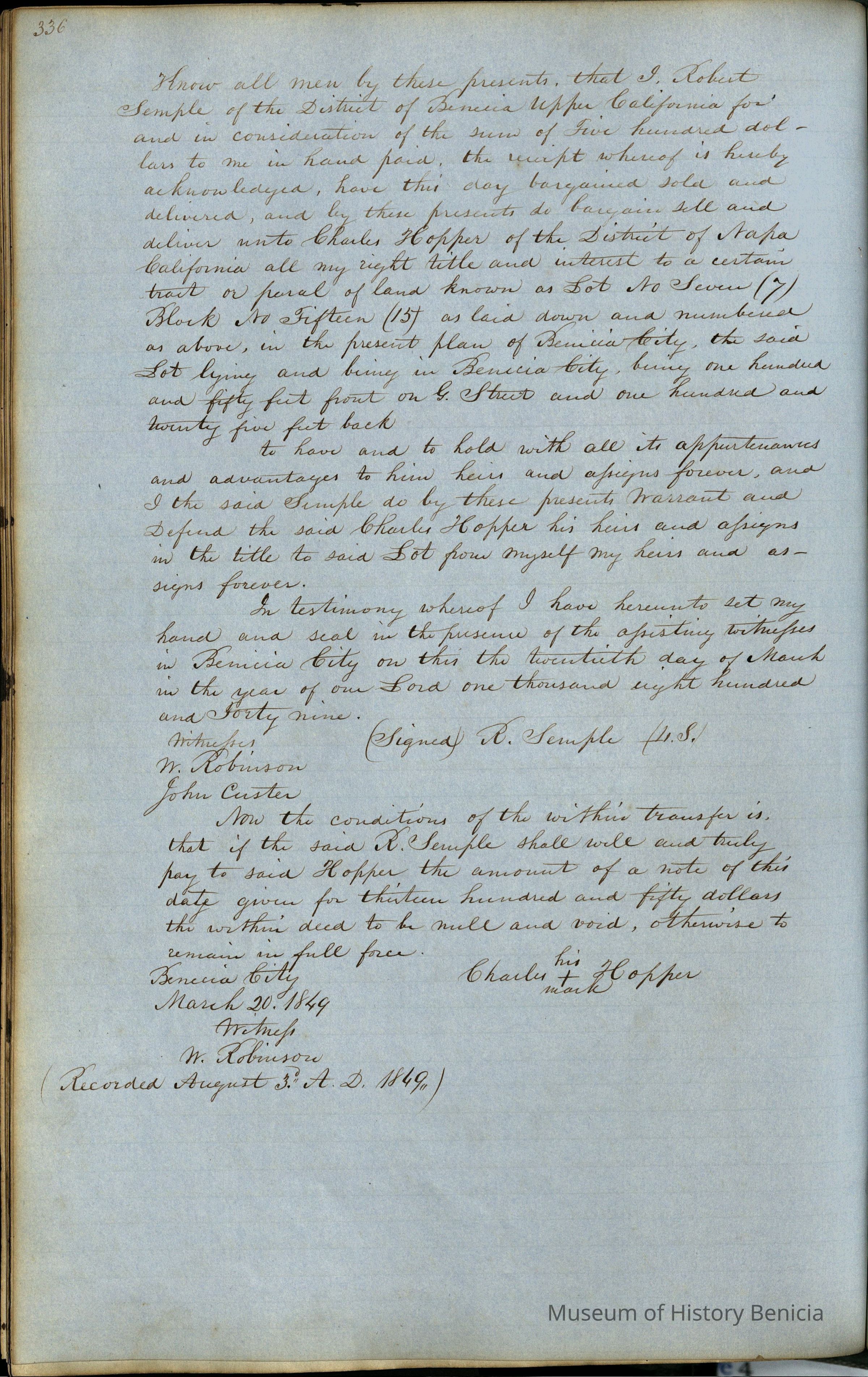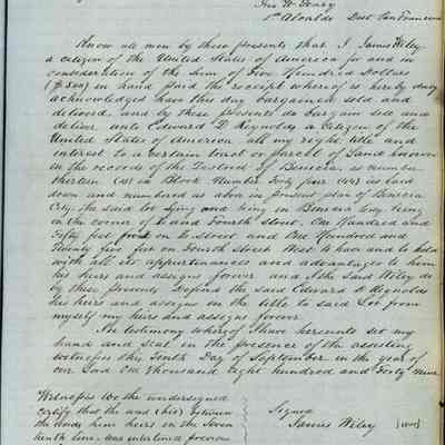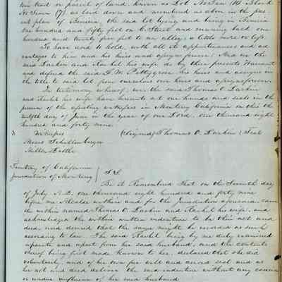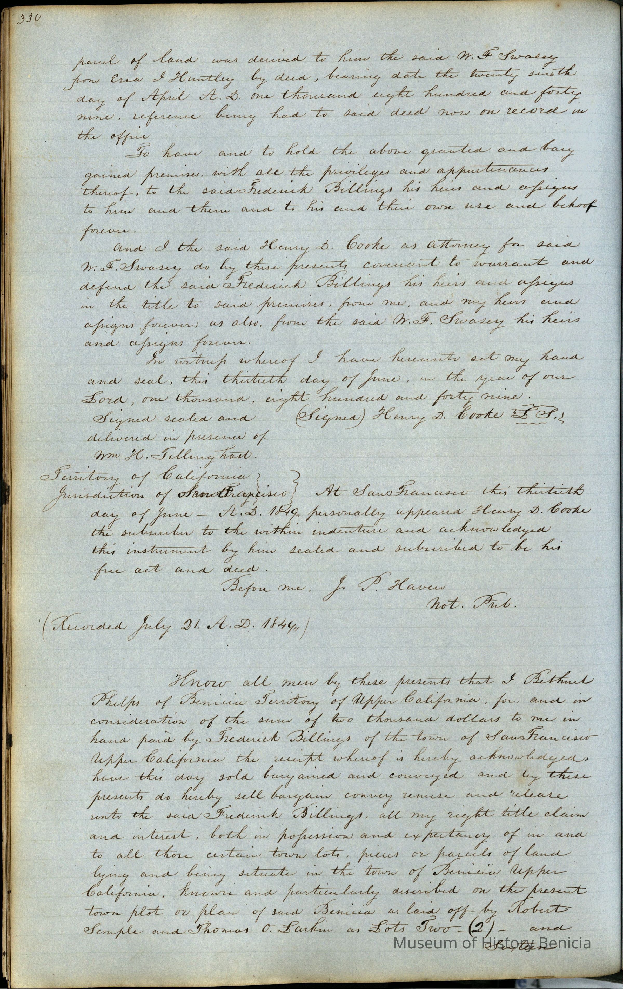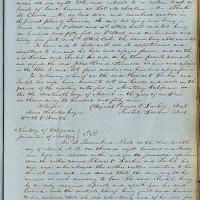 This journal/ledger contains the beginnings of Benicia including: lists and descriptions of first 12 houses in Benicia, a translation of the deed to General Vallejo by Manual Micheltorena, Governor of Calif. (1844); deed to Semple and Larkin by Vallejo (1847); deeds of properties sold by Semple and Larkin from 1847 - 1849